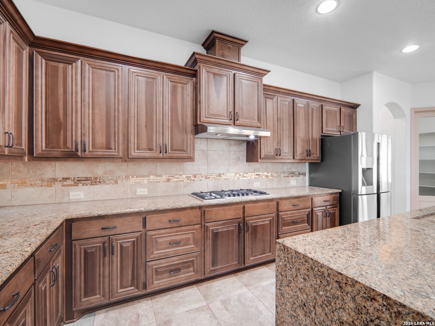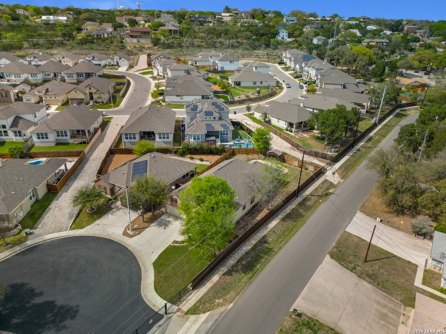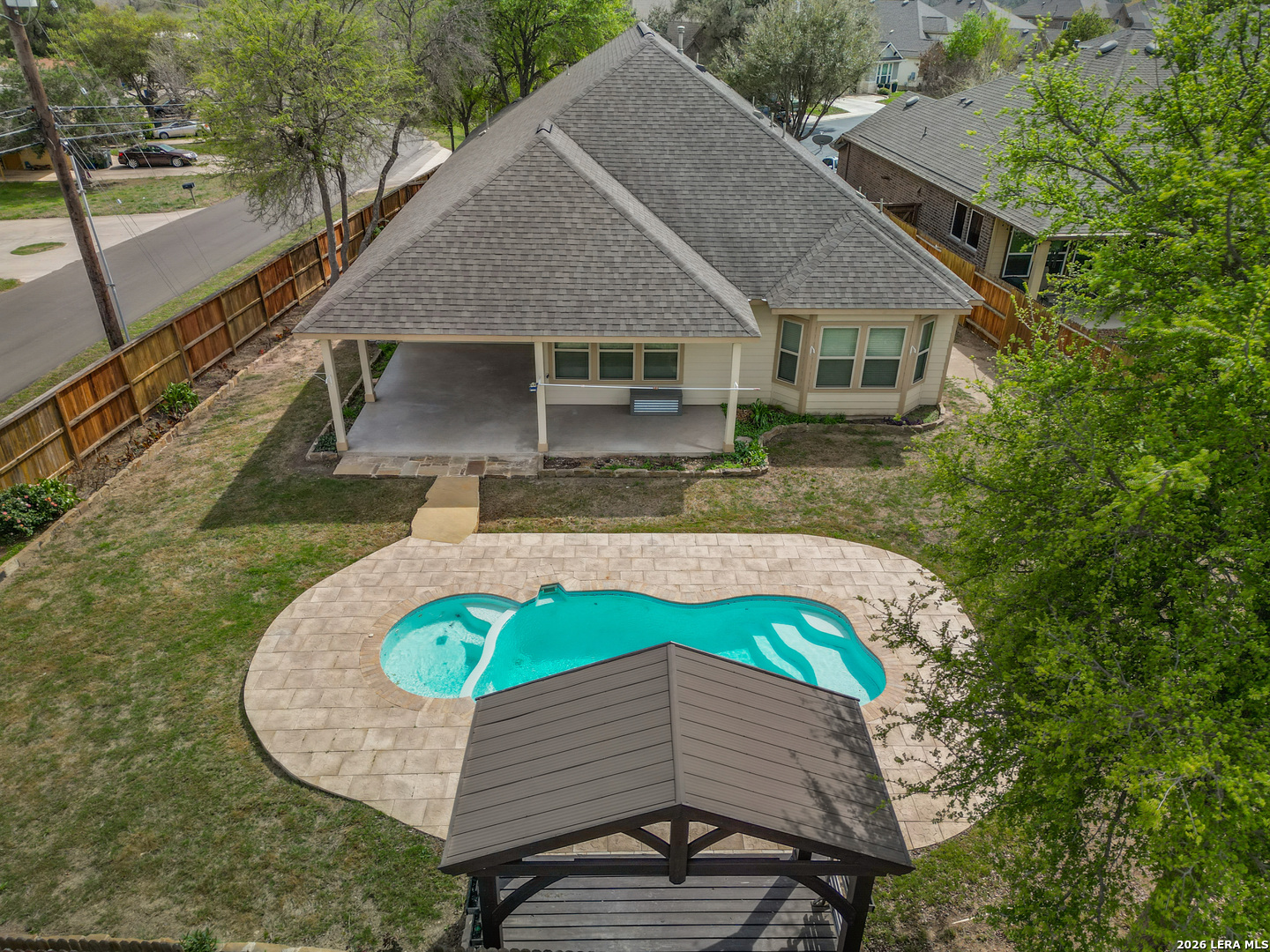 Gorgeous 1 story 4/3 with pool on corner cul-de-sac lot in small gated community. Walking distance to Dog Park and 10 min drive to HEB, restaurants and shopping. Lots of light on this open floor plan, high ceilings, freshly painted interior, gourmet kitchen with gas cooking, wall over and refrigerator. There is a huge island, ample cabinet and counter space, nicely sized bedrooms and custom closet systems in all closets. Large utility room with cabinets, counter space and hanging area. Two eating areas, spacious study and dual closets in the primary offer space for everyone. Large covered patio stubbed for gas grilling and a pergola overlook the backyard and pool, perfect for entertaining. Home has a 1 year maintenance warranty and remainder of Builder structural warranty. Move in ready, schedule to see today!