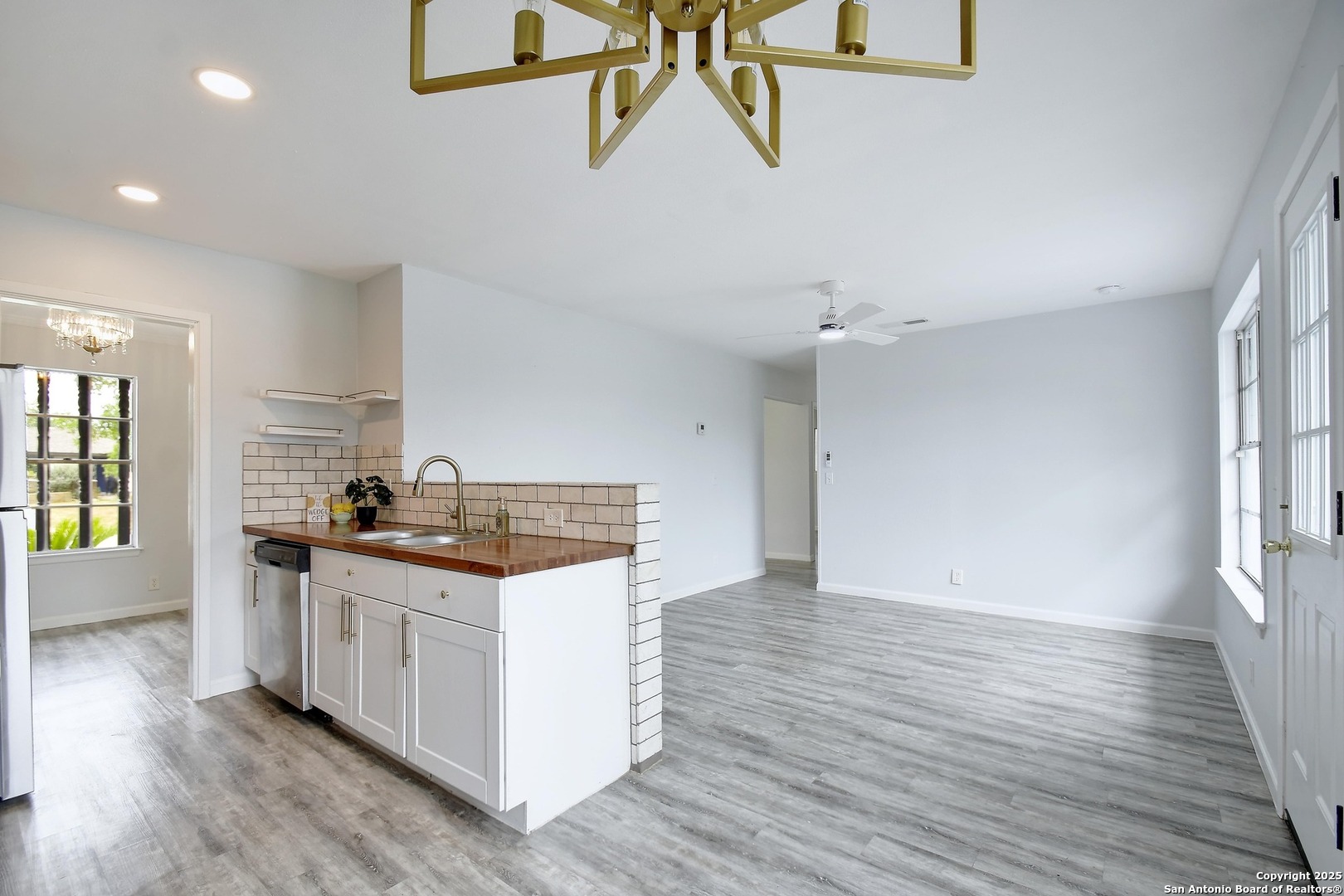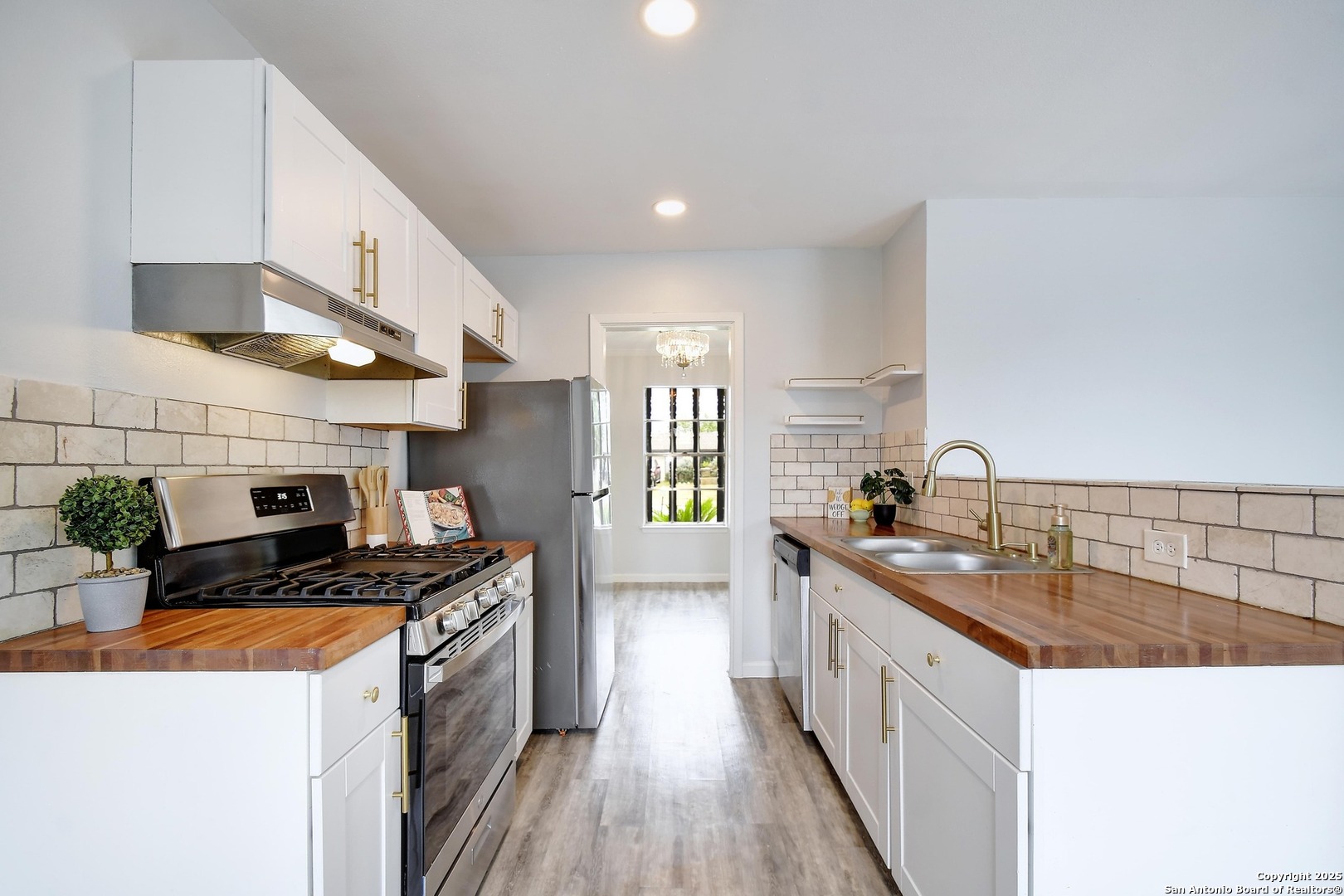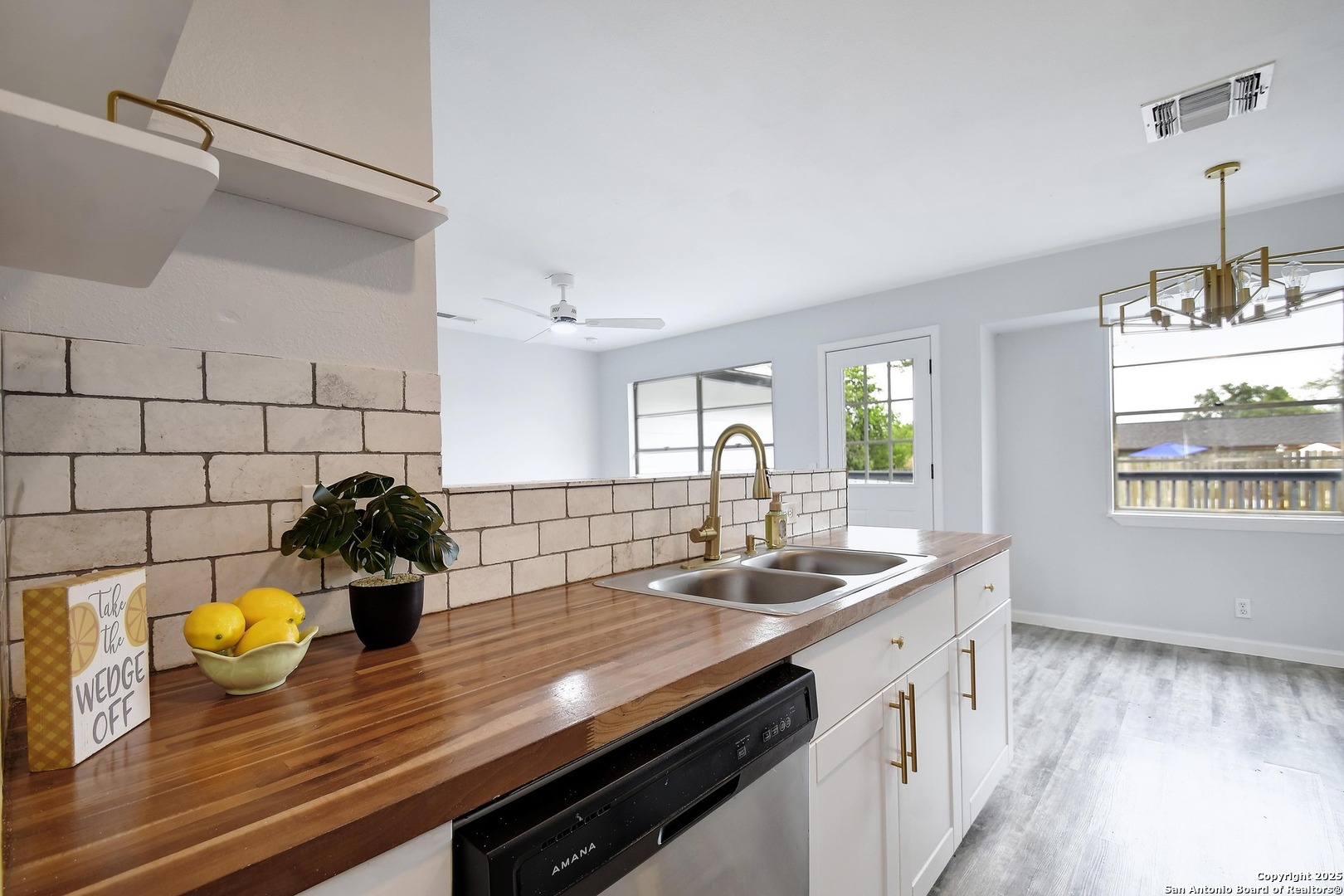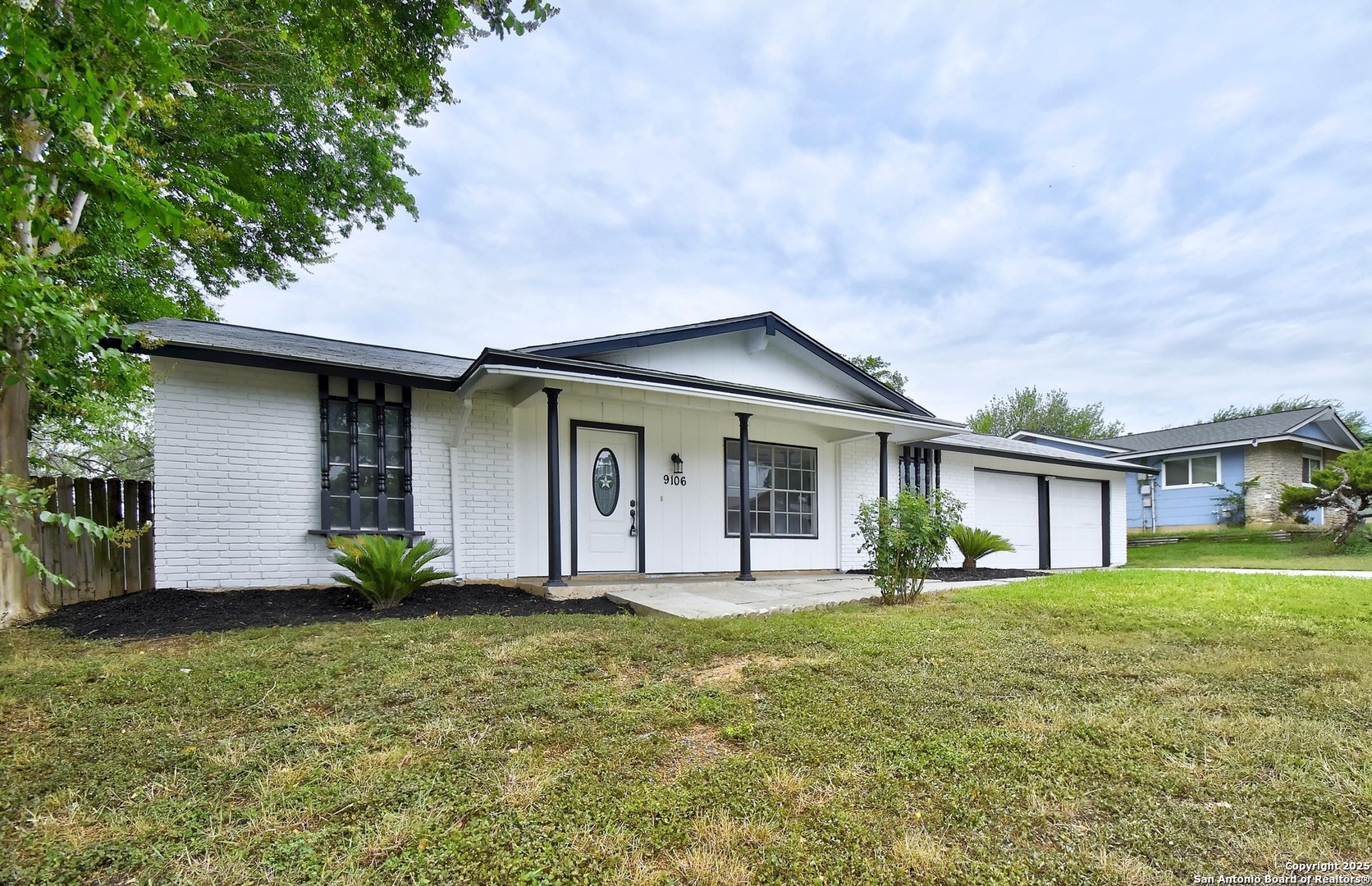 This beautifully designed one-story home offers the perfect blend of modern comfort and timeless charm. With 3 bedrooms, 2 bathrooms, and thoughtful upgrades to include new interior/exterior paint, new ceiling fans, new light fixtures throughout, this home is move-in ready and made for everyday living and entertaining. From the moment you arrive, the crisp white brick exterior and inviting front porch sets the tone for what's inside. Step through the front door to discover a spacious flex room that's ready to adapt to your needs-whether it's a formal living space, a home office, or a quiet reading area. The open-concept layout flows effortlessly from the Family room to the kitchen and dining area; all bathed in natural light. The living space features large windows that bring the outdoors in. The kitchen is a standout with butcher block countertops, a gas stove, refrigerator, stainless steel appliances, and a beautiful backsplash for the Chef of the home. Plenty of space for hosting, cooking, or simply enjoying your morning coffee. Tucked off the kitchen is a smartly placed laundry room and utility room. The primary suite is a true retreat with an en-suite bathroom. Enjoy sunny afternoons on the oversized patio deck complete with a privacy fence, ideal for BBQs, pets, and playtime. If you're looking for comfort, flexibility, and classic charm with a modern touch, - 9106 Port Hudson is waiting for you. Easy access to major highways, Hwy 90/Loop 410/ Hwy 151 and nearby Lackland AFB, makes this home a must see!