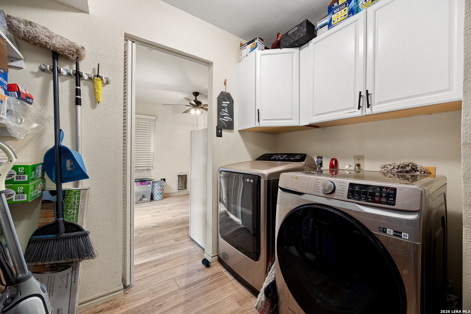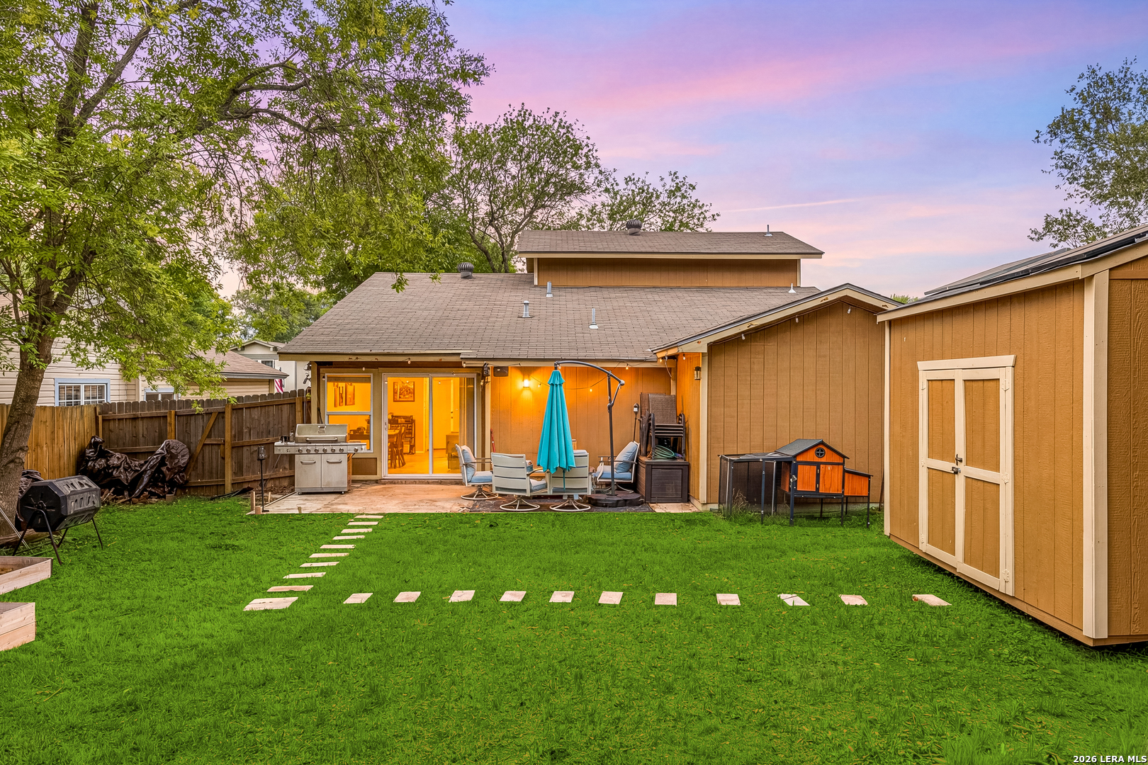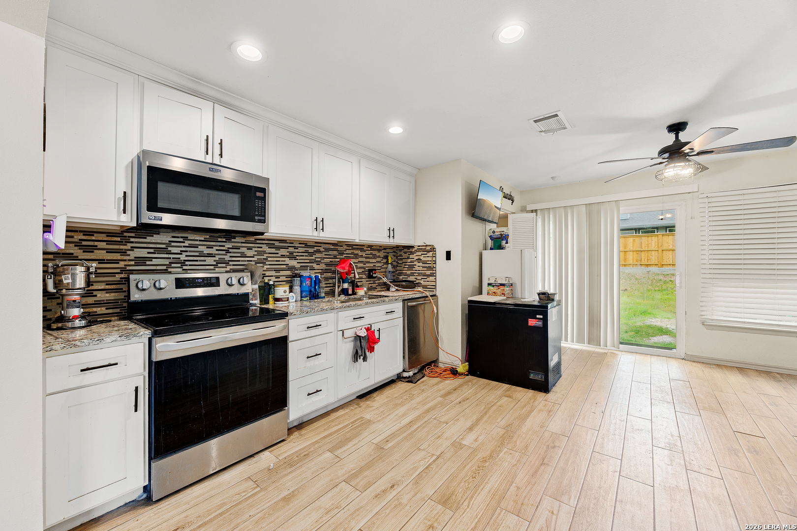 This lovely 3-bedroom, 2-bath home is located in the quiet, friendly neighborhood of Oak Grove and offers a comfortable layout with thoughtful updates throughout. Renovated between 2021 and 2022, the home features an open floor plan that creates an easy flow between the main living areas. The living room includes a cozy fireplace and connects to a formal dining space, making it ideal for everyday living or gatherings. The kitchen has been opened up and upgraded with custom-built cabinetry, granite countertops, a stylish backsplash, and stainless steel appliances. An eat-in breakfast nook adds additional dining space, and the oversized pantry/laundry room provides plenty of storage and functionality. The primary bedroom is located on the first floor for added convenience and privacy. It includes a full bath and an expanded layout with an additional 121 square feet dedicated to a large walk-in closet featuring solid wood built-in shelving. Upstairs, you'll find the secondary bedrooms along with a spacious loft that works well as a second living area, game room, or flex space to suit your needs. Recent updates include ceramic tile flooring throughout the kitchen, dining, and living areas. The backyard offers a relaxing outdoor space with a patio, mature trees, a privacy fence, and a storage shed. Conveniently located near schools, Loop 1604, shopping, and everyday essentials, this home offers both comfort and accessibility. Schedule your showing today!