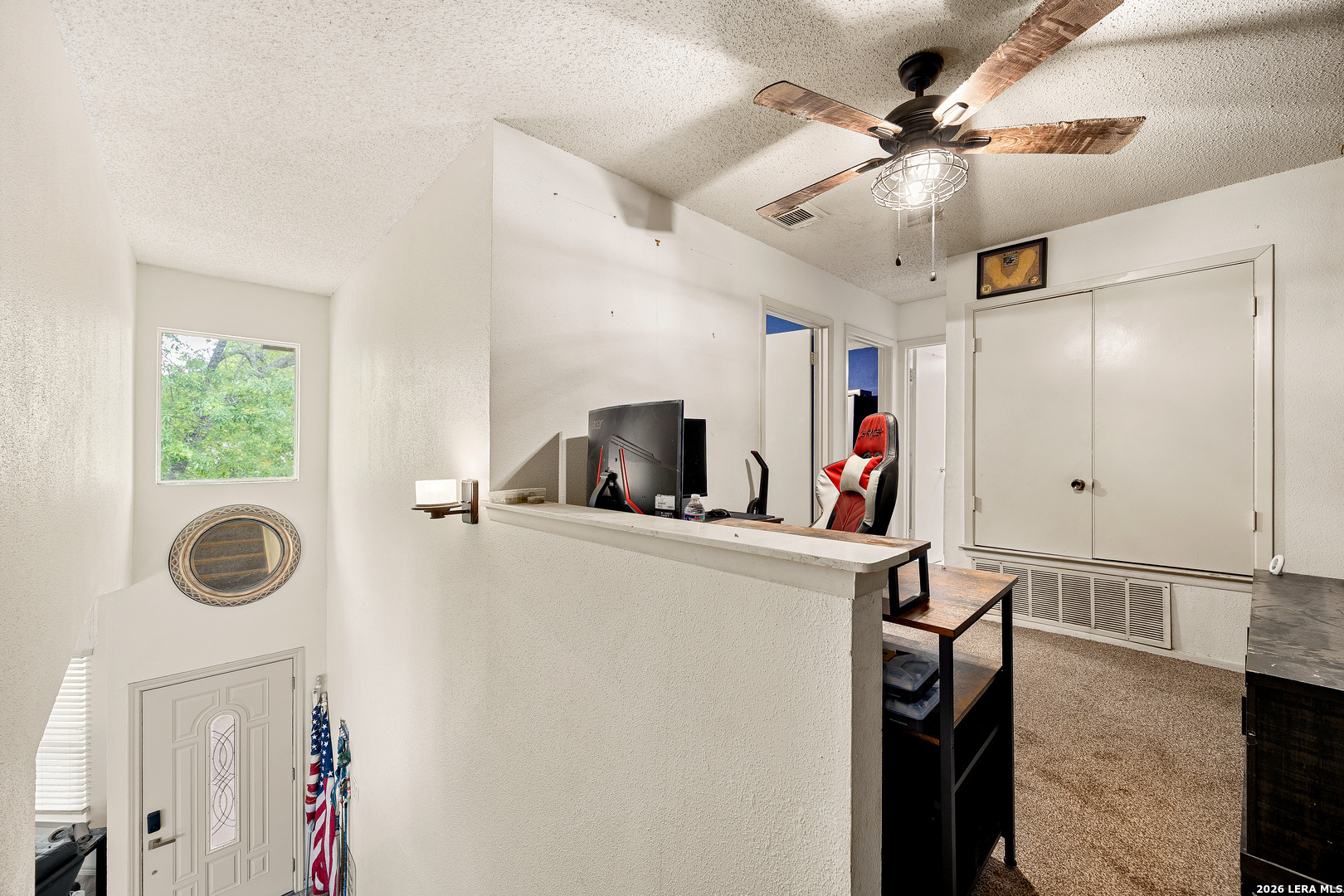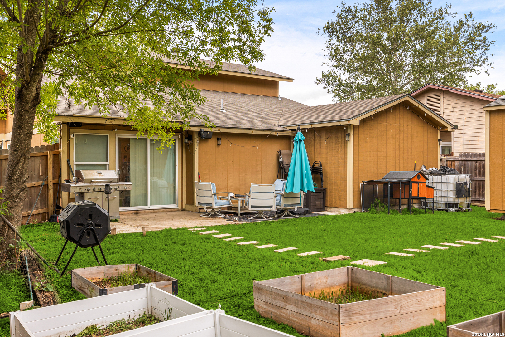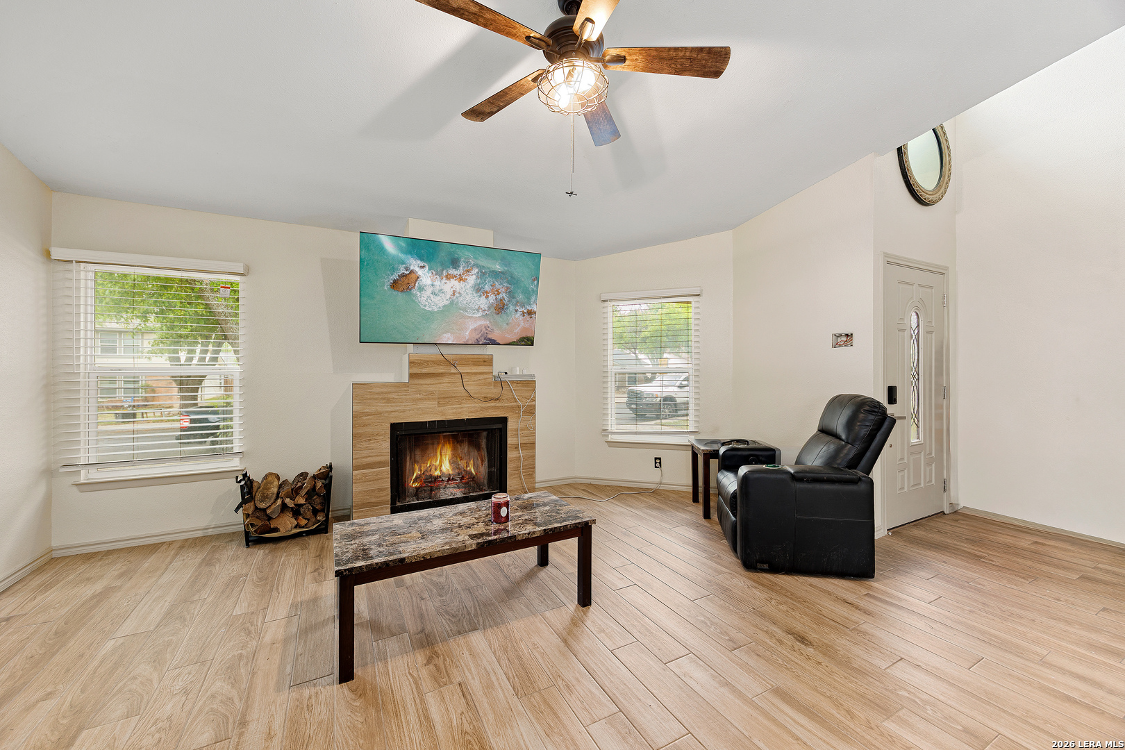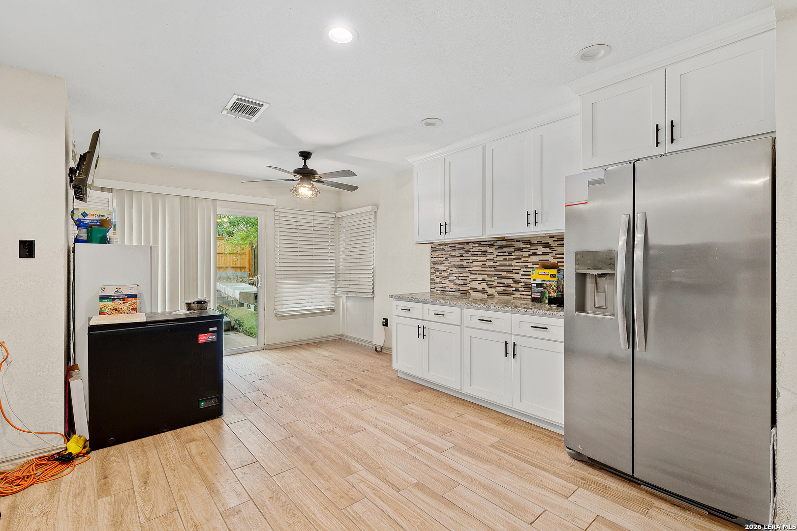 This lovely 3-bedroom, 2-bath home is located in the quiet, friendly neighborhood of Oak Grove and offers a comfortable layout with thoughtful updates throughout. Renovated between 2021 and 2022, the home features an open floor plan that creates an easy flow between the main living areas. The living room includes a cozy fireplace and connects to a formal dining space, making it ideal for everyday living or gatherings. The kitchen has been opened up and upgraded with custom-built cabinetry, granite countertops, a stylish backsplash, and stainless steel appliances. An eat-in breakfast nook adds additional dining space, and the oversized pantry/laundry room provides plenty of storage and functionality. The primary bedroom is located on the first floor for added convenience and privacy. It includes a full bath and an expanded layout with an additional 121 square feet dedicated to a large walk-in closet featuring solid wood built-in shelving. Upstairs, you'll find the secondary bedrooms along with a spacious loft that works well as a second living area, game room, or flex space to suit your needs. Recent updates include ceramic tile flooring throughout the kitchen, dining, and living areas. The backyard offers a relaxing outdoor space with a patio, mature trees, a privacy fence, and a storage shed. Conveniently located near schools, Loop 1604, shopping, and everyday essentials, this home offers both comfort and accessibility. Schedule your showing today!