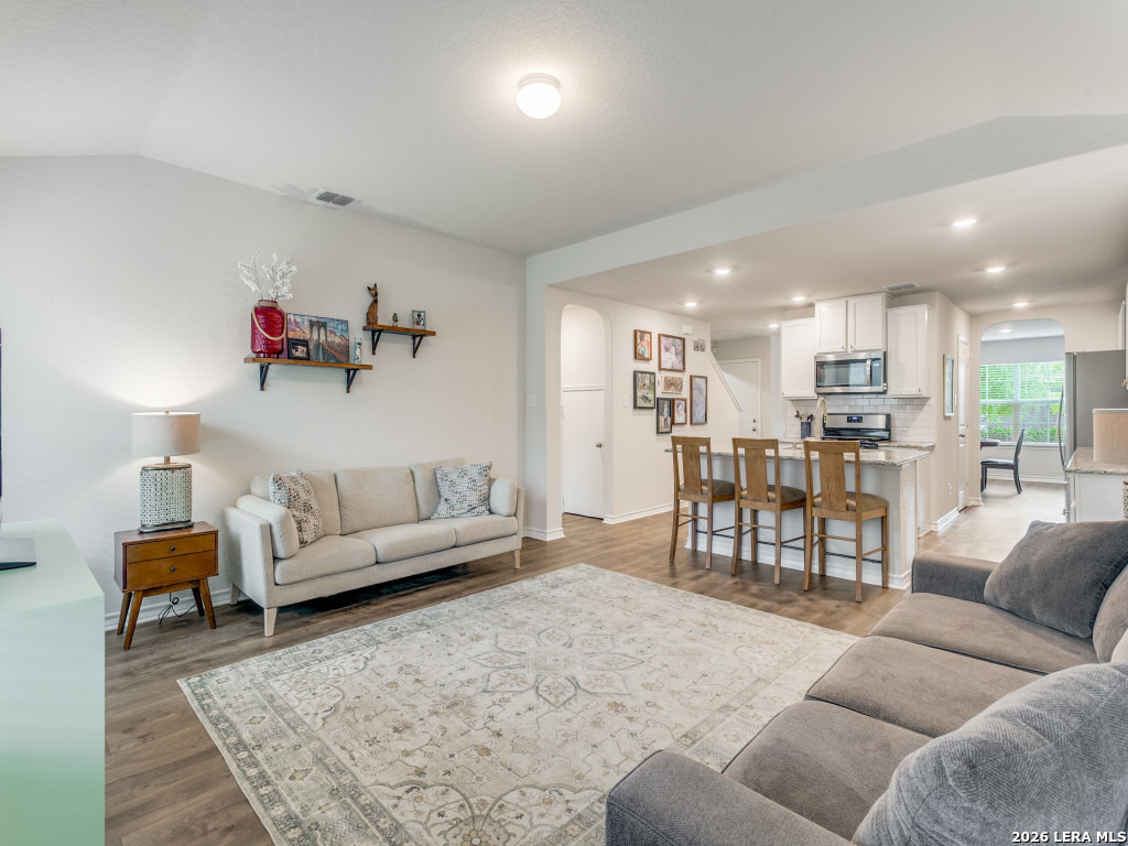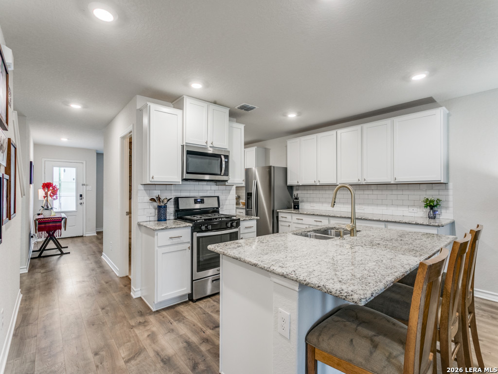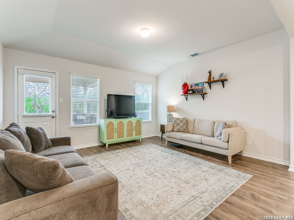 Redbird Ranch provides the lifestyle you have been looking for and 914 Sage Thrasher is the perfect home to achieve that. The Express Home Lombardi floorplan gives everyone the space they are looking for and feels cozy and inviting at the same time. Light, bright, and open. A separate dining room or extra living space is situated in the front of the home. The kitchen flows between dining and living and is gorgeous with white cabinetry, granite countertops, and modern cabinet/drawer pulls. Eat in kitchen. The living room is situated perfectly to be able to entertain guests and still put together the perfect meal. The primary suite is on the first floor tucked away for privacy. A separate garden tub and shower, walk in closet. Upstairs there are 4 bedrooms, 1 bathroom, and a game room. The backyard features a covered patio and backs up to a greenbelt with mature trees, a peaceful way to begin and end your day. Refrigerator, washer, dryer all convey. Have you ever heard of a neighborhood having their own Lifestyle Director who handles fun and entertainment for the entire neighborhood?! The following are amenities that set apart Redbird Ranch from so many communities. The Poolside Drive Pool and Clubhouse houses a lap pool, wading pool, cabana, clubhouse, fitness center, playground, tennis court and basketball courts. Hollimon Park houses a pool, splash pad area with a huge Scorpion fountain, sports field, basketball court, outdoor fitness equipment, weekly food trucks are parked here, tables to eat at and an outdoor fireplace. A 3rd amenity center coming soon will include 2 pools (1 with waterslides), park, playground, tennis/pickleball, basketball, clubhouse, fitness center. There are also walking trails and speaking of walking, Boldt Elementary School is less than a mile from home. Close to HEB and so many retailers and restaurants. Less than 30 minutes to Lackland AFB, Government Canyon State Natural Area. 10 miles to Sea World and Northwest Vista College. Need I say more? Come, visit, fall in love!