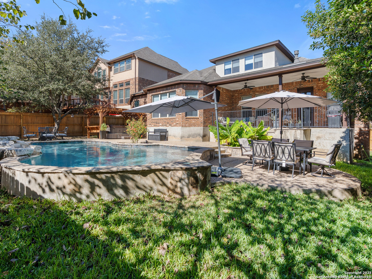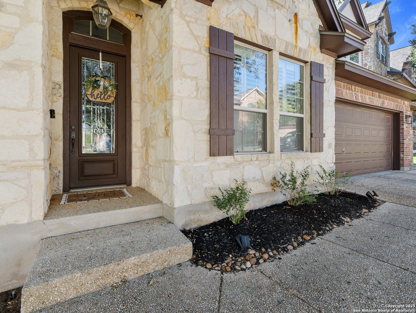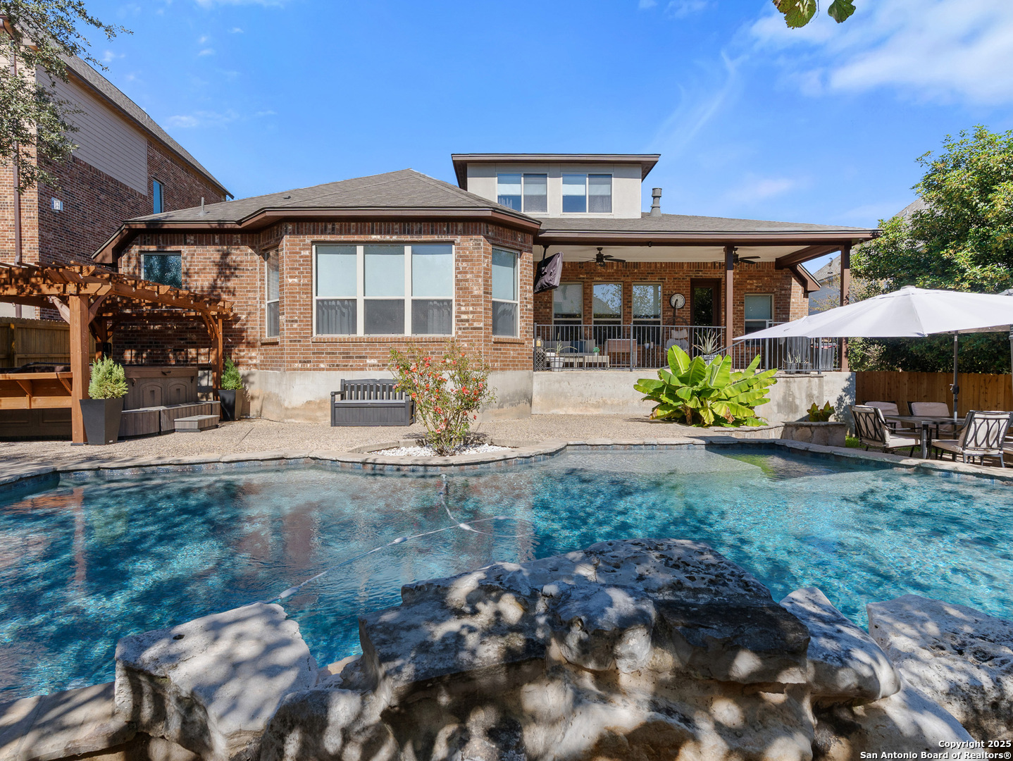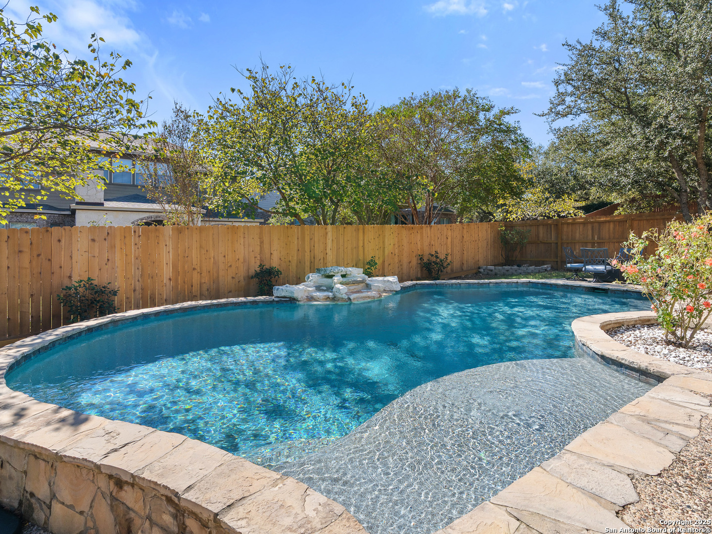 Welcome to this luxurious home by David Weekley in the highly desirable gated Terra Bella community of Stone Oak. 918 Olivia View offers functionality, space, and a scenic backyard with a Keith Zars Pool, seven-person hot tub, and a covered back patio porch with a gas line ready for outdoor grilling, to complete the perfect ambience. Recent upgrades include: New Roof Installed 2025 - New Fence Installed 2025 - Fresh Interior & Exterior Paint Including Exterior Trim 2025- New Flooring Installed 2024 - New Light Fixtures throughout. The chic & inviting floor plan is perfect for gatherings, entertaining, or cozy evenings against the stone-accented fireplace. Enjoy natural light, high ceilings, eight-foot doors throughout, extended kitchen cabinetry, and updated kitchen appliances. Favorite features in the home include the colossal primary bedroom w/oversized walk-in closet, the upstairs flex-game room with its own private full-bath, perfect for overnight guests and large gatherings, and an additional living room on the first floor to be used creatively as your needs demand. Other highlights include NO CITY TAX, a generously sized 3-car garage, water softener, reverse osmosis, sprinkler system, and window shades. Ideally located within walking distance to neighborhood amenities, HEB and top-rated NEISD schools, this home offers both luxury and convenience. Just minutes from restaurants, shopping, schools, and entertainment. The perfect home awaits in the heart of Stone Oak.