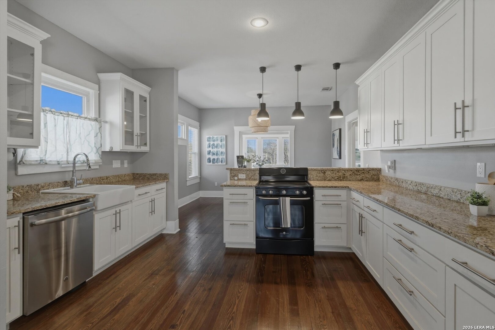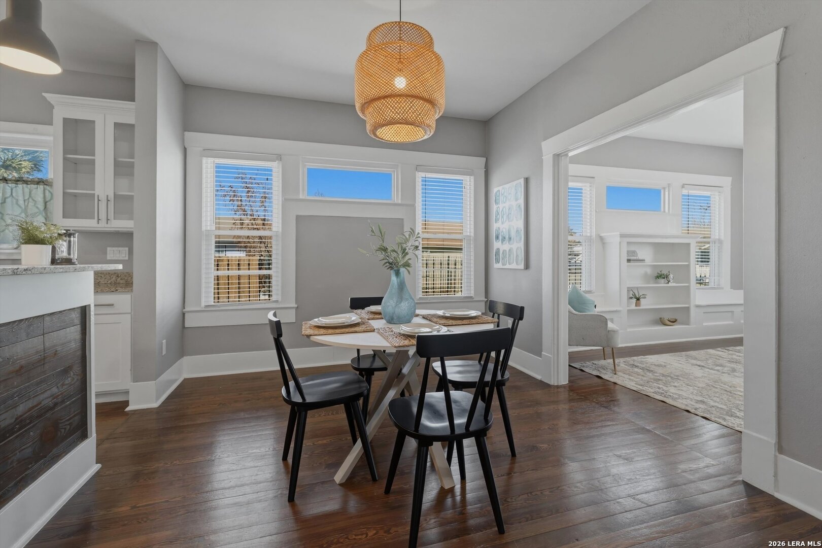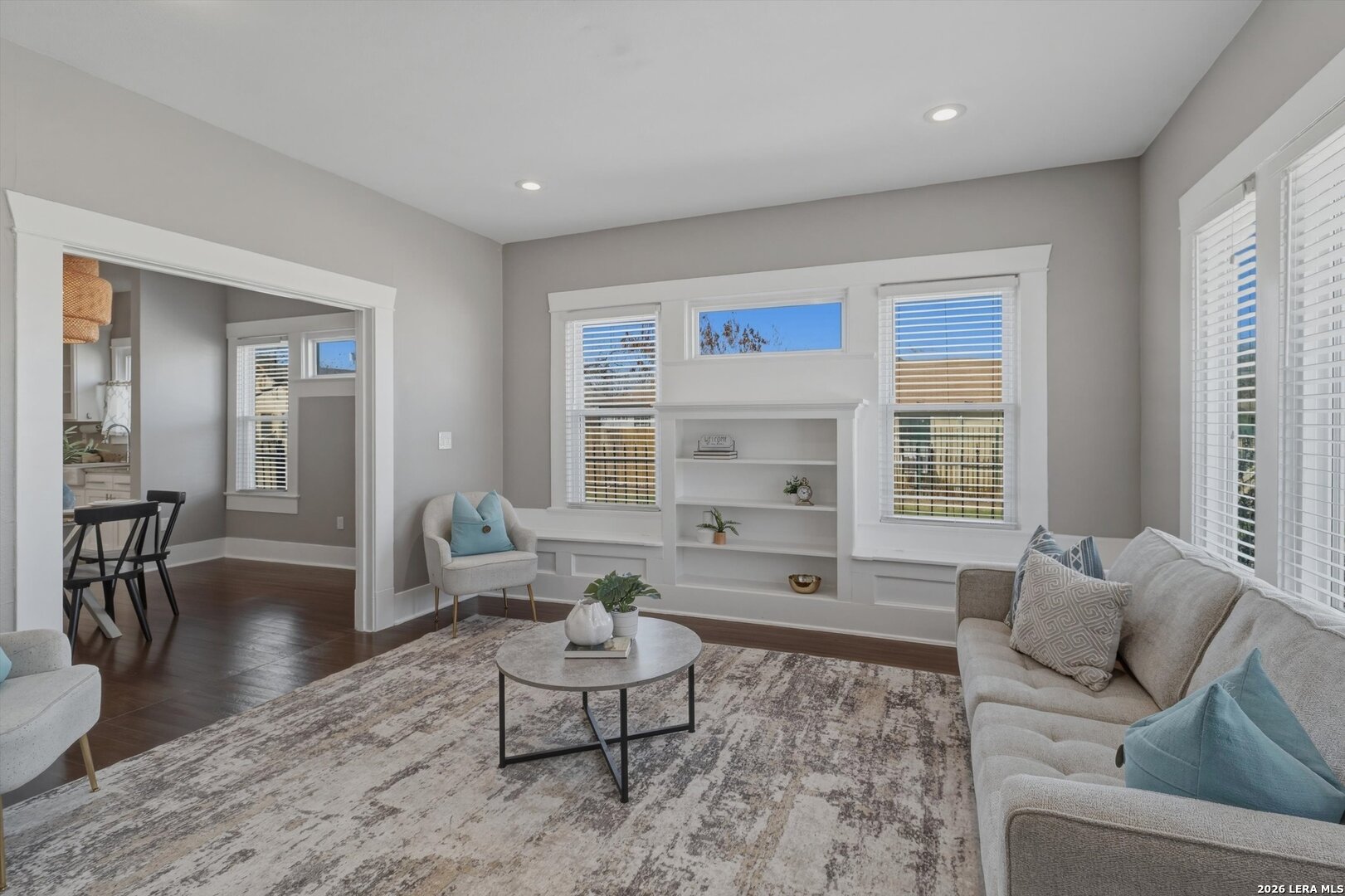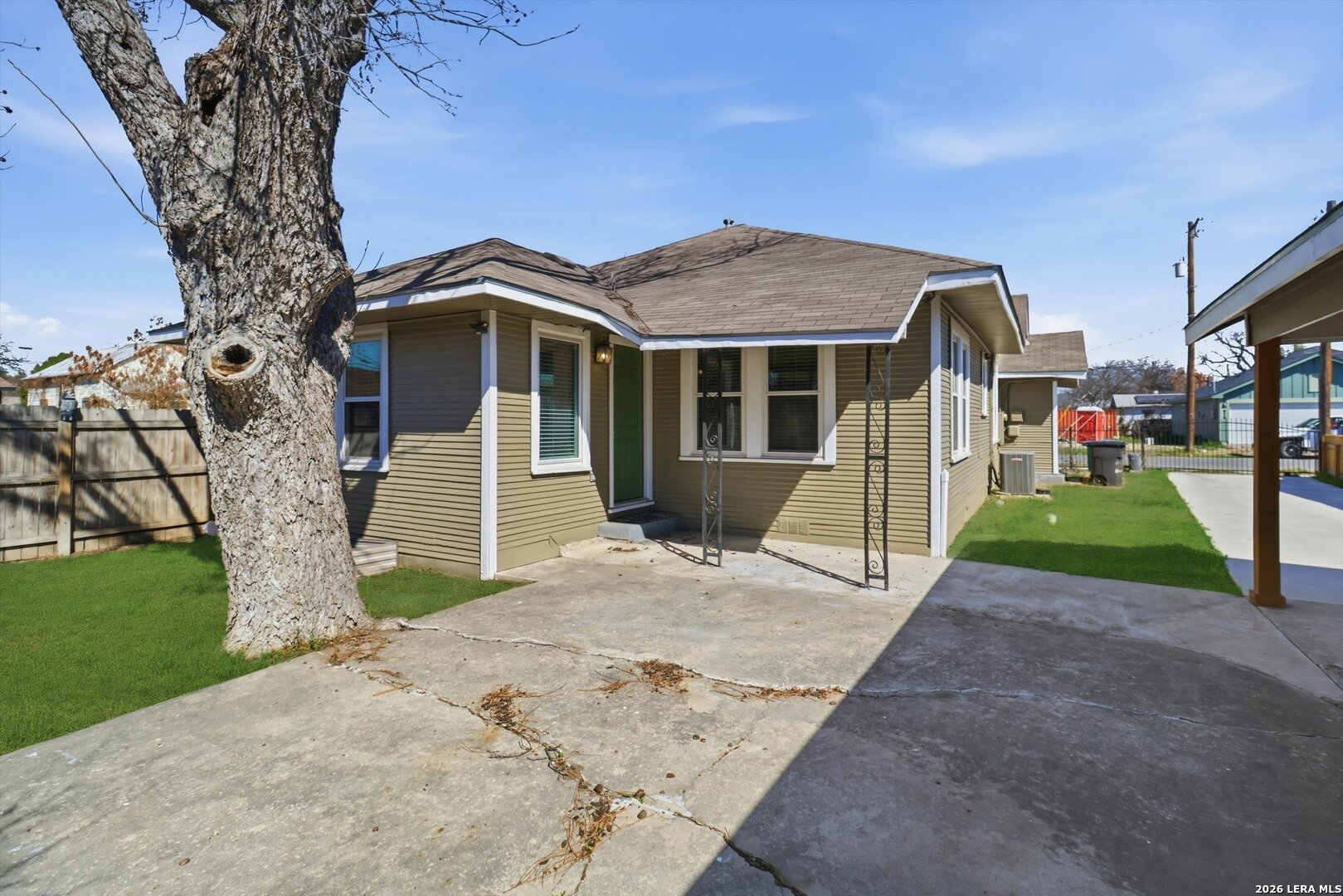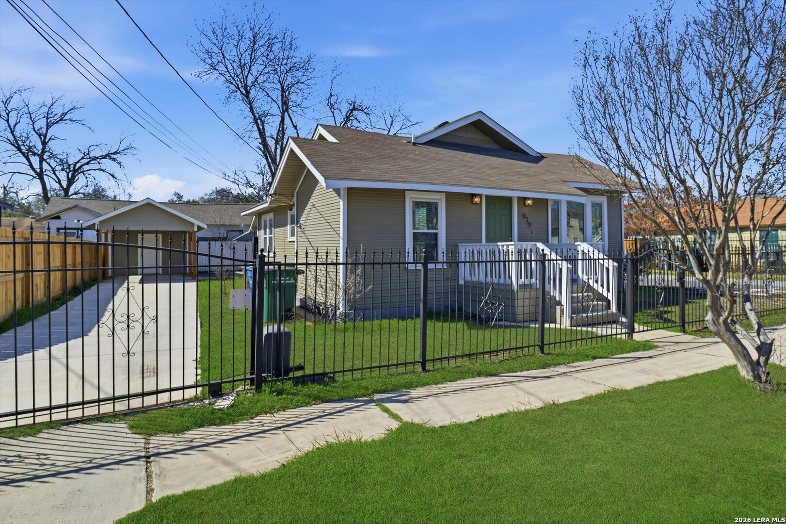 Exceptional cottage-style Craftsman blending timeless character with modern upgrades. A welcoming foyer opens to a spacious living area featuring original built-in shelving and storage, soaring ceilings, recessed lighting, and beautifully restored hardwood floors. The oversized kitchen is designed for both function and style with granite countertops, upgraded cabinetry, a farmhouse sink, and a large walk-in pantry. The thoughtfully designed layout offers two generously sized secondary bedrooms, a versatile flex/bonus room, and a split primary retreat with a private ensuite showcasing dual vanities, a custom walk-in shower, and a spacious closet. Originally built in 1945 and fully renovated, this home preserves its historic charm while providing today's most desired updates. The exterior is equally impressive with a wrought-iron fence, electric gate, extended private driveway, side entry, and additional outdoor storage. Ideally located just minutes from Downtown San Antonio, the historic Hays Street Bridge, The Pearl, and JBSA Fort Sam Houston, this one-of-a-kind property offers both character and convenience.