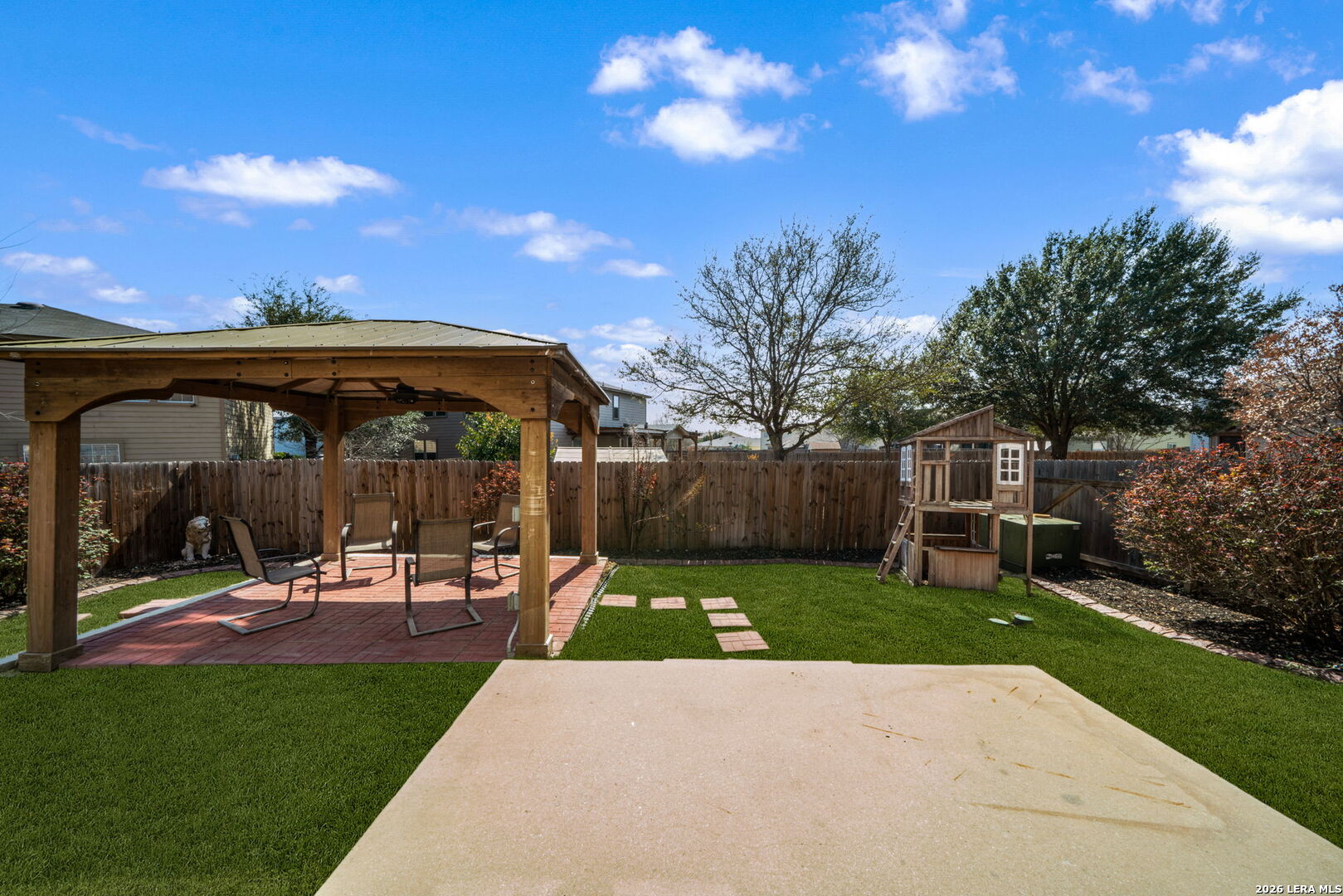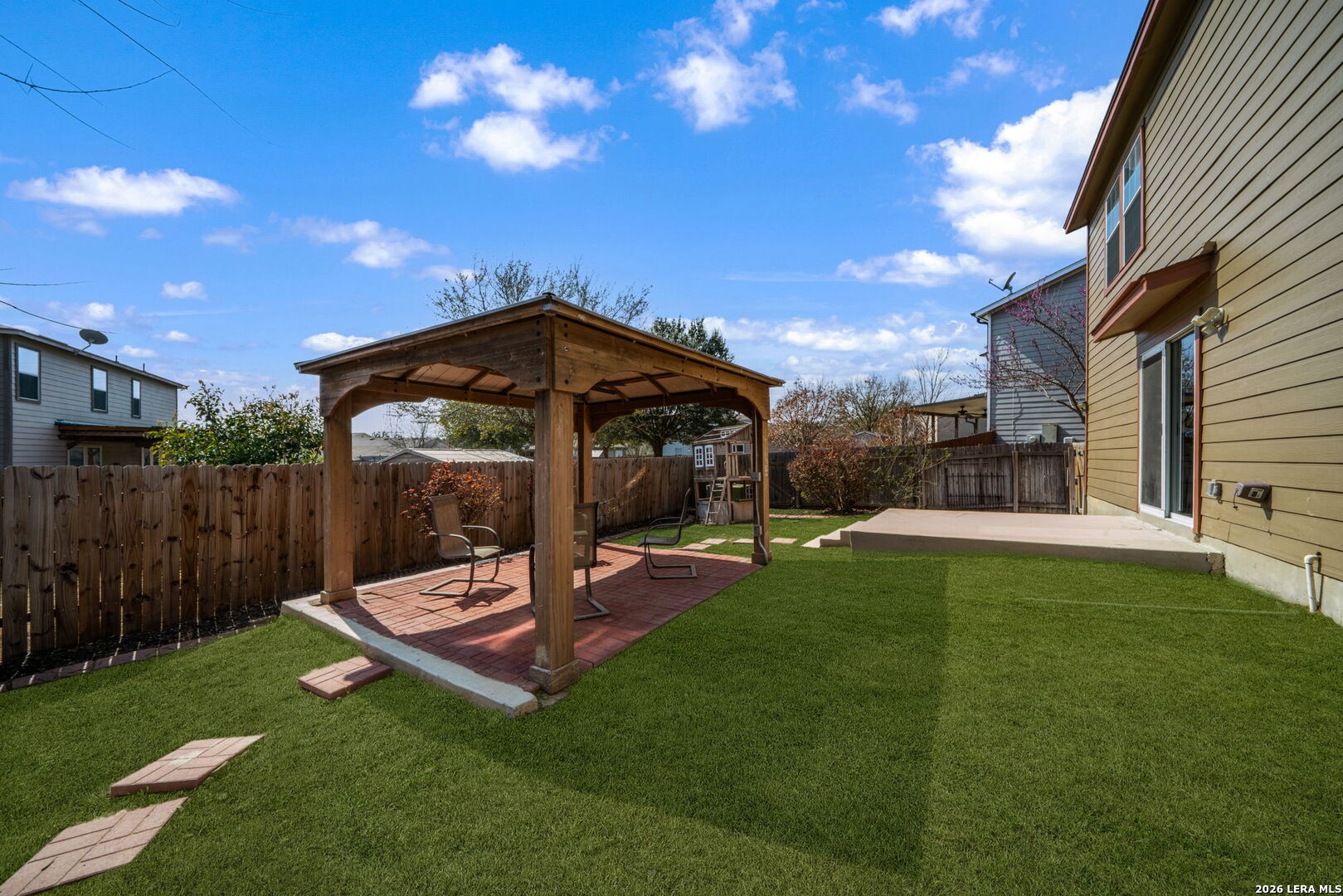 Welcome to this beautifully updated two-story home in the highly desirable Chestnut Springs community, perfectly situated just minutes from Highway 151 and Loop 410 for unbeatable convenience to shopping and dining. This spacious 4-bedroom, 2.5-bath home combines modern upgrades with thoughtful design and meticulous care. The first-floor living area showcases stunning porcelain tile flooring that adds elegance and durability, creating a bright and inviting space for both everyday living and entertaining. The kitchen has been tastefully updated with modern finishes, featuring granite countertops, professionally painted cabinetry, a charming farmhouse sink, stainless steel appliances, and a huge pantry with additional storage space. Upstairs, the stairs and hallway have just been upgraded with premium laminate flooring, adding a fresh, cohesive look to the second level. The generously sized bedrooms offer comfort and flexibility for family, guests, or a home office. Step outside to your private backyard oasis complete with an oversized pergola and extended rear patio slab, creating the perfect setting for outdoor gatherings, weekend barbecues, or relaxing Texas evenings. The front driveway has been recently extended and comfortably accommodate four vehicles in addition to the two-car garage. This home has been meticulously maintained, including a well-serviced HVAC system and a water softener complete with a carbon filtration system, offering comfort, efficiency, and peace of mind for the next owner. Come experience this move-in ready, beautifully upgraded Texas Dream Home in a prime location a one-of-a-kind true Gem in Chestnut Springs you don't want to miss.