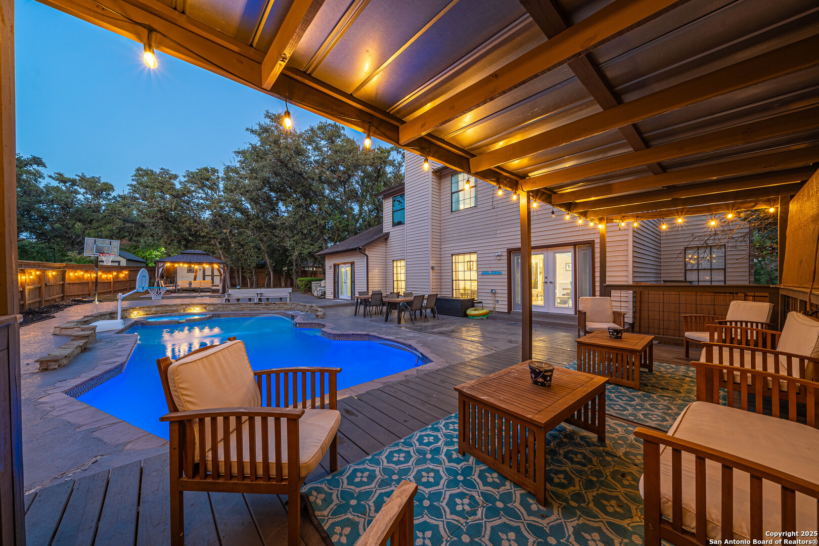 A true backyard lover's dream! This oversized quarter-acre lot is designed for entertaining with a sparkling pool, two shaded gazebos, a storage shed, and gorgeous evening lighting that creates the perfect atmosphere. Inside, you'll find two master suites! One upstairs and one downstairs, ideal for multigenerational living, a private guest retreat, or even a mother-in-law suite. The kitchen is a chef's delight with plenty of cabinet space, a double oven, and a vented hood. It also features a breakfast bar and eat-in dining area. A formal dining room connects seamlessly to the living room, making it the heart of the home. Upstairs, a versatile family room awaits, complete with a washer and dryer conveniently located nearby (previously in the garage, so you can easily convert the space back if you'd prefer a wet bar or closet instead). An adjacent office provides room to work from home, but it could also serve as a nursery or flex room since it sits right next to the upstairs master suite. The garage is just as impressive, featuring a high-gloss epoxyshield floor that's as durable as it is stylish. With endless possibilities for living and entertaining, this home truly has it all!