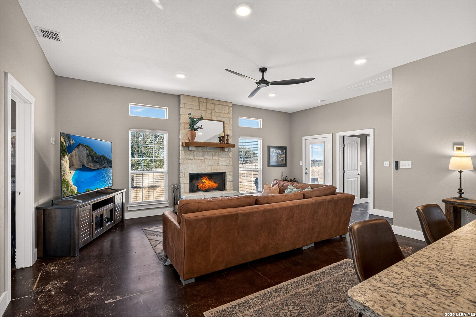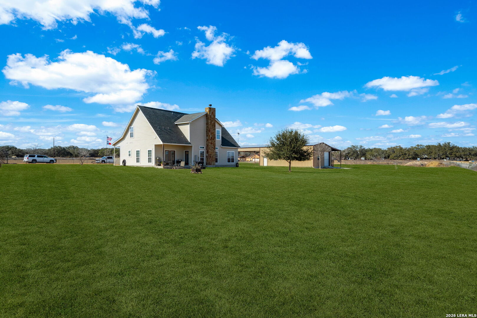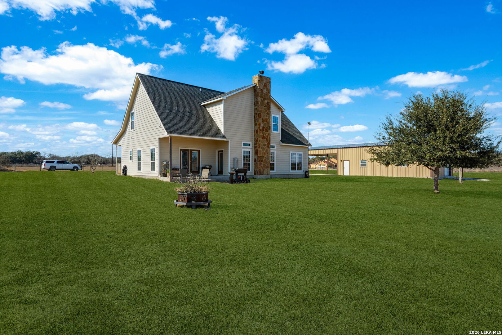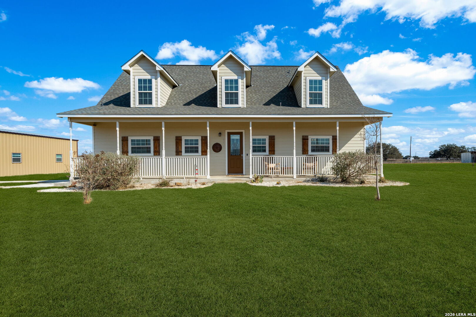 Step into this custom-built, fully fenced two-story, 4-bedroom, 2-bath home with a study, set on just over 4 acres in Devine! Welcomed by an automatic gate, you'll find a newly built large shop with covered parking alongside this beautiful Hill Country-style home. Enter through the front door from the dreamy front porch, or come in through the side mudroom featuring ample pantry storage. Inside, high ceilings, stained concrete floors, granite countertops, and new light fixtures create a bright, inviting feel throughout. Paid-off solar panels convey with the sale for an energy-efficient home-helping keep monthly electric bills lower, even during those hot Texas summer months!