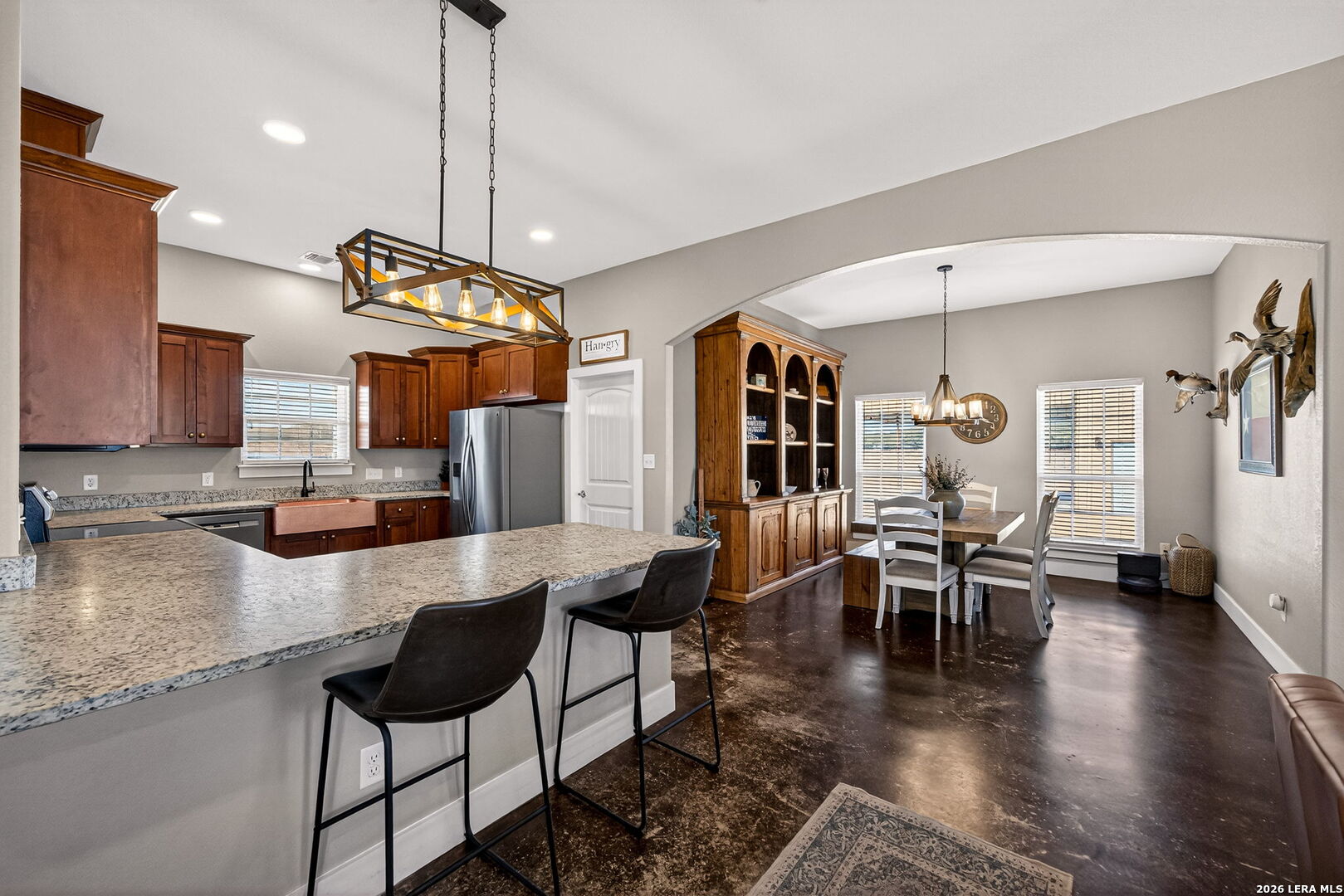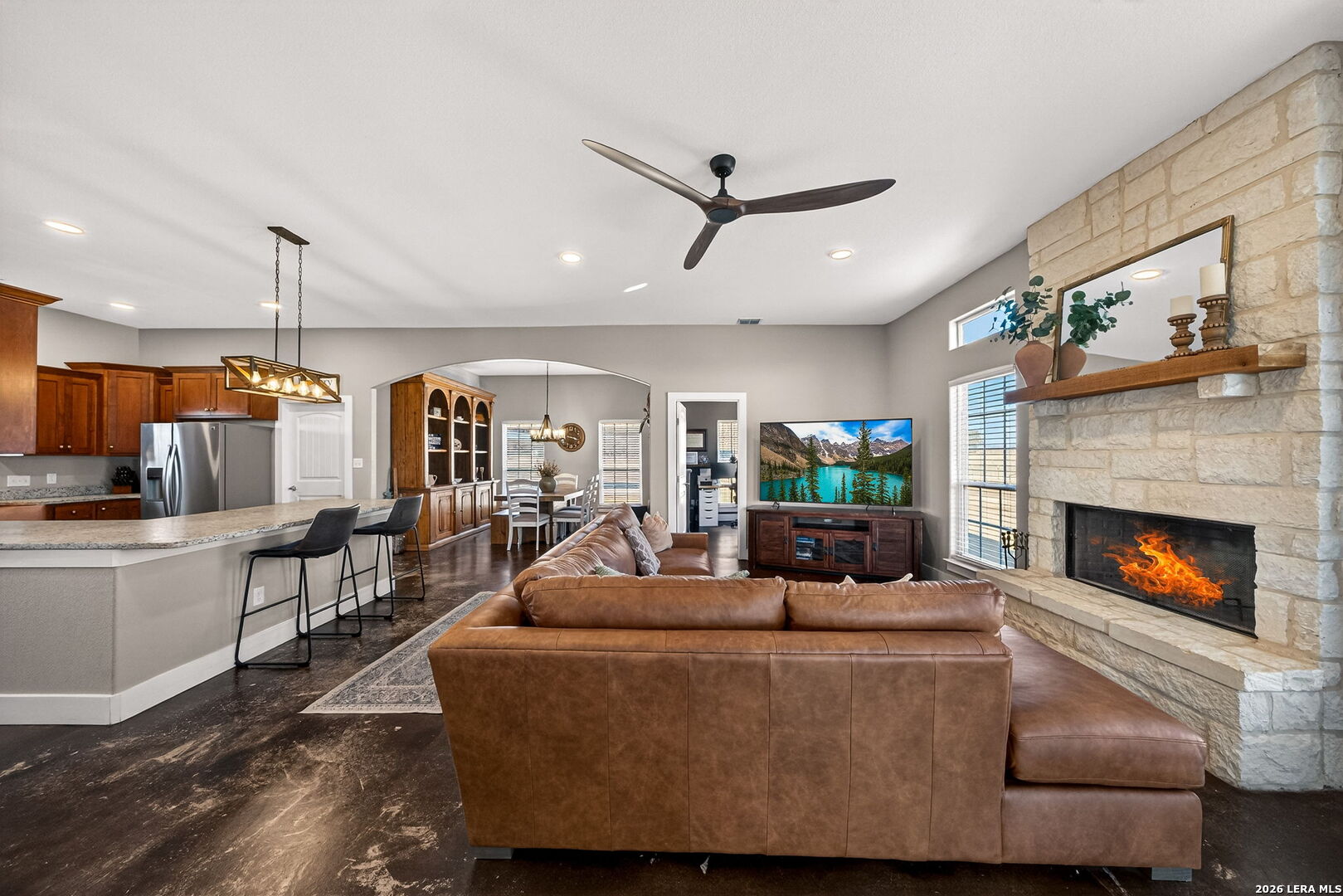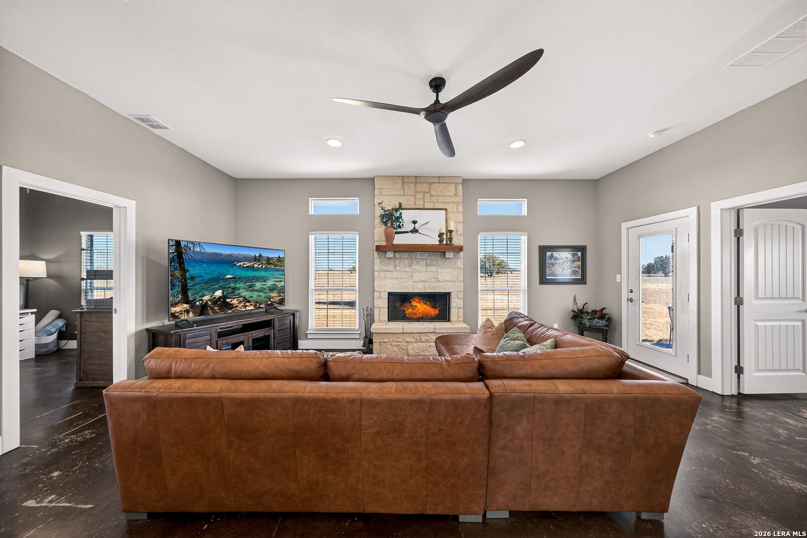 Step into this custom-built, fully fenced two-story, 4-bedroom, 2-bath home with a study, set on just over 4 acres in Devine! Welcomed by an automatic gate, you'll find a newly built large shop with covered parking alongside this beautiful Hill Country-style home. Enter through the front door from the dreamy front porch, or come in through the side mudroom featuring ample pantry storage. Inside, high ceilings, stained concrete floors, granite countertops, and new light fixtures create a bright, inviting feel throughout. Paid-off solar panels convey with the sale for an energy-efficient home-helping keep monthly electric bills lower, even during those hot Texas summer months!