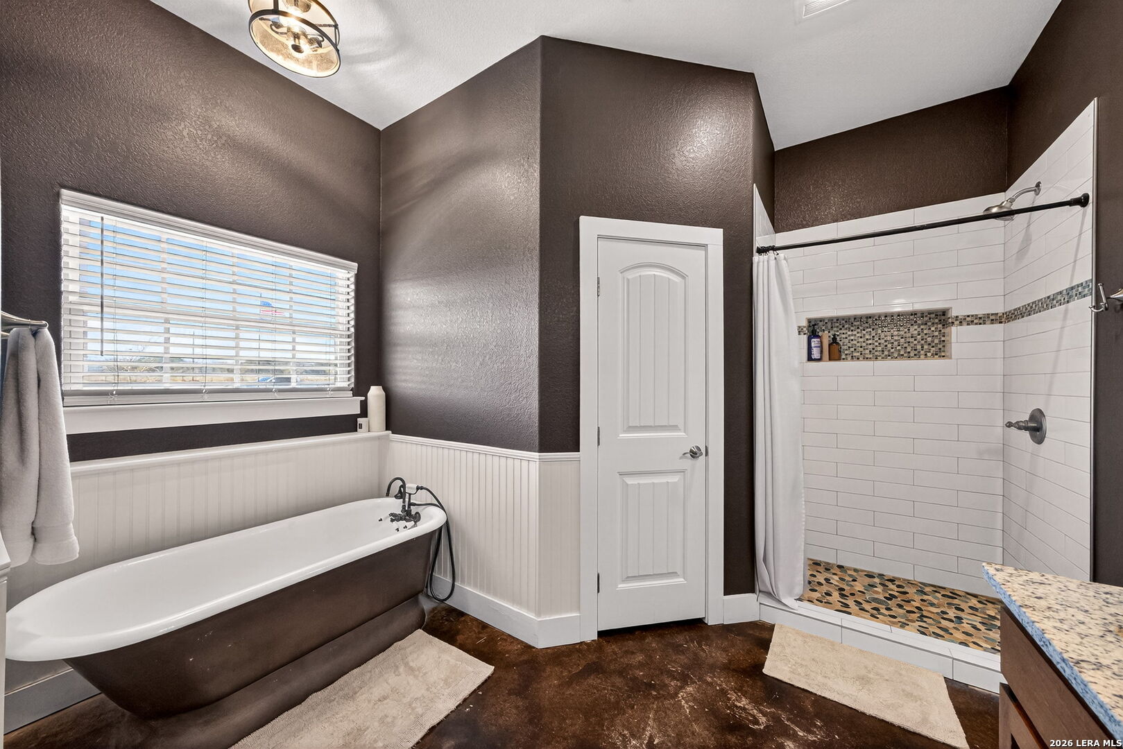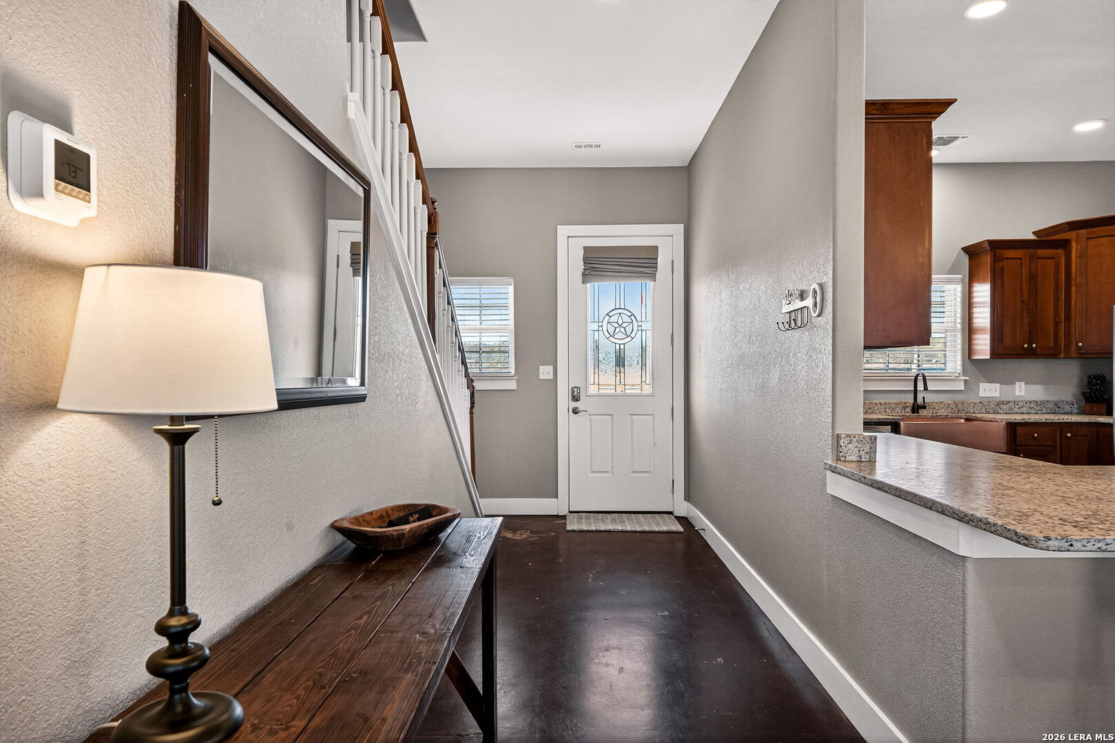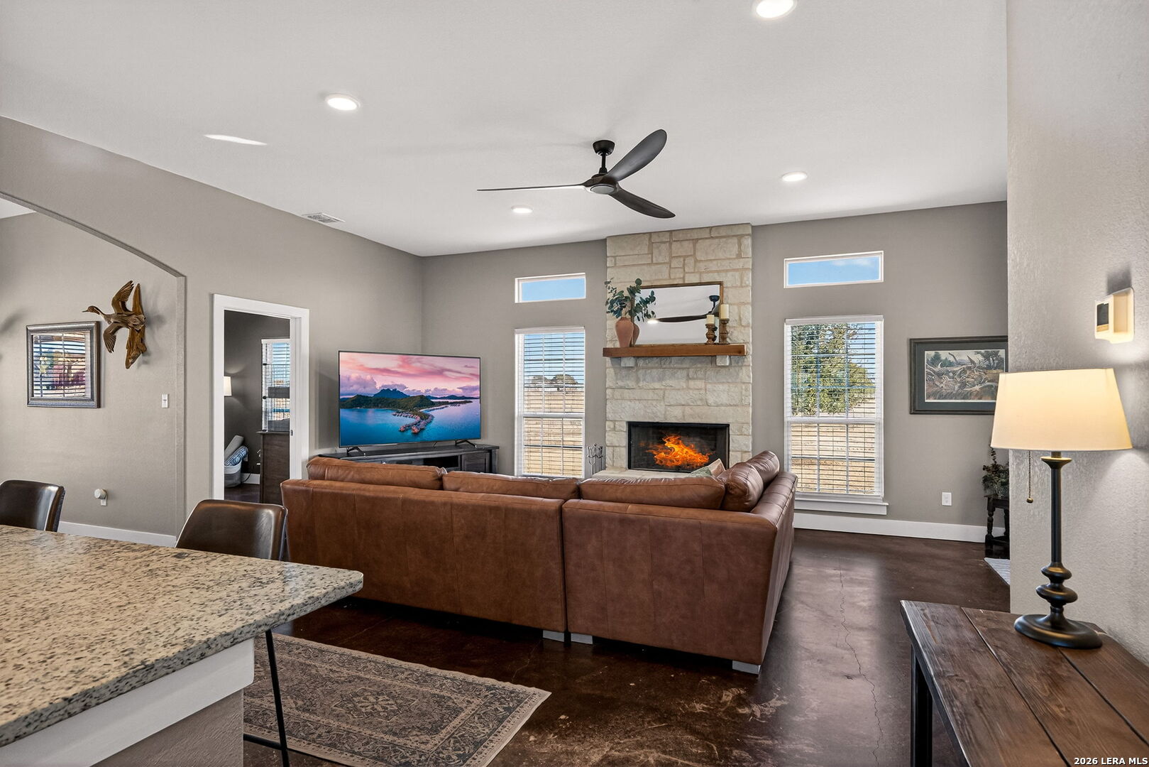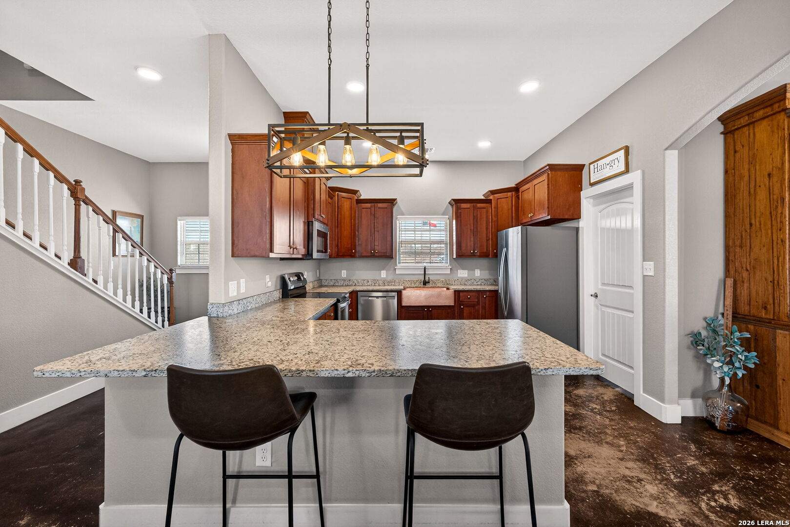 Step into this custom-built, fully fenced two-story, 4-bedroom, 2-bath home with a study, set on just over 4 acres in Devine! Welcomed by an automatic gate, you'll find a newly built large shop with covered parking alongside this beautiful Hill Country-style home. Enter through the front door from the dreamy front porch, or come in through the side mudroom featuring ample pantry storage. Inside, high ceilings, stained concrete floors, granite countertops, and new light fixtures create a bright, inviting feel throughout. Paid-off solar panels convey with the sale for an energy-efficient home-helping keep monthly electric bills lower, even during those hot Texas summer months!