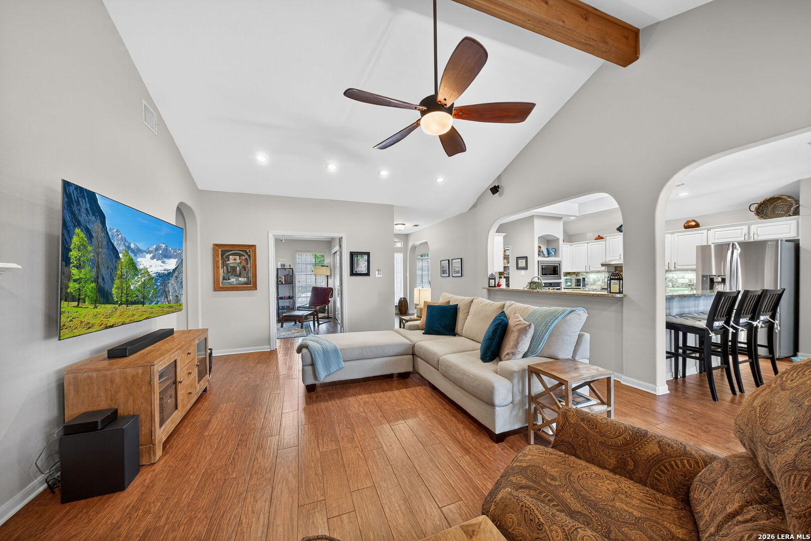 This meticulously maintained home lacks nothing. Experience elevated living in this beautifully upgraded, move-in ready Connell Barron Homes single-story residence, expertly crafted with quality and style. Situated on a desirable corner lot in Fossil Springs, the home offers an oversized back patio-perfect for entertaining or relaxing outdoors. Inside, vaulted ceilings, rich architectural details, and abundant natural light create a warm yet refined atmosphere. The chef-inspired kitchen boasts granite countertops, gas cooktop, built-in oven and microwave, oversized walk-in pantry, and a stylish dry bar, flowing seamlessly to a spacious family room with wood-beam ceiling, gas fireplace, and surround sound wiring. Privately tucked away, the primary suite is a true retreat, offering a serene sitting area or office and a spa-like bath complete with dual vanities, vessel sinks, a jetted soaking tub, and expansive walk-in shower with bench seating, and a generous walk-in closet with separate his and her sides. Smart home enhancements include a Nest thermostat, owned security system, and Wi-Fi-enabled irrigation, along with a tankless water heater and water softener. The split-bedroom layout, upgraded flooring, utility room with exterior access, and extended garage with storage complete this thoughtfully designed home. A perfect blend of Connell Barron craftsmanship, luxury finishes, and indoor-outdoor living. Community amenities include pool, playground, sports courts, BBQ/Picnic area and putting green. Don't wait. Schedule your showing today!