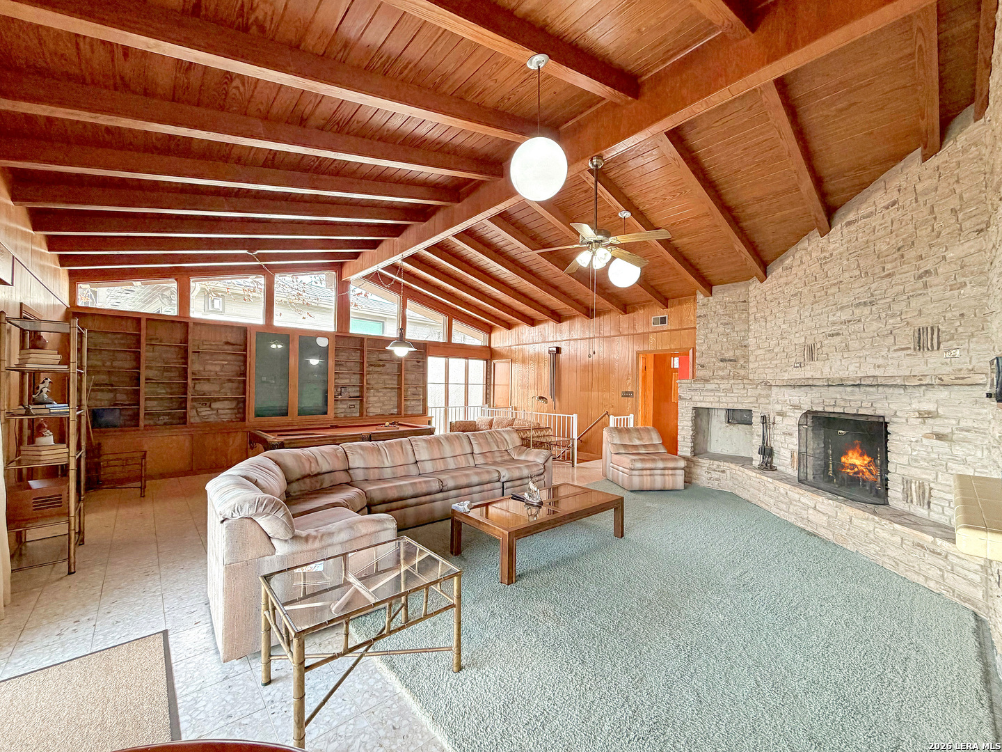 This waterfront mid-century modern home offers a truly one-of-a-kind lake view and could be the perfect lake house retreat. Situated on over half an acre, the property is rich in character, featuring a limestone exterior and terrazzo tile throughout. The living room boasts a vaulted tongue-and-groove ceiling and a striking stone fireplace. All furnishings convey, including the foosball table, pool table, and gas grill. The spacious kitchen includes a built-in china cabinet and a vintage farmhouse-style one-piece double porcelain sink with dual drainboards. Additional highlights include a large walk-in cedar closet, a separate game or hobby room, and an oversized laundry/utility room. Outside, the nicely terraced backyard leads directly down to the water's edge with ample space for swimming and boating on the 42' easement. There is additional parking available below the terraced yard.