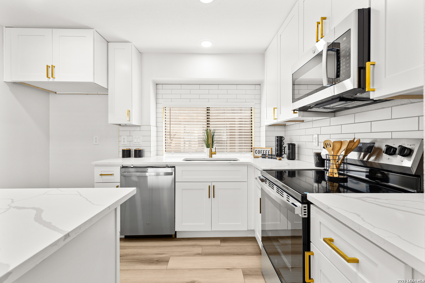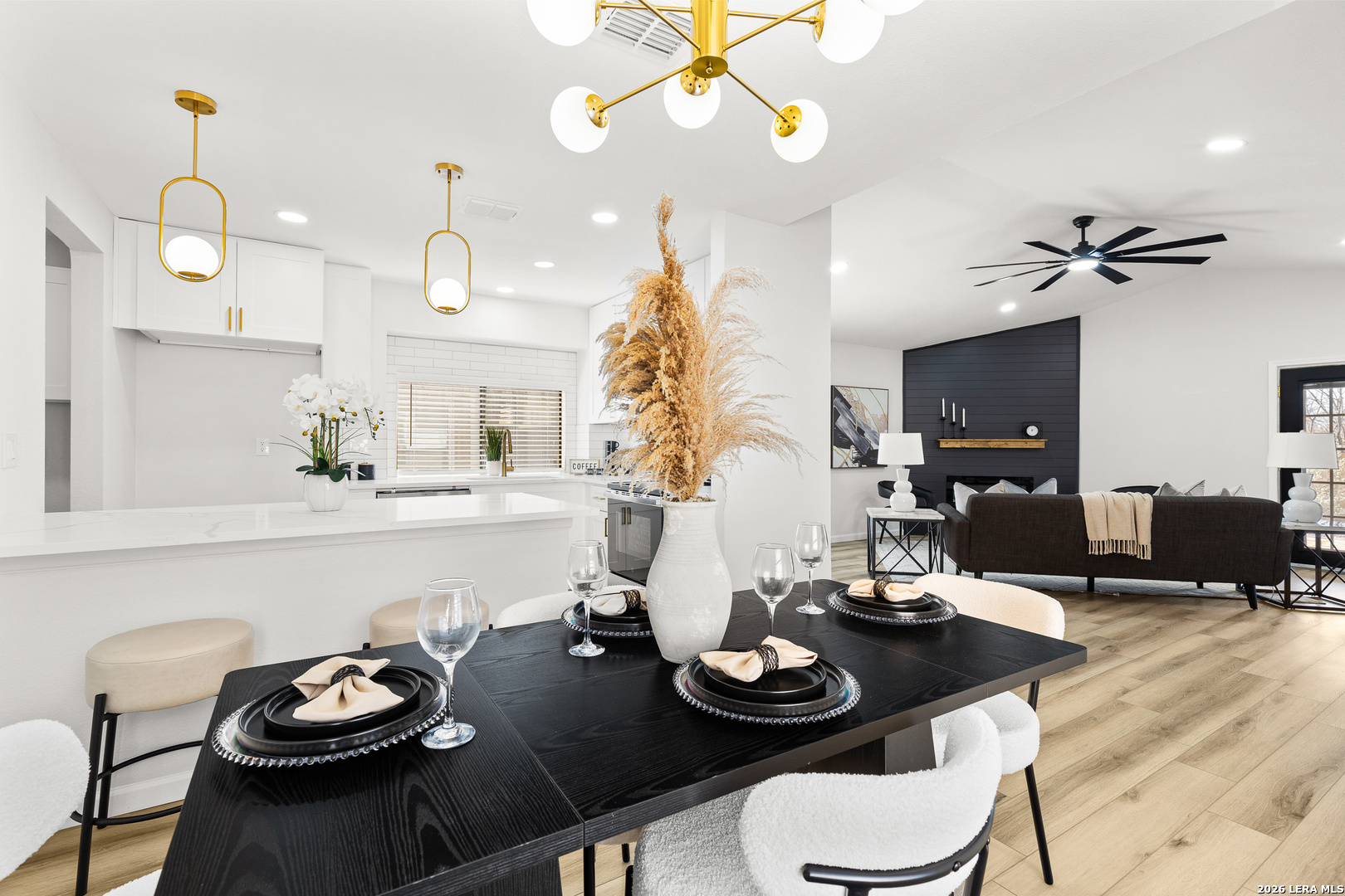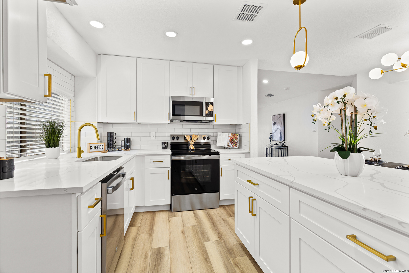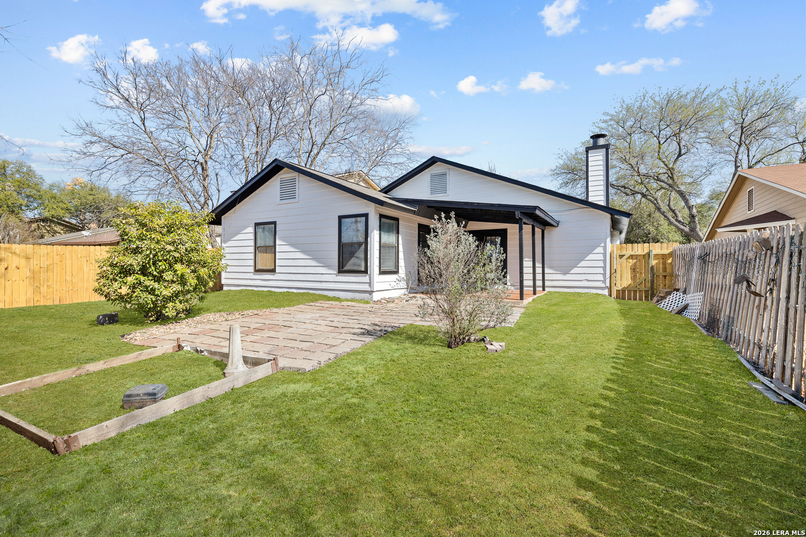 If you're looking for a home that's been tastefully updated and is truly move-in ready, this is it. From the moment you walk in, you'll notice the open layout and beautiful vinyl flooring that runs throughout the main living areas. The kitchen has been completely refreshed with white shaker cabinets, quartz countertops, subway tile backsplash, stainless steel appliances, and modern gold hardware. The peninsula offers extra prep space and bar seating perfect for casual meals or entertaining friends and family. The living room feels bright and inviting with vaulted ceilings, a sleek black accent wall, and a contemporary fireplace that adds character and warmth. It flows easily into the dining area, making it ideal for gatherings. The primary suite offers a relaxing retreat with stylish finishes and an updated ensuite bathroom featuring a freestanding soaking tub, walk-in shower, quartz countertops, and upgraded fixtures that give it a clean, modern feel. The secondary bedrooms are well-sized and versatile great for family, guests, or a home office. Out back, you'll find a spacious yard with plenty of room to relax, garden, or entertain. Location is a huge plus here with quick access to Loop 1604, IH-10, and Highway 151, you're just minutes from major shopping, dining, and entertainment at La Cantera, The Rim, and surrounding retail centers. A clean, modern update in a convenient San Antonio location ready for its next owner to enjoy.