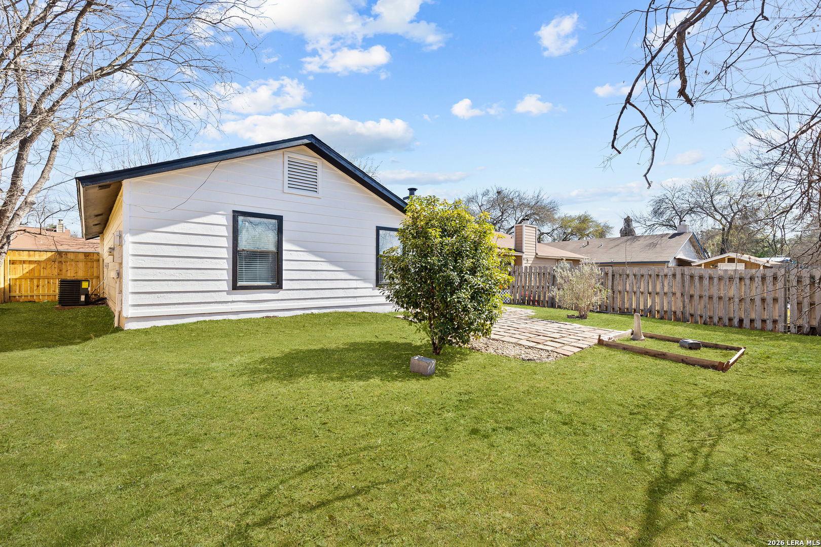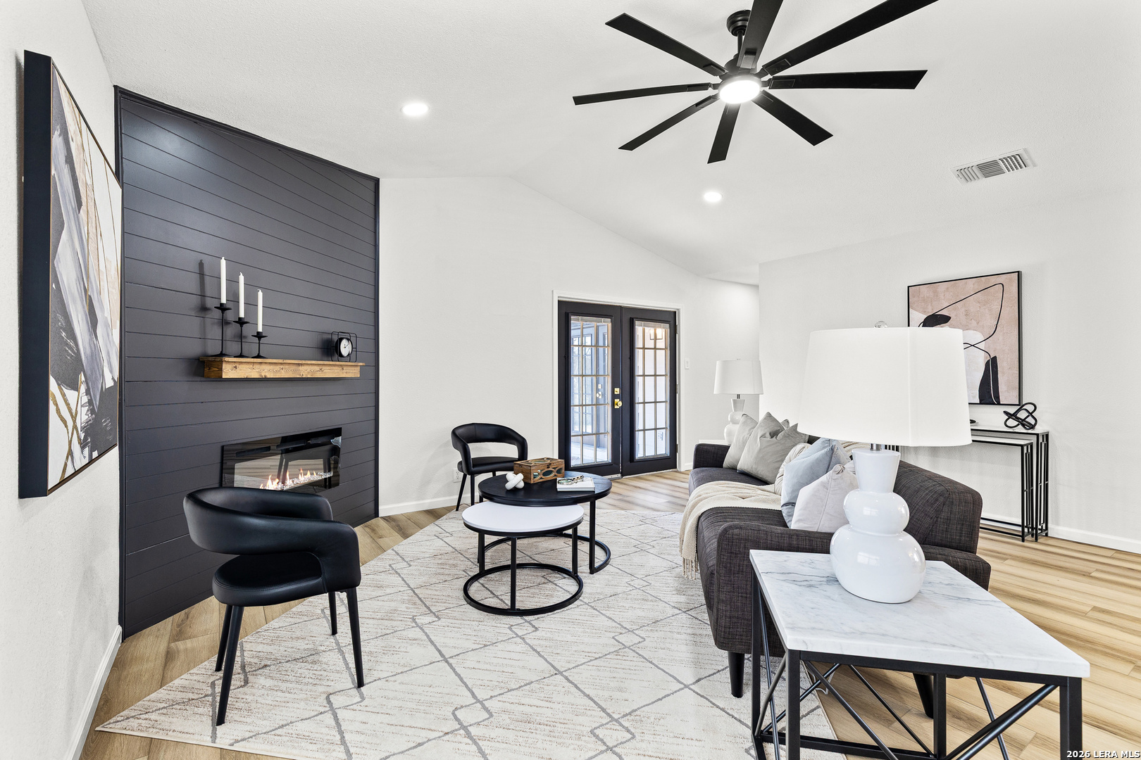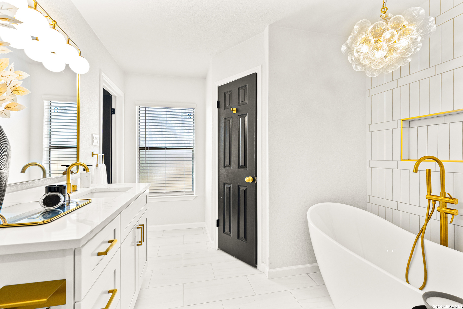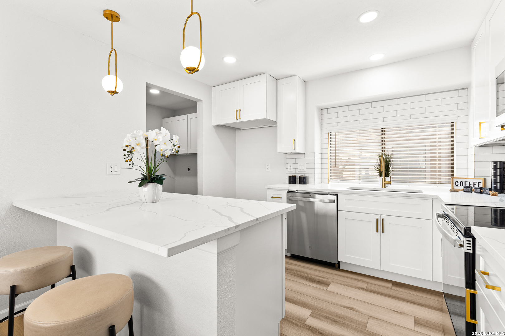 If you're looking for a home that's been tastefully updated and is truly move-in ready, this is it. From the moment you walk in, you'll notice the open layout and beautiful vinyl flooring that runs throughout the main living areas. The kitchen has been completely refreshed with white shaker cabinets, quartz countertops, subway tile backsplash, stainless steel appliances, and modern gold hardware. The peninsula offers extra prep space and bar seating perfect for casual meals or entertaining friends and family. The living room feels bright and inviting with vaulted ceilings, a sleek black accent wall, and a contemporary fireplace that adds character and warmth. It flows easily into the dining area, making it ideal for gatherings. The primary suite offers a relaxing retreat with stylish finishes and an updated ensuite bathroom featuring a freestanding soaking tub, walk-in shower, quartz countertops, and upgraded fixtures that give it a clean, modern feel. The secondary bedrooms are well-sized and versatile great for family, guests, or a home office. Out back, you'll find a spacious yard with plenty of room to relax, garden, or entertain. Location is a huge plus here with quick access to Loop 1604, IH-10, and Highway 151, you're just minutes from major shopping, dining, and entertainment at La Cantera, The Rim, and surrounding retail centers. A clean, modern update in a convenient San Antonio location ready for its next owner to enjoy.