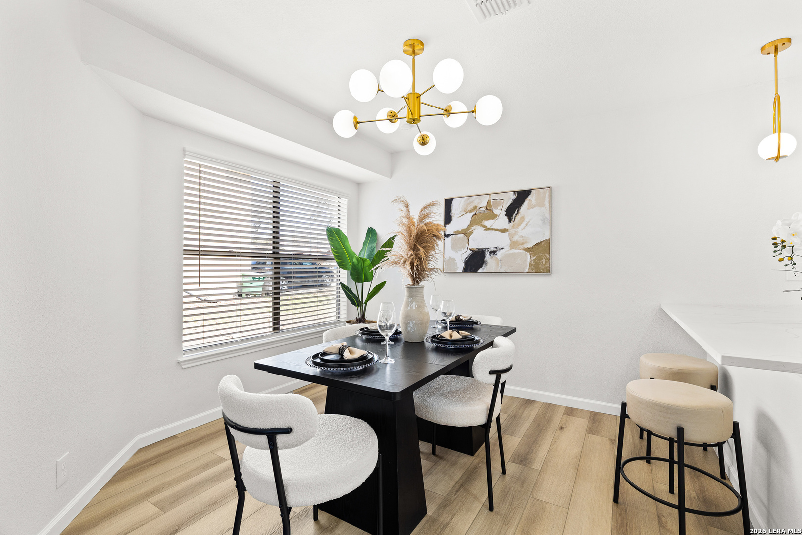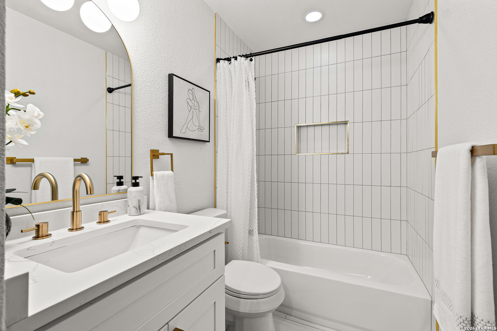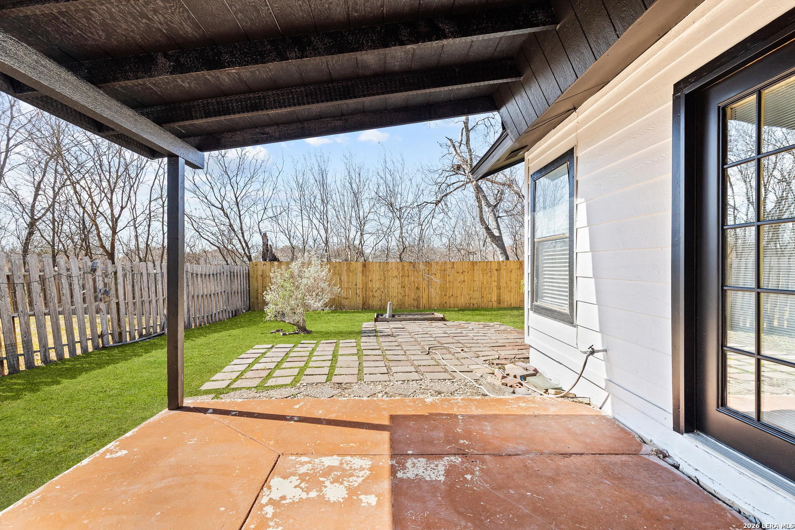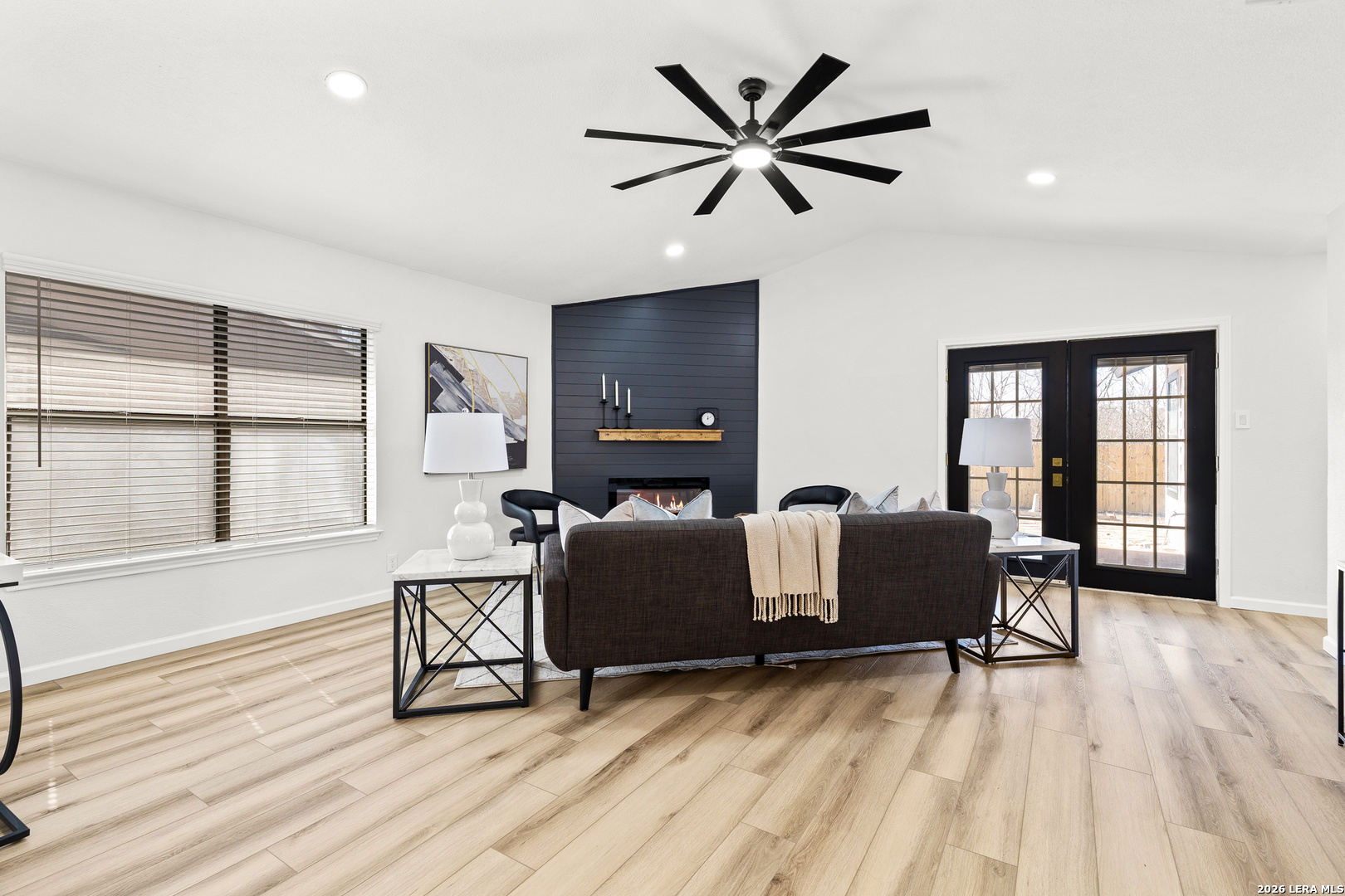If you're looking for a home that's been tastefully updated and is truly move-in ready, this is it. From the moment you walk in, you'll notice the open layout and beautiful vinyl flooring that runs throughout the main living areas. The kitchen has been completely refreshed with white shaker cabinets, quartz countertops, subway tile backsplash, stainless steel appliances, and modern gold hardware. The peninsula offers extra prep space and bar seating perfect for casual meals or entertaining friends and family. The living room feels bright and inviting with vaulted ceilings, a sleek black accent wall, and a contemporary fireplace that adds character and warmth. It flows easily into the dining area, making it ideal for gatherings. The primary suite offers a relaxing retreat with stylish finishes and an updated ensuite bathroom featuring a freestanding soaking tub, walk-in shower, quartz countertops, and upgraded fixtures that give it a clean, modern feel. The secondary bedrooms are well-sized and versatile great for family, guests, or a home office. Out back, you'll find a spacious yard with plenty of room to relax, garden, or entertain. Location is a huge plus here with quick access to Loop 1604, IH-10, and Highway 151, you're just minutes from major shopping, dining, and entertainment at La Cantera, The Rim, and surrounding retail centers. A clean, modern update in a convenient San Antonio location ready for its next owner to enjoy.