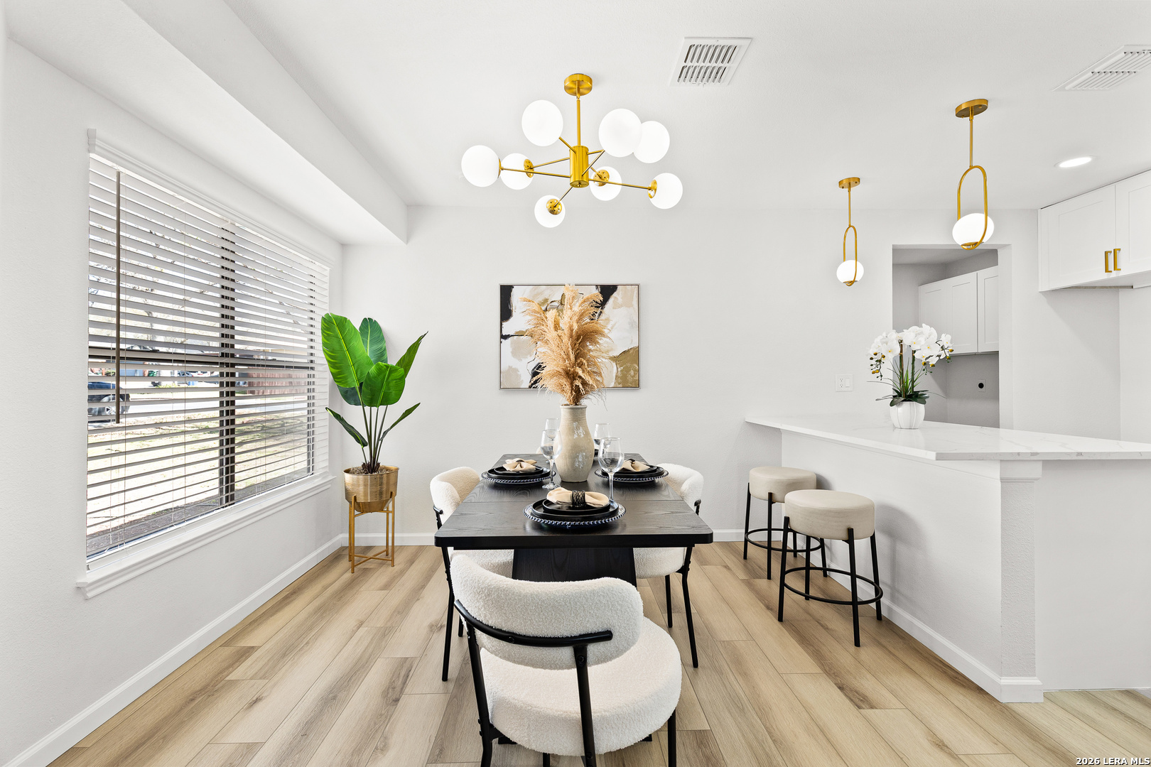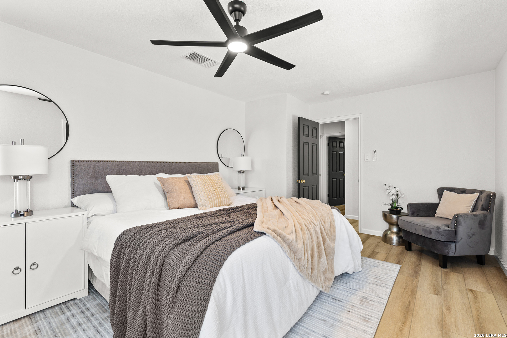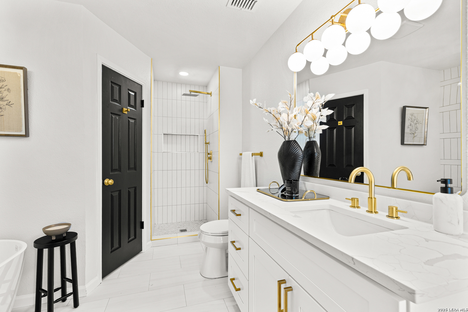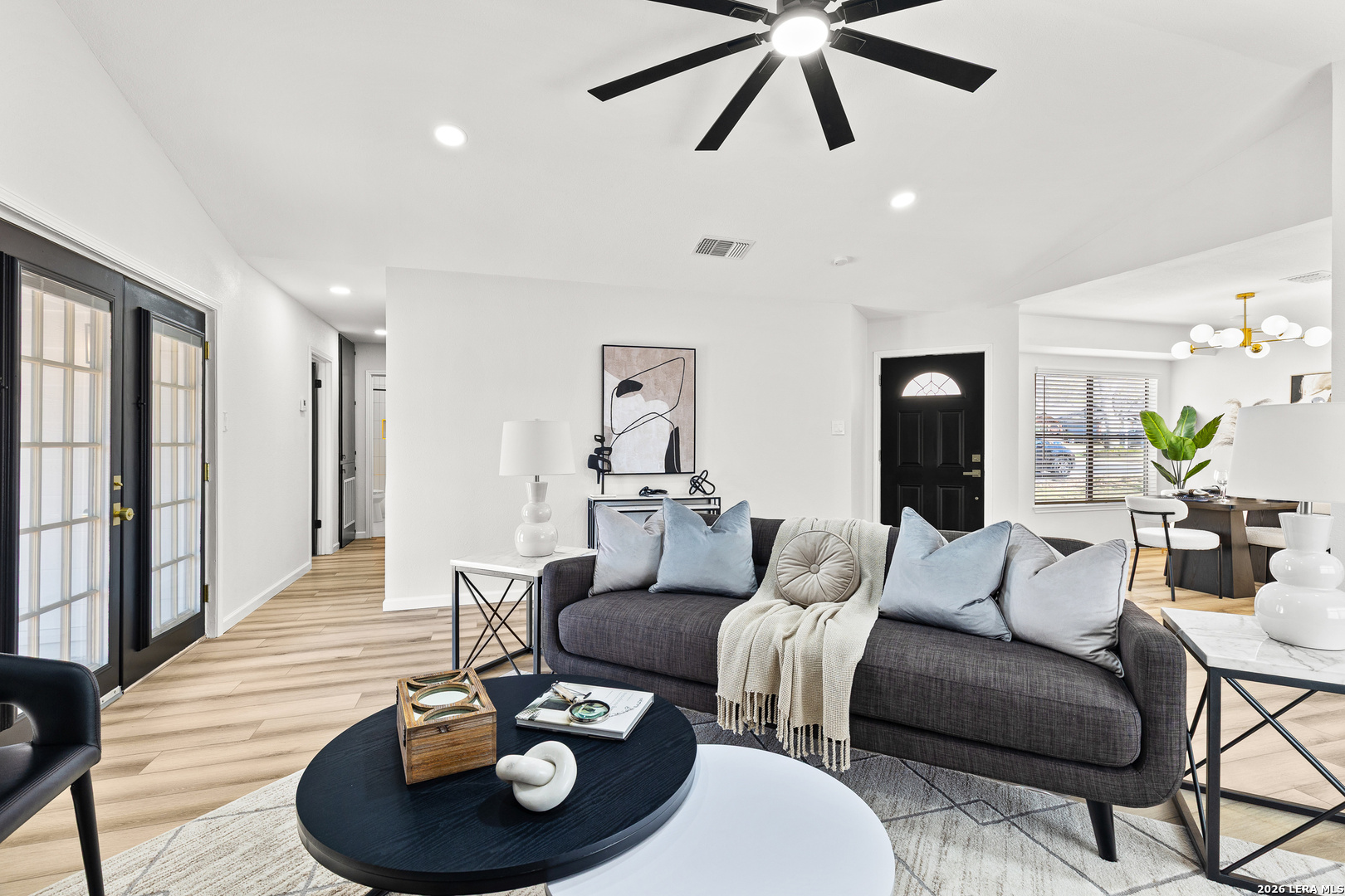 If you're looking for a home that's been tastefully updated and is truly move-in ready, this is it. From the moment you walk in, you'll notice the open layout and beautiful vinyl flooring that runs throughout the main living areas. The kitchen has been completely refreshed with white shaker cabinets, quartz countertops, subway tile backsplash, stainless steel appliances, and modern gold hardware. The peninsula offers extra prep space and bar seating perfect for casual meals or entertaining friends and family. The living room feels bright and inviting with vaulted ceilings, a sleek black accent wall, and a contemporary fireplace that adds character and warmth. It flows easily into the dining area, making it ideal for gatherings. The primary suite offers a relaxing retreat with stylish finishes and an updated ensuite bathroom featuring a freestanding soaking tub, walk-in shower, quartz countertops, and upgraded fixtures that give it a clean, modern feel. The secondary bedrooms are well-sized and versatile great for family, guests, or a home office. Out back, you'll find a spacious yard with plenty of room to relax, garden, or entertain. Location is a huge plus here with quick access to Loop 1604, IH-10, and Highway 151, you're just minutes from major shopping, dining, and entertainment at La Cantera, The Rim, and surrounding retail centers. A clean, modern update in a convenient San Antonio location ready for its next owner to enjoy.