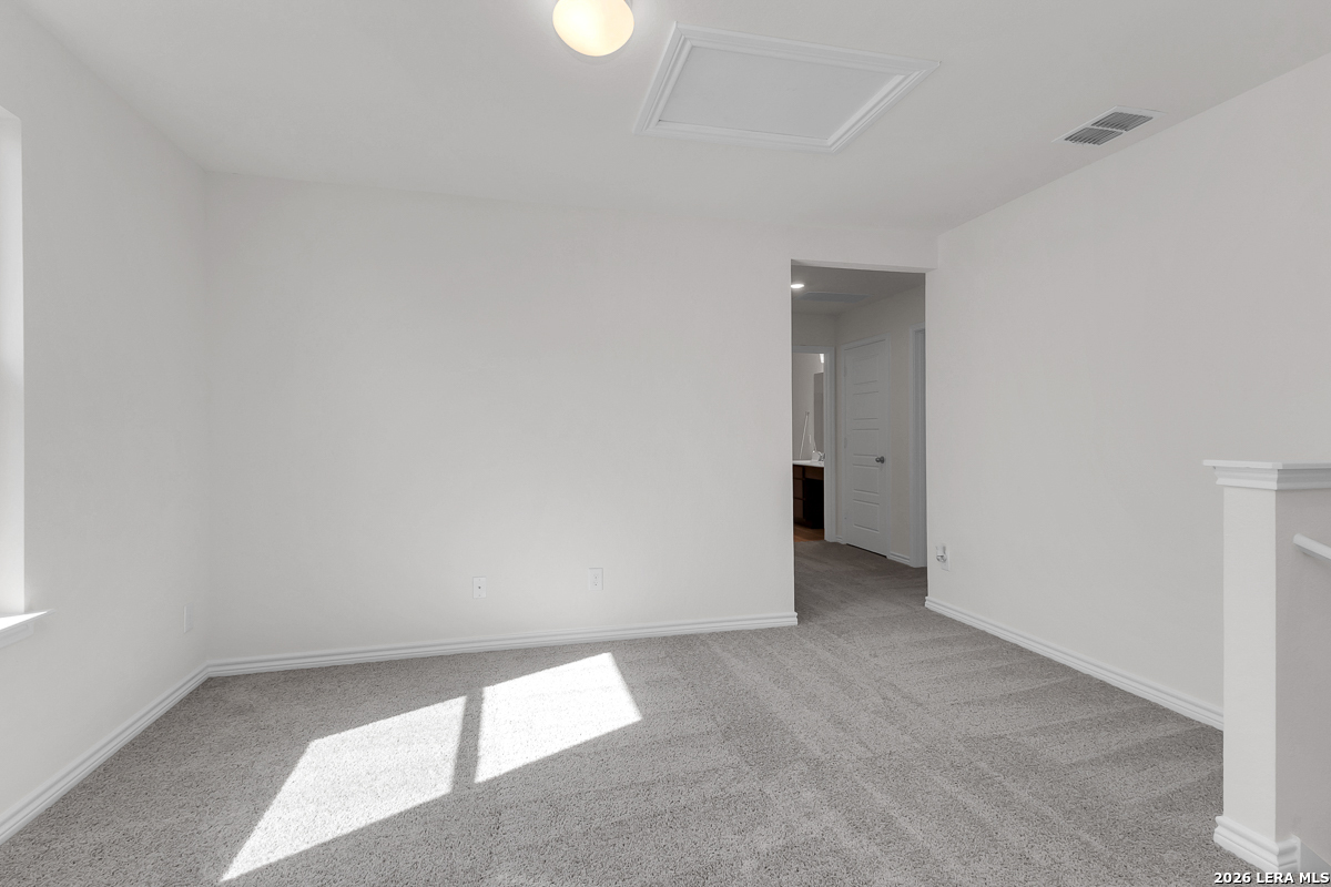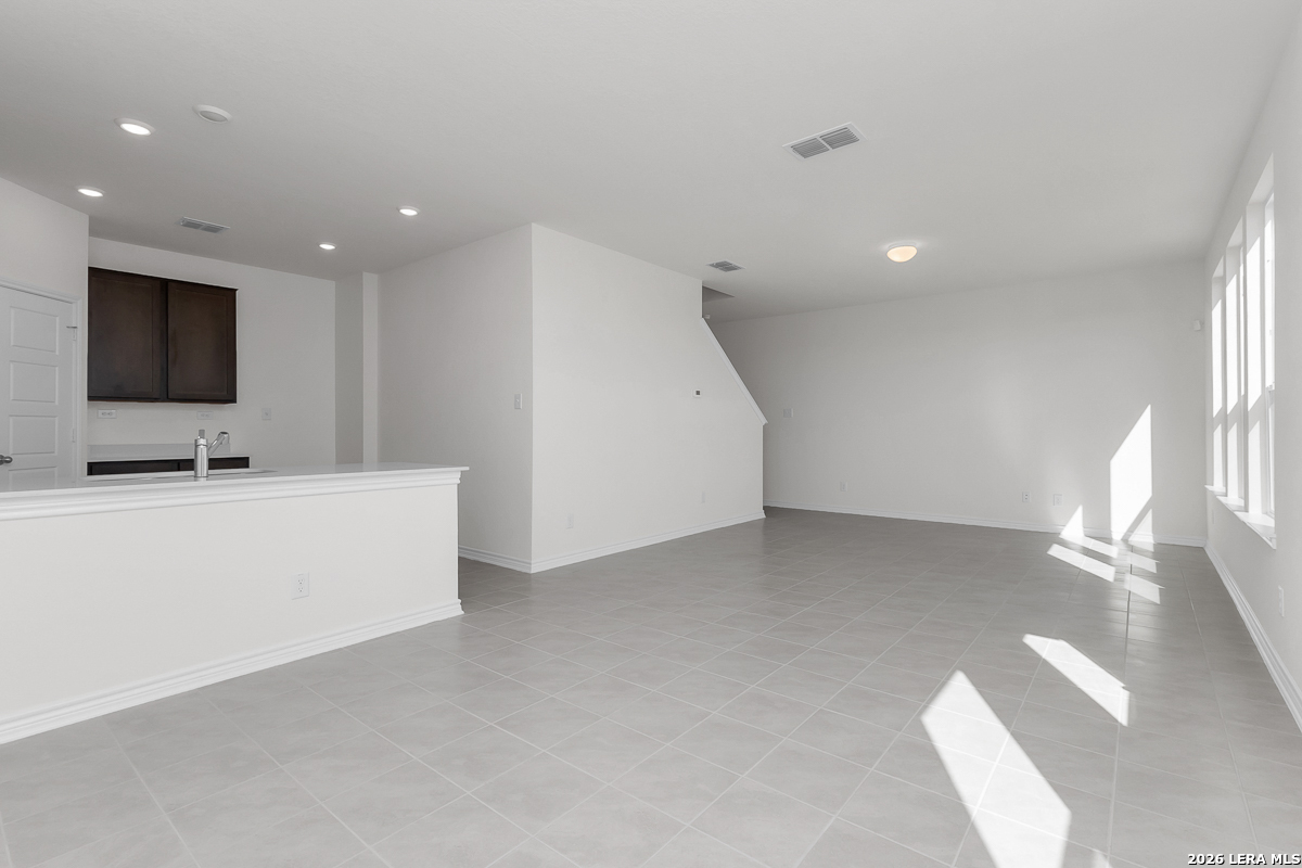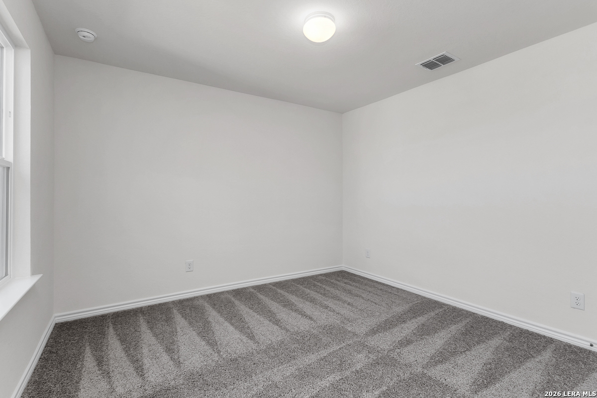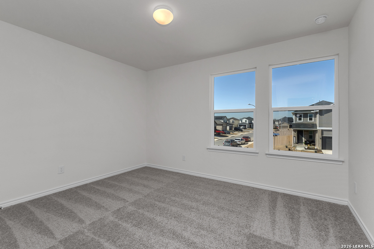 This inviting home features 9-ft. first floor ceilings that create a spacious and open atmosphere. The kitchen is both stylish and functional with Whirlpool stainless steel appliances, Woodmont Dakota Shaker panel 42-in. upper cabinets, and Silestone countertops in Linen Cream. The primary bath offers a relaxing escape with upgraded cabinets and a 42-in. garden tub/shower surrounded by Daltile tile. Elegant details include a Carrara-style entry door, Kwikset Polo knob interior hardware, and C.F. Choice ceramic tile flooring throughout the bathrooms, kitchen, and living room. Enjoy added peace of mind with a wireless security system, plus a fully sodded yard and automatic sprinkler system.