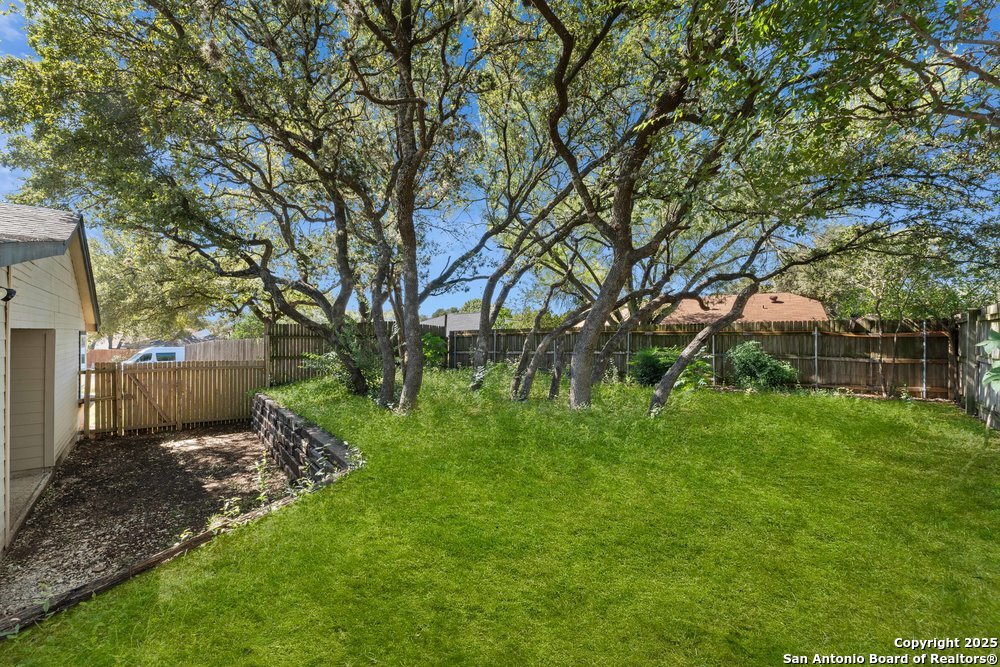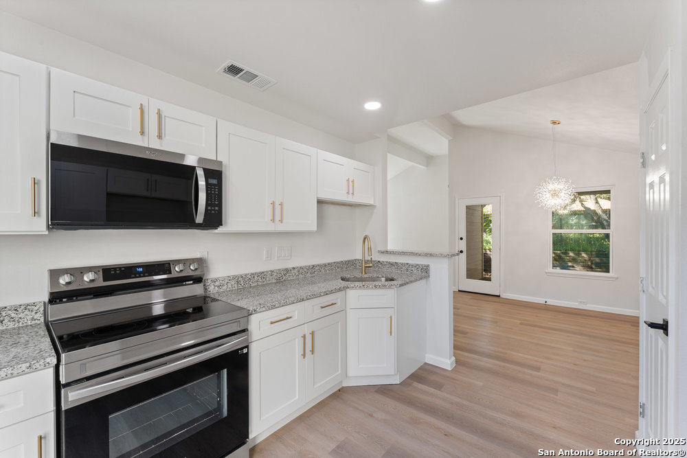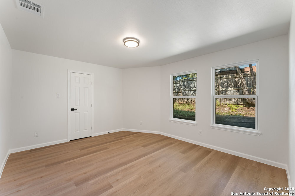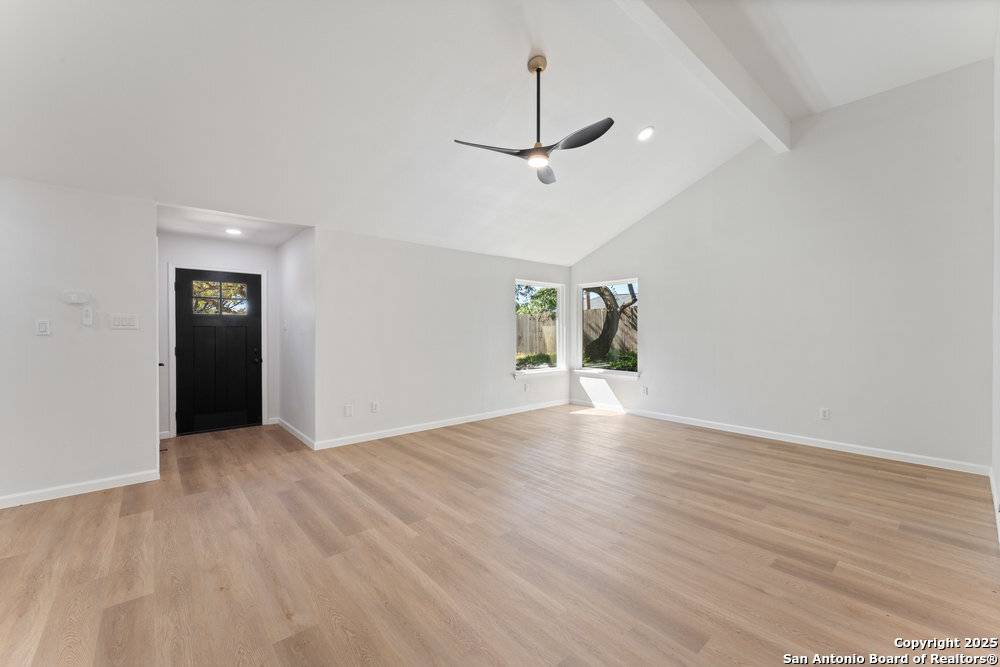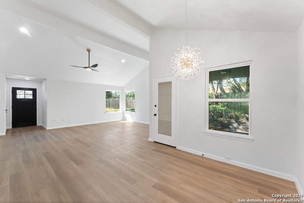 This beautifully reimagined 3-bedroom, 2-bathroom home in San Antonio's sought-after Great Northwest Community offers 1,455 square feet of completely rebuilt living space on a spacious 0.18-acre lot. Taken down to the studs and reconstructed in 2025, every detail has been thoughtfully curated for modern comfort and timeless style. The brick-front exterior and attached 2-car garage offer classic curb appeal, while a fully fenced backyard provides privacy and space for outdoor enjoyment. Inside, vaulted ceilings and recessed lighting highlight an open floor plan that flows seamlessly through the living and dining areas. Light oak luxury vinyl plank flooring adds warmth throughout the home, complemented by modern finishes and fixtures. The kitchen features granite countertops, white cabinetry, gold accents, and brand-new Whirlpool stainless steel appliances. Sliding glass doors off the kitchen lead to a cozy patio, perfect for morning coffee or winding down in the evening. The spacious primary suite includes a walk-in closet, a ceiling fan, and a spa-inspired ensuite bath featuring a walk-in shower and dual granite-topped vanities. Two additional bedrooms also offer walk-in closets and share a sleek, fully updated secondary bathroom with a shower/tub combination and coordinating finishes. Additional highlights include a new asphalt shingle roof, all-new windows, doors, plumbing, electrical systems, lighting, and decorative tile in both bathrooms. The home has been freshly painted inside and out for a clean, modern look. Located just minutes from Zachry Middle School, Walmart Supercenter, HEB, and a variety of local restaurants, this move-in-ready home delivers high-end updates in a well-established neighborhood. Schedule your private showing today.