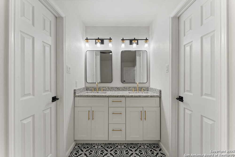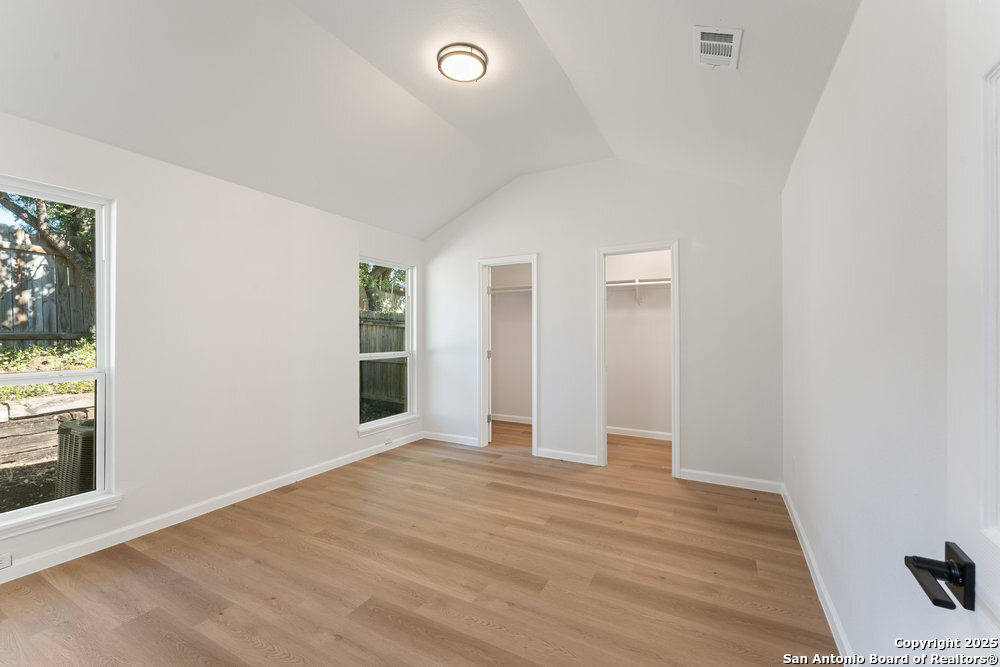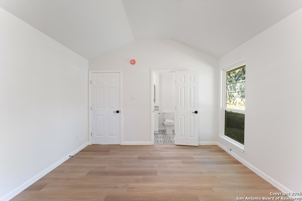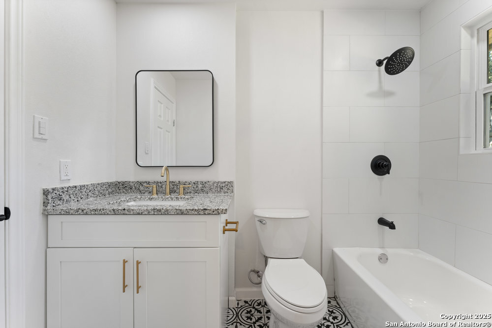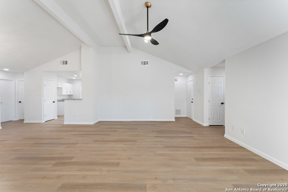 This beautifully reimagined 3-bedroom, 2-bathroom home in San Antonio's sought-after Great Northwest Community offers 1,455 square feet of completely rebuilt living space on a spacious 0.18-acre lot. Taken down to the studs and reconstructed in 2025, every detail has been thoughtfully curated for modern comfort and timeless style. The brick-front exterior and attached 2-car garage offer classic curb appeal, while a fully fenced backyard provides privacy and space for outdoor enjoyment. Inside, vaulted ceilings and recessed lighting highlight an open floor plan that flows seamlessly through the living and dining areas. Light oak luxury vinyl plank flooring adds warmth throughout the home, complemented by modern finishes and fixtures. The kitchen features granite countertops, white cabinetry, gold accents, and brand-new Whirlpool stainless steel appliances. Sliding glass doors off the kitchen lead to a cozy patio, perfect for morning coffee or winding down in the evening. The spacious primary suite includes a walk-in closet, a ceiling fan, and a spa-inspired ensuite bath featuring a walk-in shower and dual granite-topped vanities. Two additional bedrooms also offer walk-in closets and share a sleek, fully updated secondary bathroom with a shower/tub combination and coordinating finishes. Additional highlights include a new asphalt shingle roof, all-new windows, doors, plumbing, electrical systems, lighting, and decorative tile in both bathrooms. The home has been freshly painted inside and out for a clean, modern look. Located just minutes from Zachry Middle School, Walmart Supercenter, HEB, and a variety of local restaurants, this move-in-ready home delivers high-end updates in a well-established neighborhood. Schedule your private showing today.