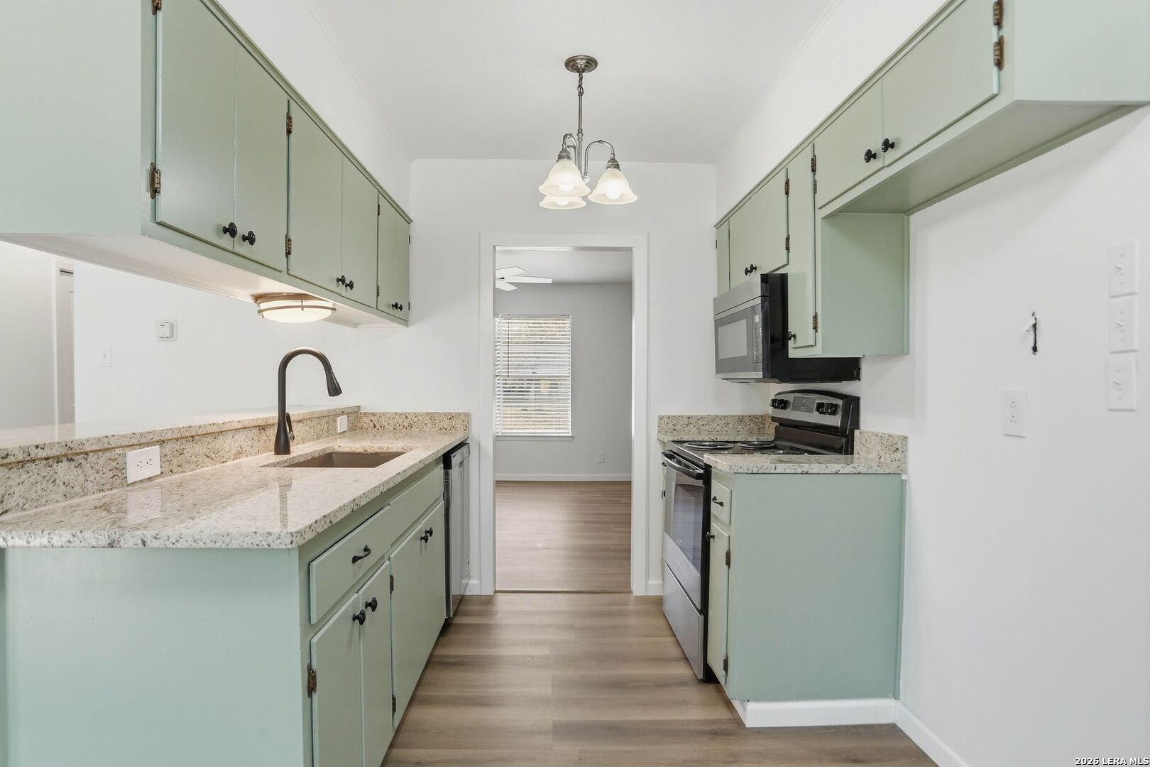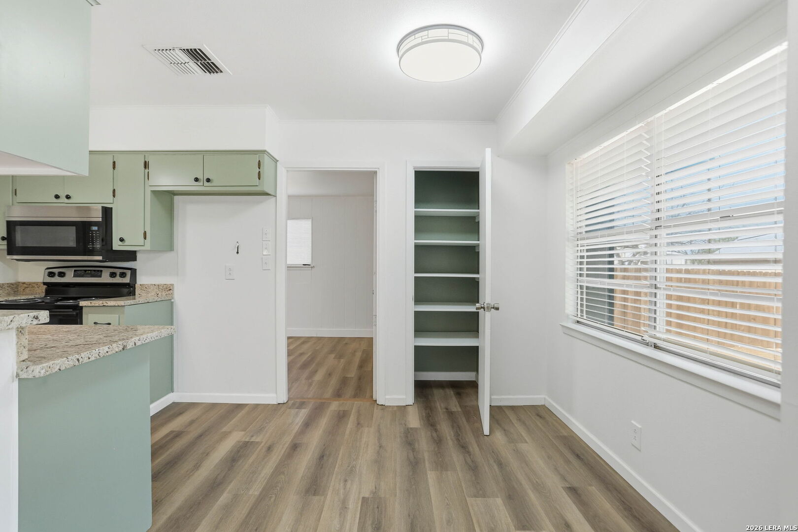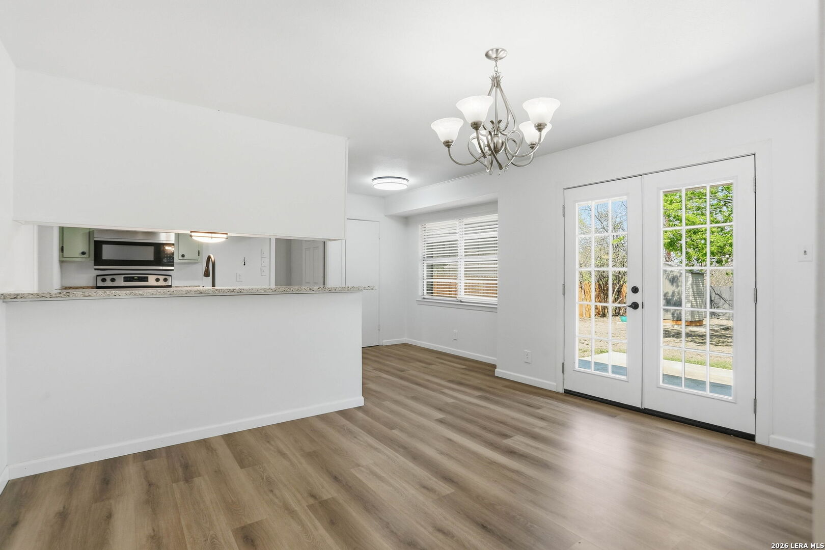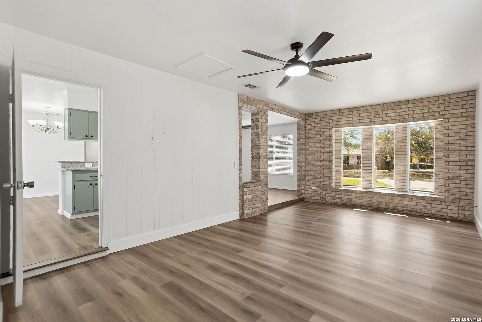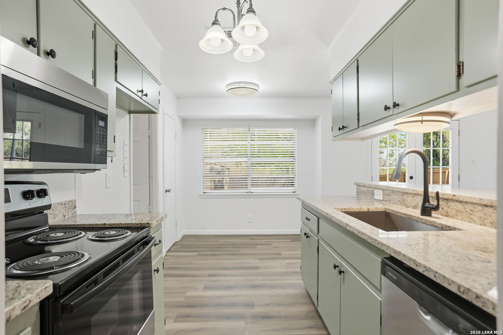 FULLY UPDATED 3BD/1.5BA GEM LOCATED IN AN ESTABLISHED NE SAN ANTONIO NEIGHBORHOOD - MOVE-IN READY WITH STYLISH FINISHES THROUGHOUT! NEW VINYL PLANK FLOORING FLOWS SEAMLESSLY THROUGH THE HOME, COMPLEMENTED BY FRESH INTERIOR PAINT AND UPDATED LIGHTING INCLUDING CHANDELIERS AND MODERN CEILING FANS. THE GALLEY KITCHEN STANDS OUT WITH BEAUTIFUL SAGE GREEN CABINETRY, GRANITE COUNTERTOPS, A DEEP UNDERMOUNT SINK WITH MATTE BLACK FAUCET, STAINLESS STEEL APPLIANCES, AND A BUILT-IN PANTRY FOR ADDED STORAGE. OPEN LIVING ROOM AND ADDITIONAL FAMILY ROOM. TWO EATING AREAS, ONE IS A BREAKFAST NOOK AND THEN SEPARATE DINING AREA FEATURE A STRIKING EXPOSED BRICK ACCENT WALL WITH PASS-THROUGH WINDOWS - A TRUE STATEMENT PIECE THAT ADDS CHARACTER AND CHARM. BATHROOMS HAVE BEEN THOUGHTFULLY UPDATED WITH NEW VANITIES, WHITE GRANITE COUNTERTOPS, MATTE BLACK FIXTURES, AND JACK AND JILL STYLE BATHROOM SO THAT YOUR COMPANY HAS ACCESS WITHOUT COMING INTO YOUR PERSONAL SPACE. SPACIOUS BEDROOMS OFFER ABUNDANT NATURAL LIGHT, LARGE WINDOWS, AND CEILING FANS IN EVERY ROOM FOR COMFORT. THE BEST PART IS THAT IT IS CONVENIENTLY LOCATED JUST MINUTES FROM SAT AIRPORT AND WITH EASY ACCESS TO TWO MAJOR INTERSTATES - IDEAL FOR COMMUTERS. ESTABLISHED NEIGHBORHOOD, MODERN UPDATES, AND AN UNBEATABLE LOCATION. THIS ONE WON'T LAST!