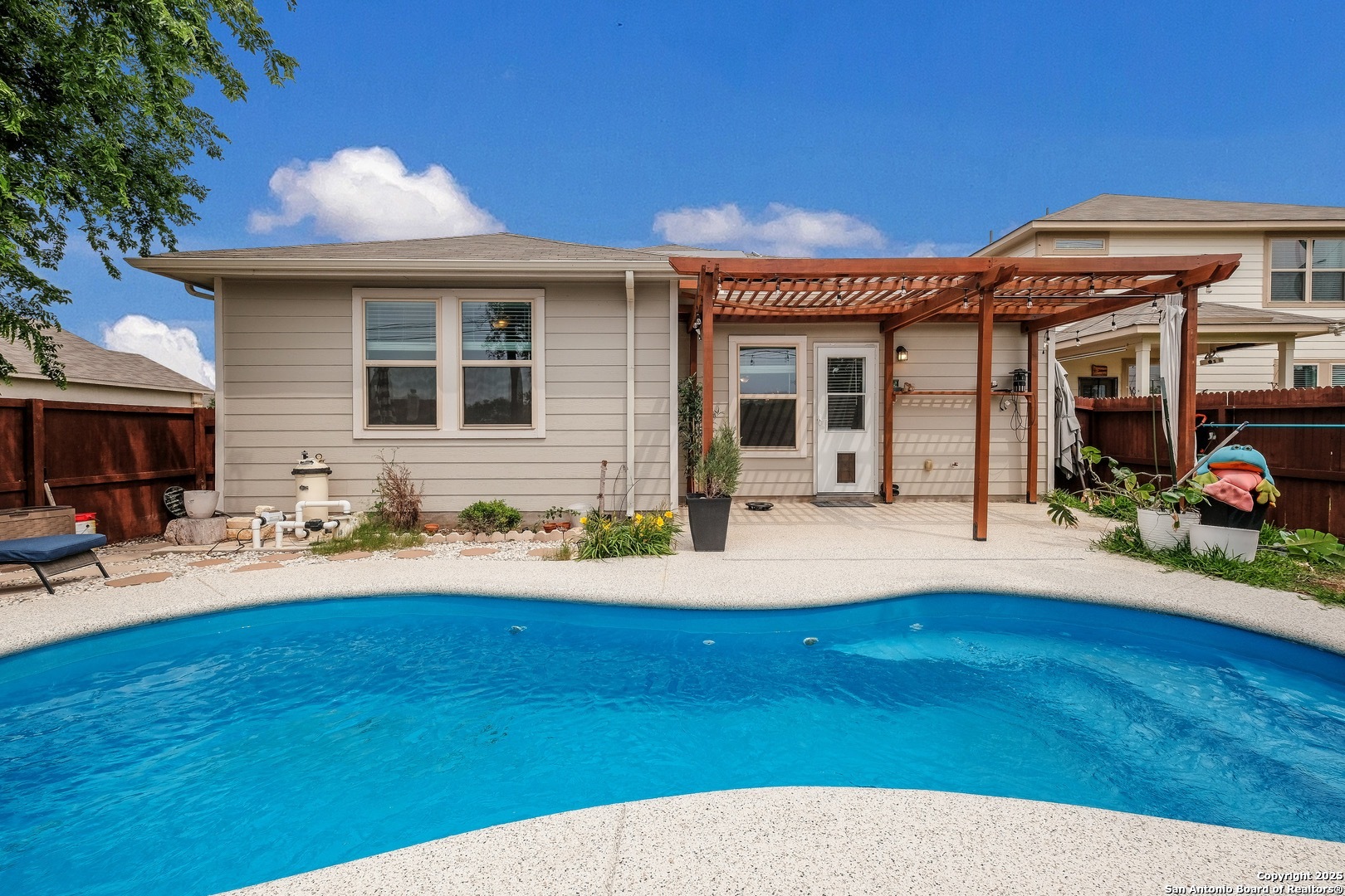 Get ready for our hot Texas Summers. Dive into your very own oasis with this beautiful 3-bedroom, 2-bath home complete with a fantastic saltwater pool and pool furniture. Enjoy the benefits of solar panels offering dramatic savings on San Antonio's high electricity bills. Upon entering, you'll be greeted by an open floor plan that radiates natural light, creating a bright and welcoming atmosphere. The inviting kitchen is the heart of the home, perfect for family gatherings. It boasts solid countertops, an island kitchen with a breakfast bar,