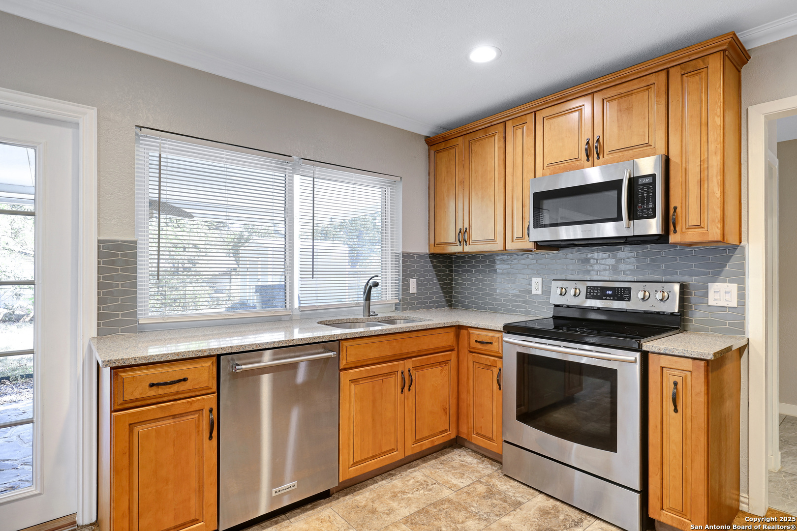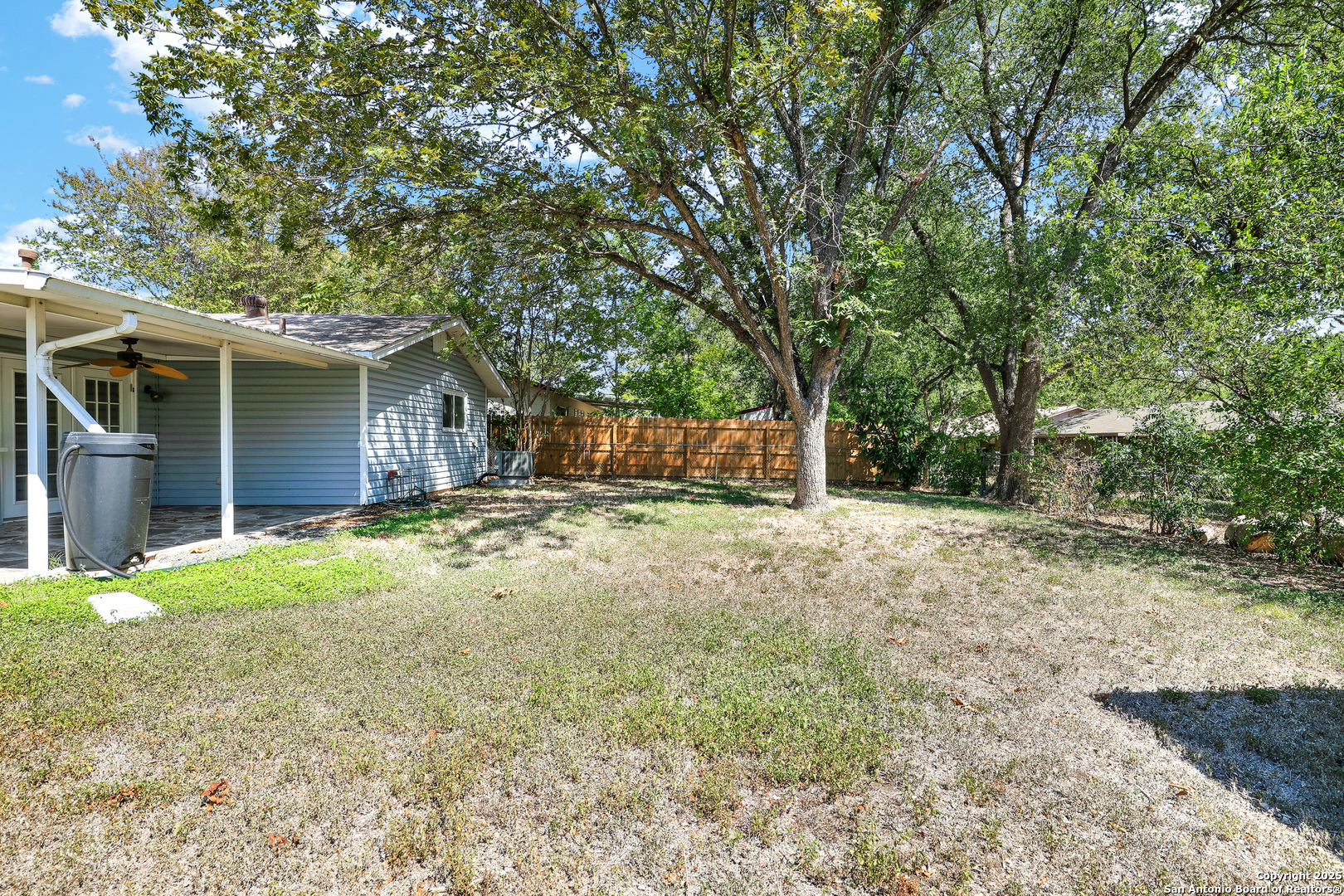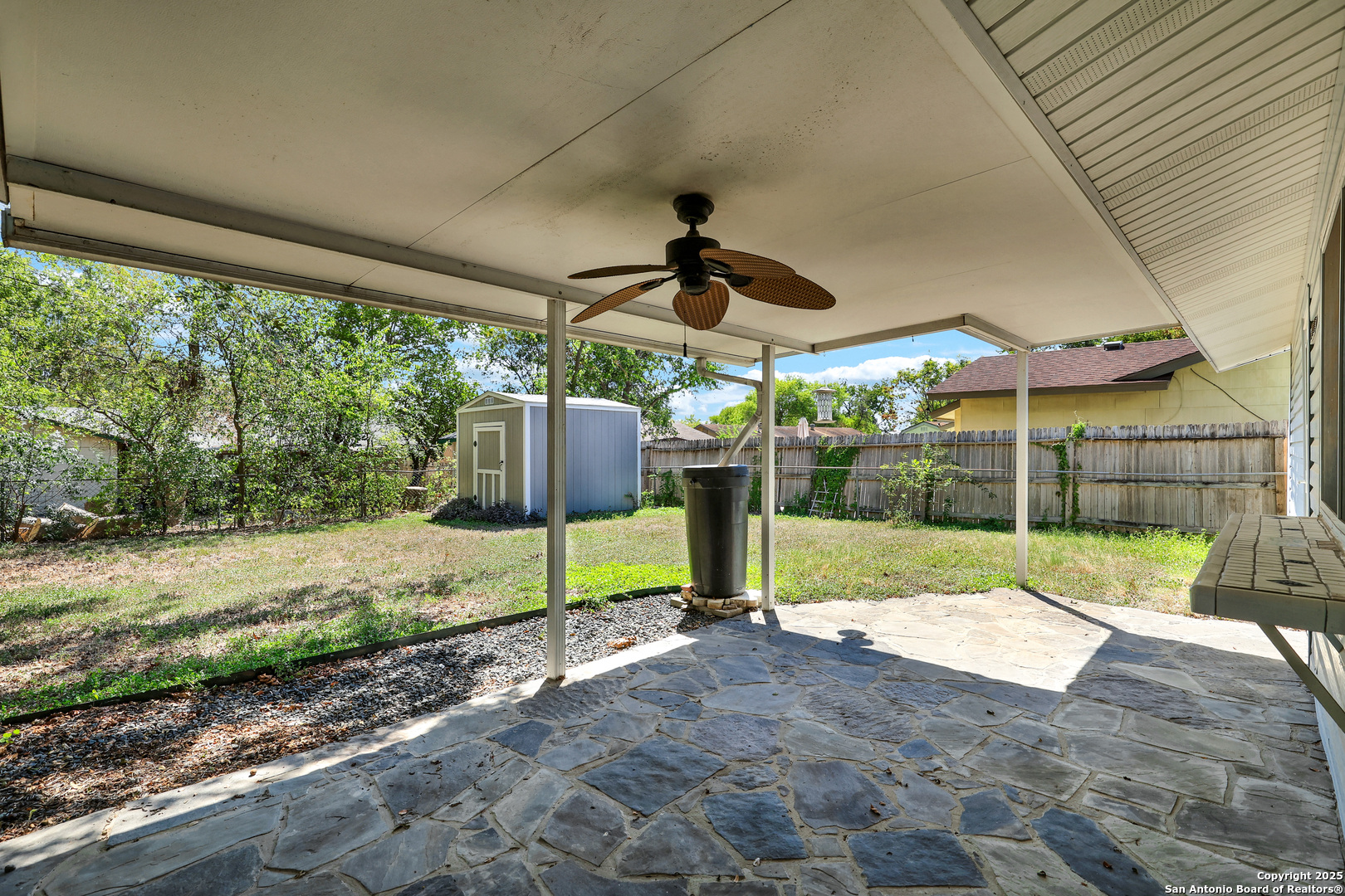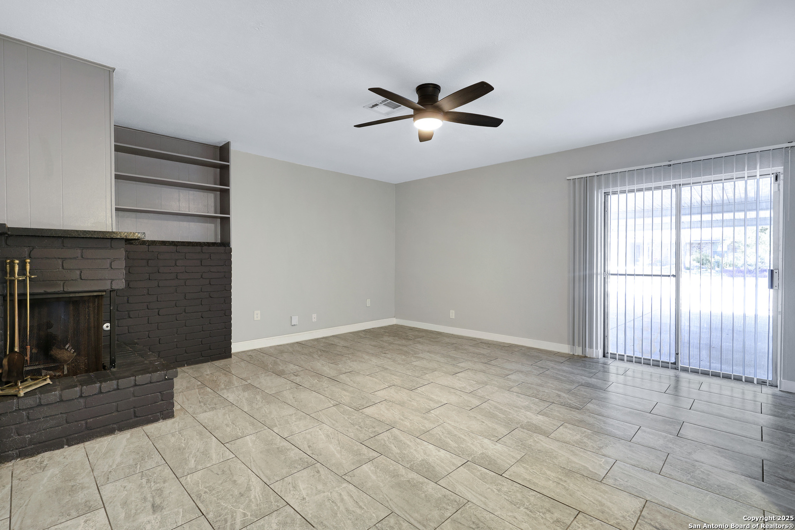 Beautifully updated single-story home offering convenient access to Lackland AFB, the 151 business corridor, Sea World, shopping, dining, and more. This residence features no carpet, with ceramic tile and luxury vinyl flooring throughout for style and easy maintenance. The versatile front room may serve as a living area or formal dining space, while the converted garage provides an additional living space to suit your needs. The kitchen has been fully updated and includes a refrigerator, generous cabinet storage, and expansive counter space. A washer and dryer are also included for added convenience. The primary suite showcases a custom closet and an en suite bath with a beautifully renovated walk-in shower. Outdoors, enjoy a spacious yard enhanced by mature trees, a covered patio ideal for relaxation, and a storage shed.
