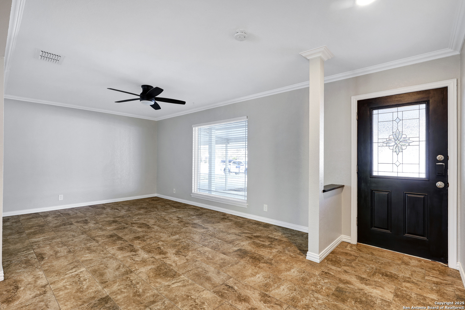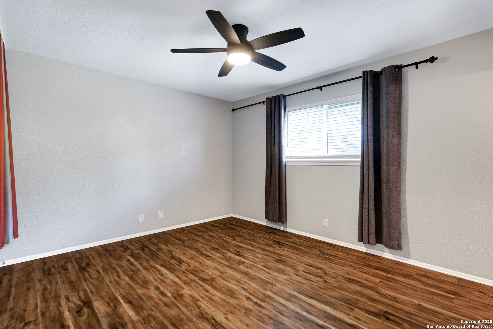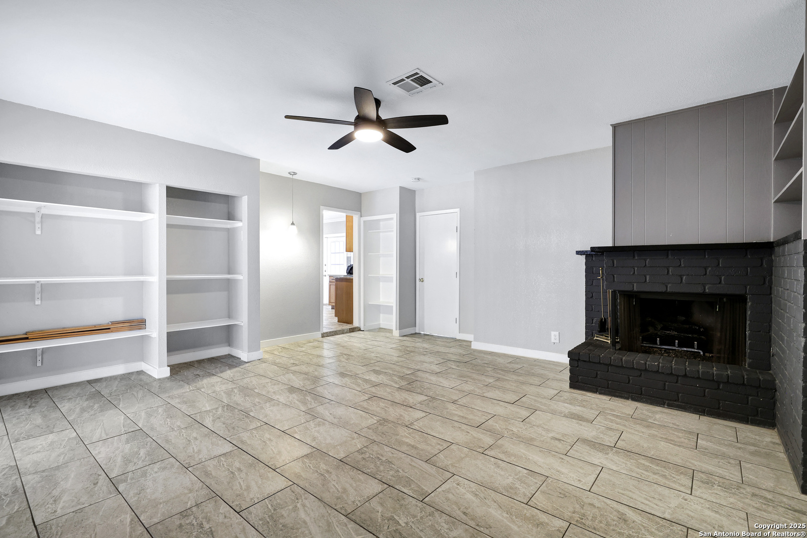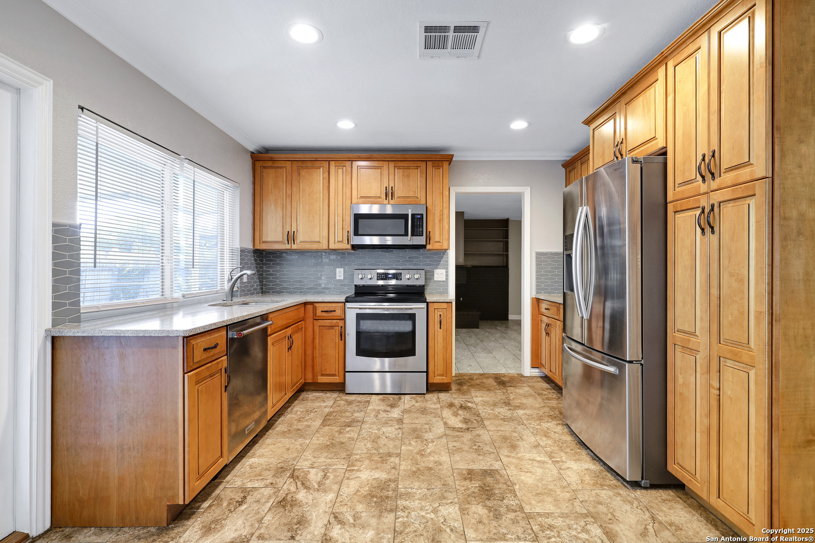Beautifully updated single-story home offering convenient access to Lackland AFB, the 151 business corridor, Sea World, shopping, dining, and more. This residence features no carpet, with ceramic tile and luxury vinyl flooring throughout for style and easy maintenance. The versatile front room may serve as a living area or formal dining space, while the converted garage provides an additional living space to suit your needs. The kitchen has been fully updated and includes a refrigerator, generous cabinet storage, and expansive counter space. A washer and dryer are also included for added convenience. The primary suite showcases a custom closet and an en suite bath with a beautifully renovated walk-in shower. Outdoors, enjoy a spacious yard enhanced by mature trees, a covered patio ideal for relaxation, and a storage shed.