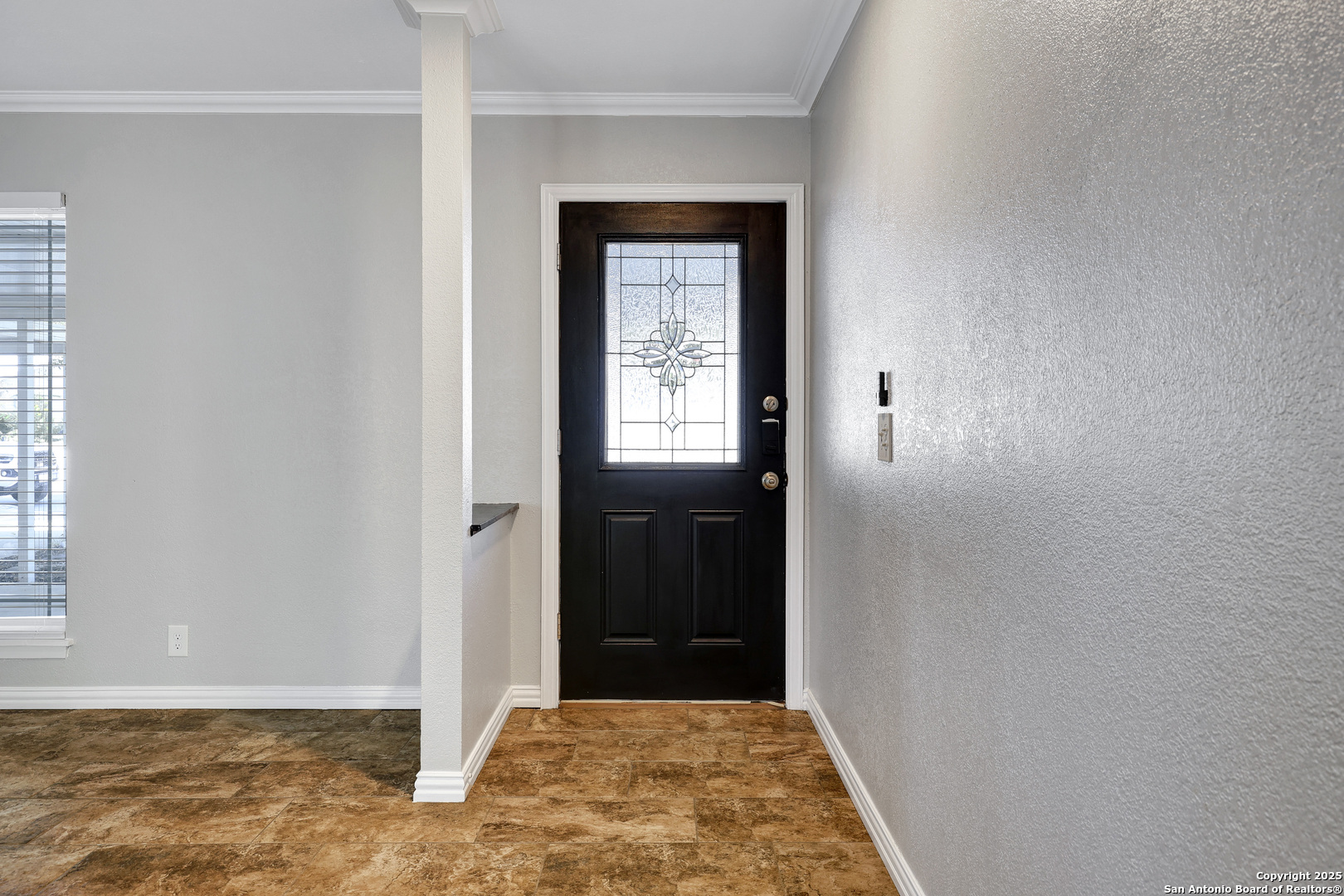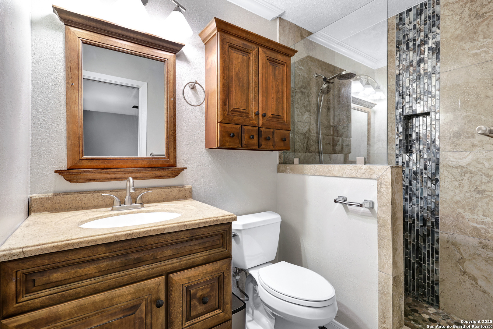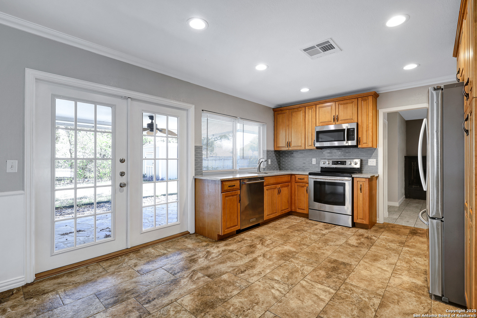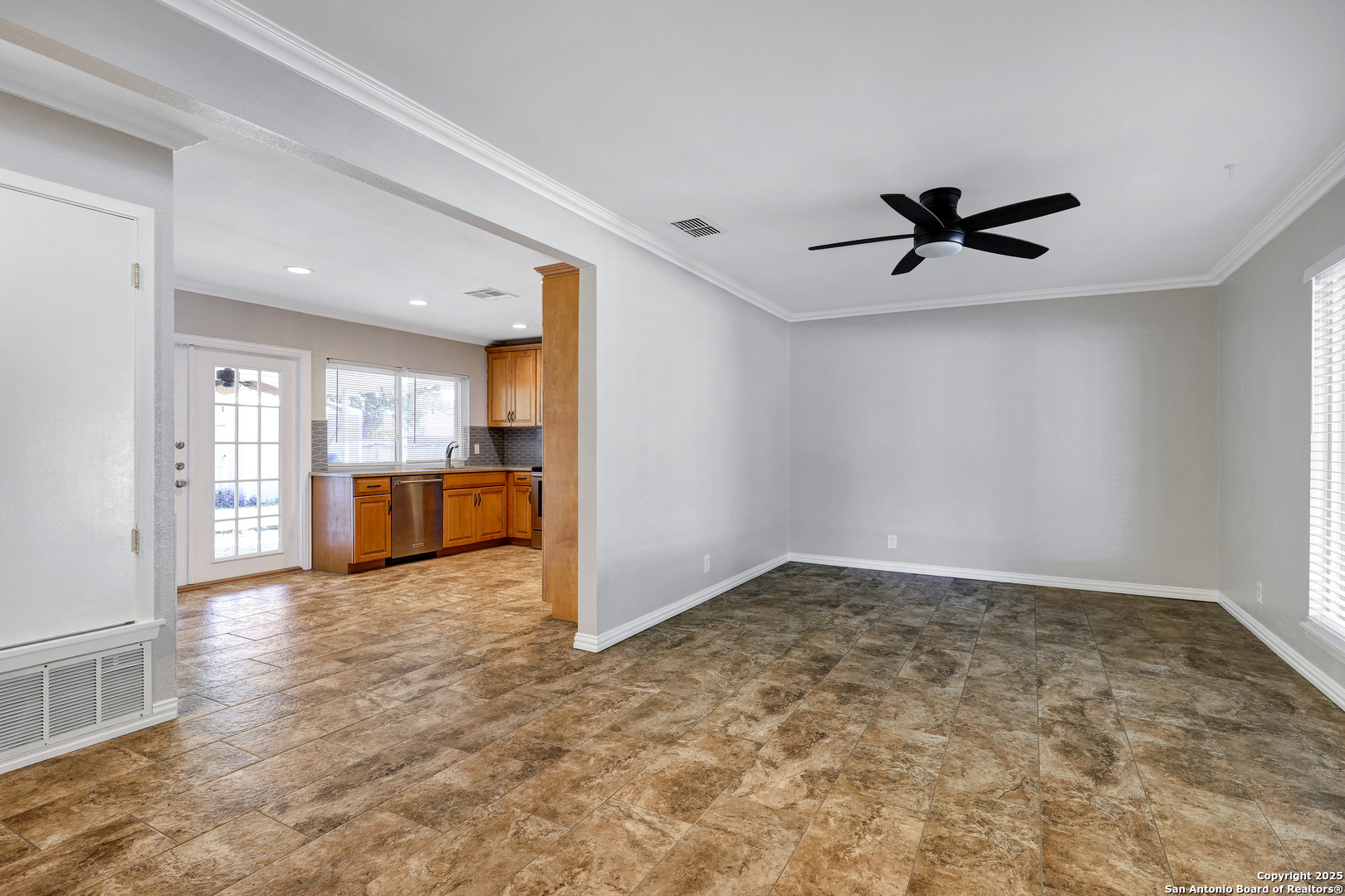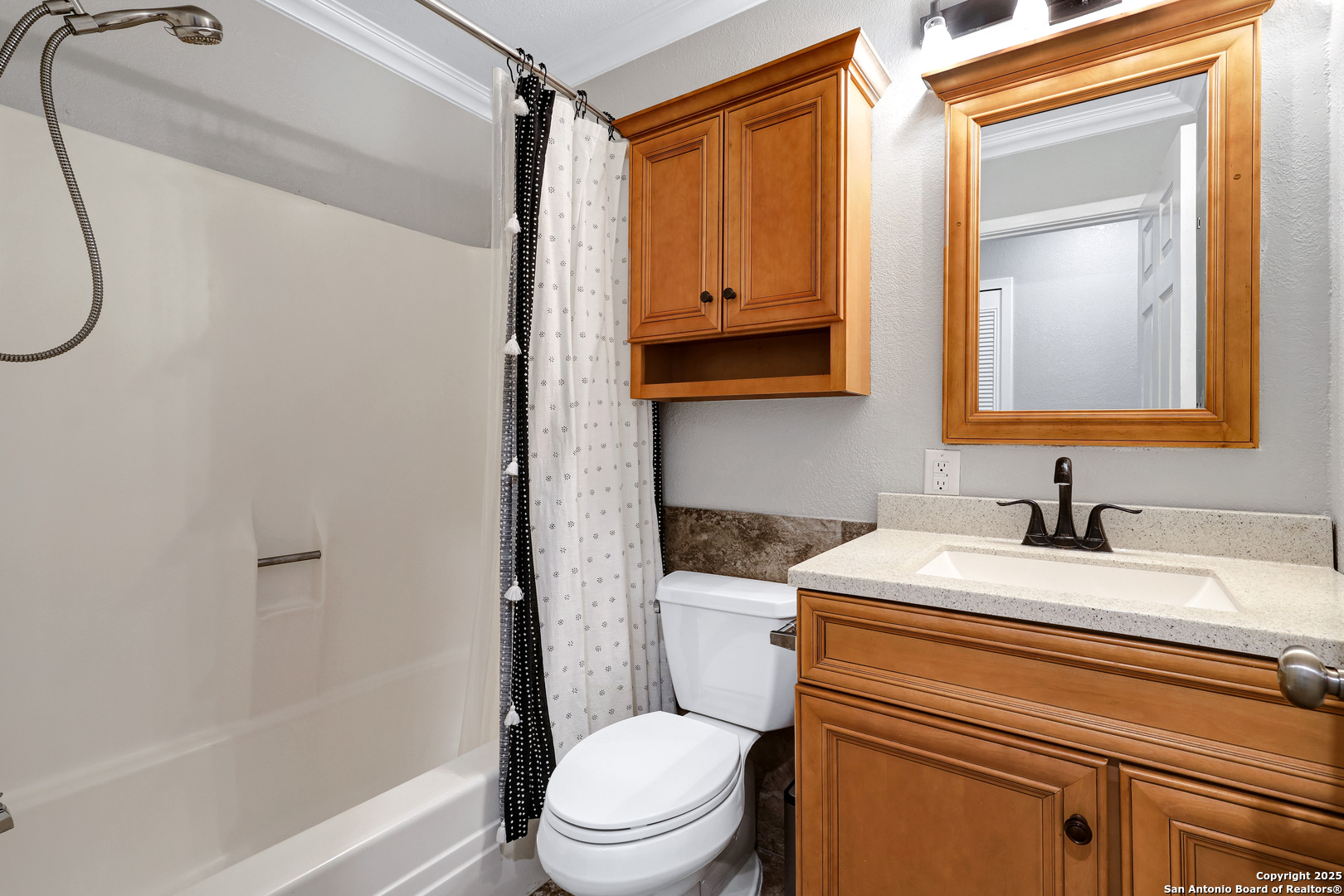 Beautifully updated single-story home offering convenient access to Lackland AFB, the 151 business corridor, Sea World, shopping, dining, and more. This residence features no carpet, with ceramic tile and luxury vinyl flooring throughout for style and easy maintenance. The versatile front room may serve as a living area or formal dining space, while the converted garage provides an additional living space to suit your needs. The kitchen has been fully updated and includes a refrigerator, generous cabinet storage, and expansive counter space. A washer and dryer are also included for added convenience. The primary suite showcases a custom closet and an en suite bath with a beautifully renovated walk-in shower. Outdoors, enjoy a spacious yard enhanced by mature trees, a covered patio ideal for relaxation, and a storage shed.