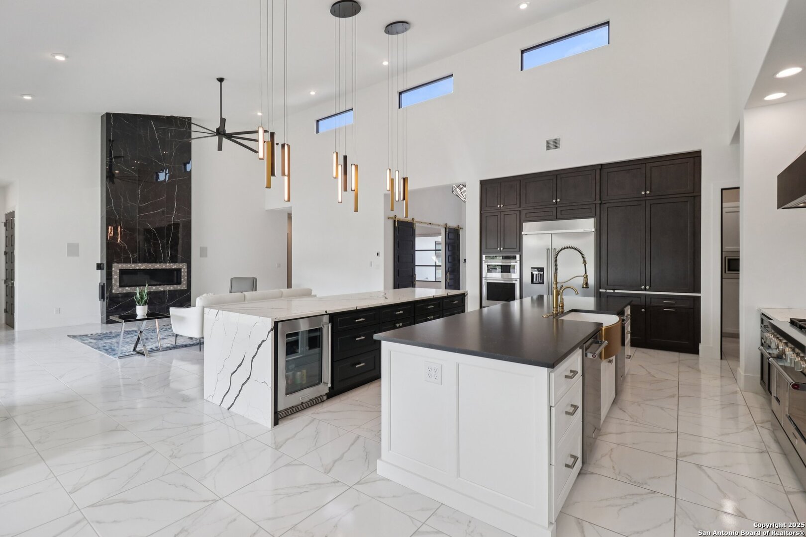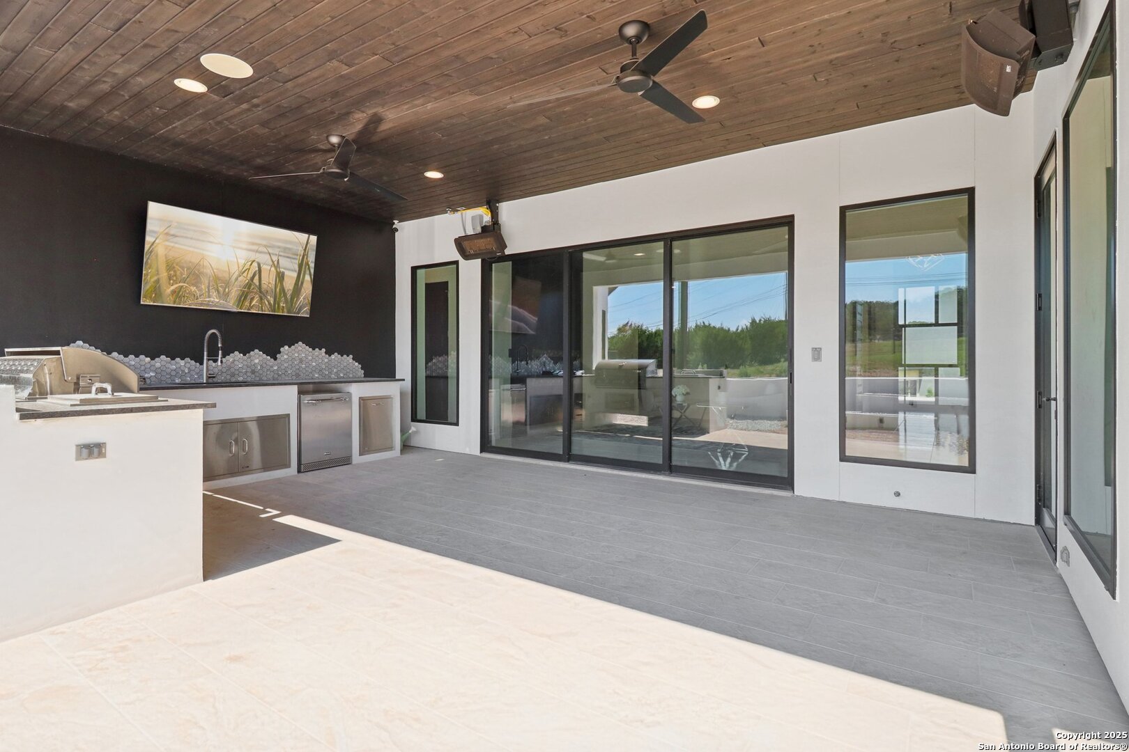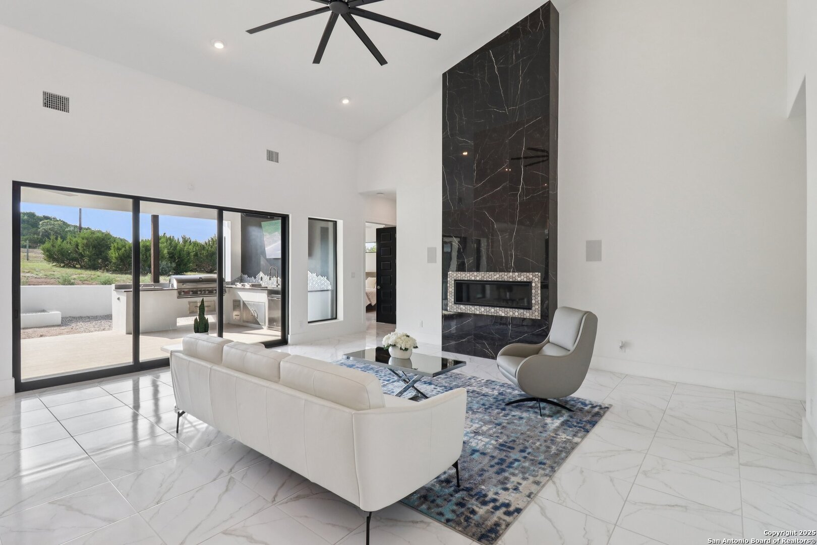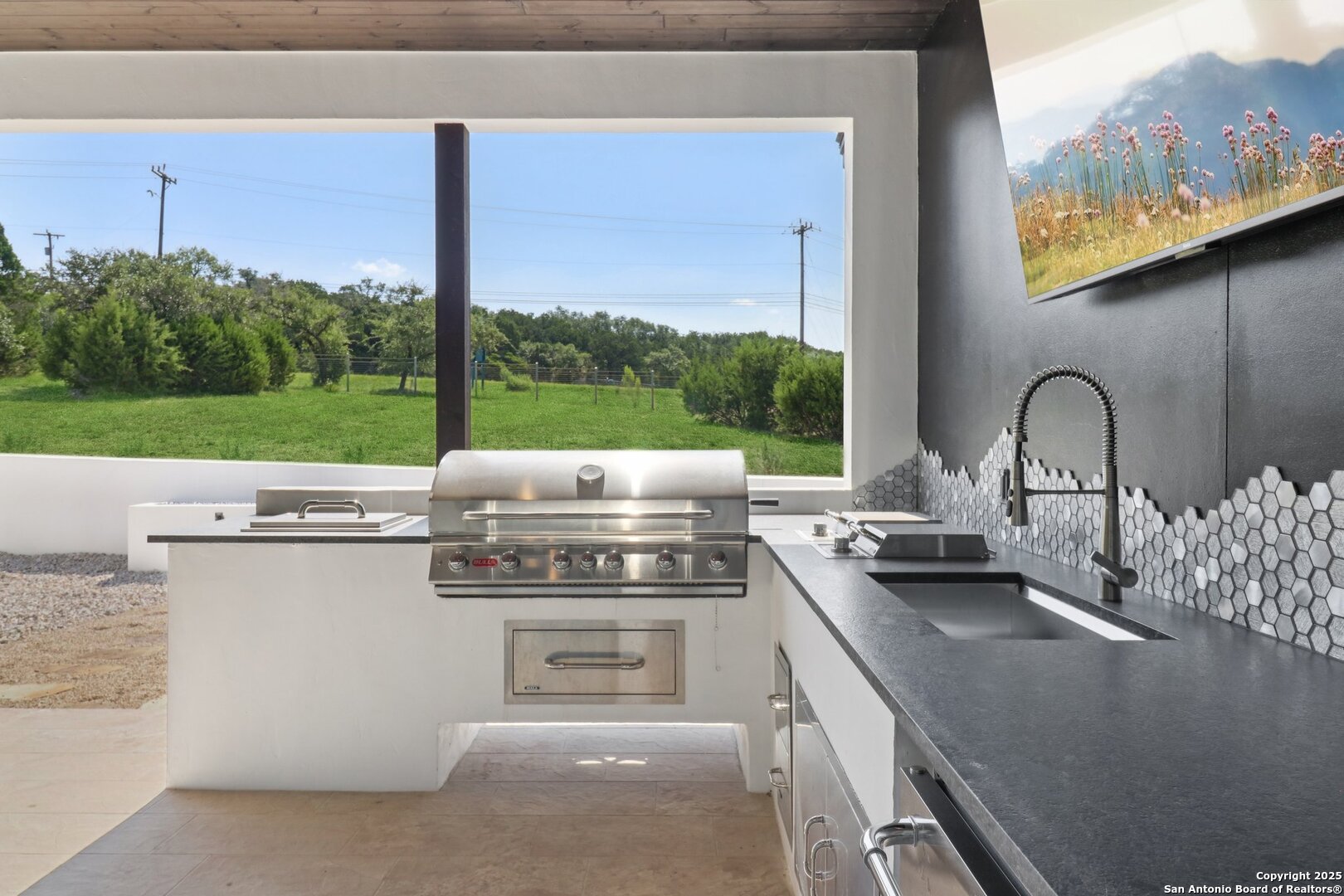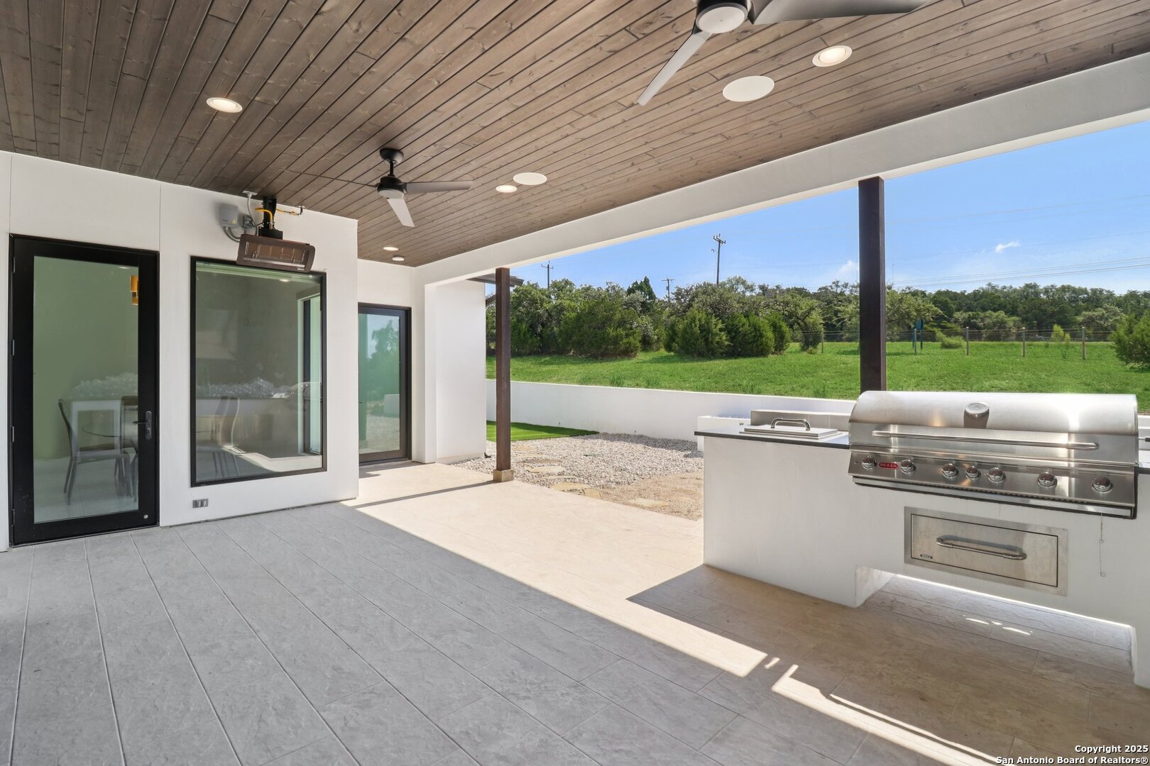Elevated luxury meets refined sophistication in this meticulously crafted residence set on a 1.10-acre estate. Designed with both comfort and grand-scale entertaining in mind, this architecturally distinctive home seamlessly blends timeless elegance with contemporary functionality. A dramatic foyer opens into a breathtaking living room, where soaring ceilings and expansive windows fill the space with natural light. A sleek gas fireplace anchors the room, creating an atmosphere that is both striking and welcoming. Spanning 4,200 square feet, the home features four generously sized bedrooms, each with its own ensuite bath, along with a private study and an impressive game room. Thoughtfully designed for entertainment, the game room showcases a custom bar with wine cooler, beverage fridge, ice maker, and five mounted TVs-perfect for hosting unforgettable gatherings. At the heart of the home, the gourmet kitchen elevates culinary luxury with custom Michael Edwards cabinetry and premium KitchenAid appliances. A 6-burner gas range with pot filler, double-door refrigerator, and dual center islands create an exceptional workspace. A spacious prep pantry provides abundant storage, keeping essentials organized and accessible. The private primary suite is a true retreat, offering a tranquil sitting area and a two-sided fireplace shared with the spa-inspired bath. Enjoy a luxurious soaking tub, an oversized walk-in shower, and a boutique-style closet with a center island designed for the most discerning wardrobe. Seamless indoor-outdoor living comes to life through sliding glass doors that open to a generous patio and a fully equipped outdoor kitchen, perfect for year-round alfresco dining. For car enthusiasts, the property includes two separate 2-car garages, one thoughtfully equipped with an EV charger. Ideally located in the prestigious gated community of Cantera Hills, this exceptional residence offers refined Hill Country living just minutes from La Cantera, The Rim, and San Antonio's premier destinations.