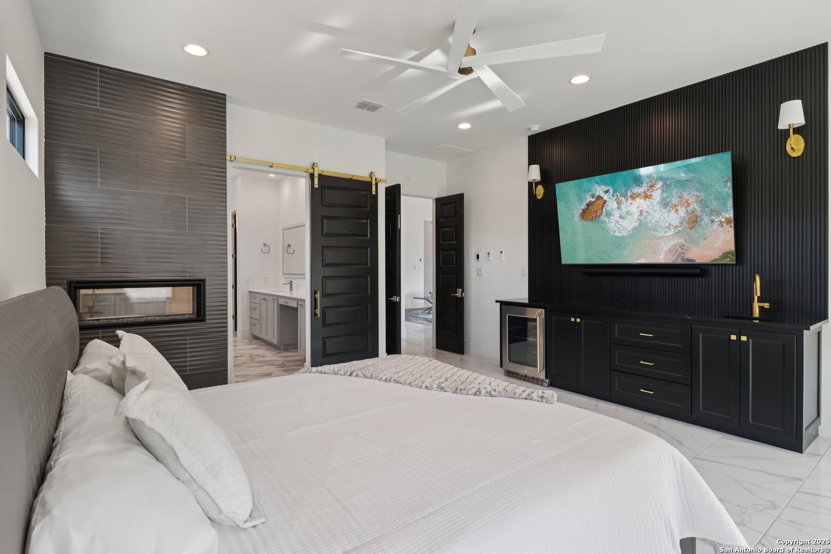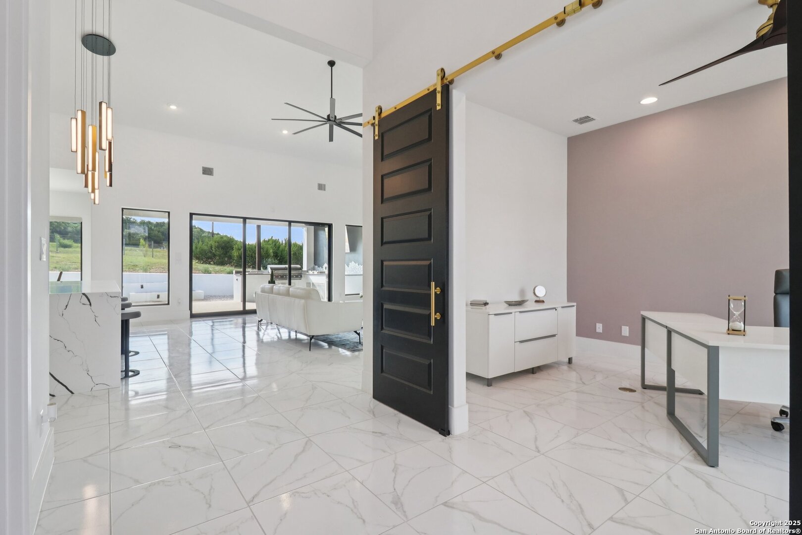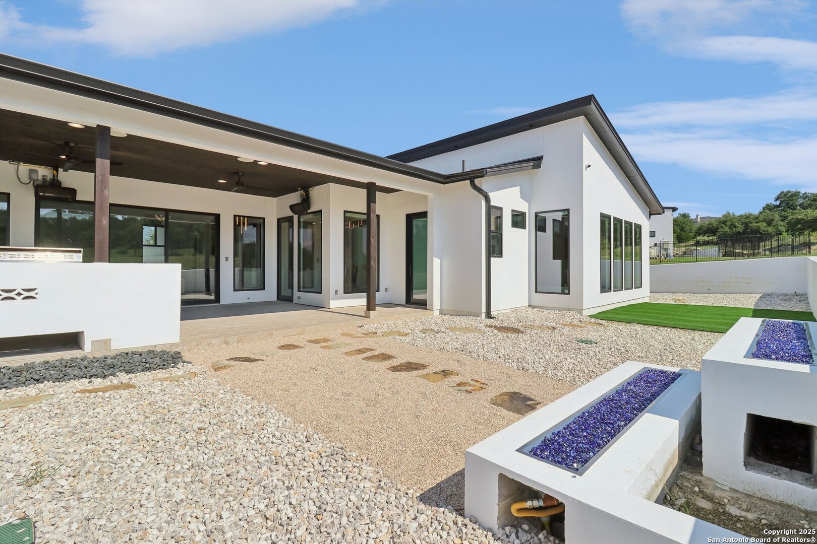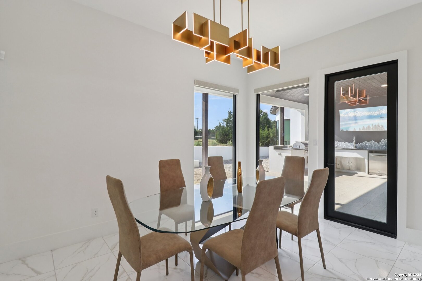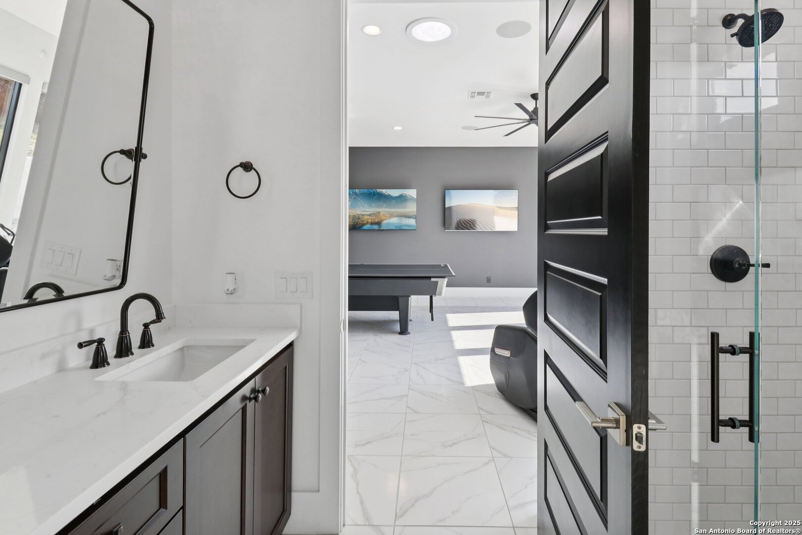 Elevated luxury meets refined sophistication in this meticulously crafted residence set on a 1.10-acre estate. Designed with both comfort and grand-scale entertaining in mind, this architecturally distinctive home seamlessly blends timeless elegance with contemporary functionality. A dramatic foyer opens into a breathtaking living room, where soaring ceilings and expansive windows fill the space with natural light. A sleek gas fireplace anchors the room, creating an atmosphere that is both striking and welcoming. Spanning 4,200 square feet, the home features four generously sized bedrooms, each with its own ensuite bath, along with a private study and an impressive game room. Thoughtfully designed for entertainment, the game room showcases a custom bar with wine cooler, beverage fridge, ice maker, and five mounted TVs-perfect for hosting unforgettable gatherings. At the heart of the home, the gourmet kitchen elevates culinary luxury with custom Michael Edwards cabinetry and premium KitchenAid appliances. A 6-burner gas range with pot filler, double-door refrigerator, and dual center islands create an exceptional workspace. A spacious prep pantry provides abundant storage, keeping essentials organized and accessible. The private primary suite is a true retreat, offering a tranquil sitting area and a two-sided fireplace shared with the spa-inspired bath. Enjoy a luxurious soaking tub, an oversized walk-in shower, and a boutique-style closet with a center island designed for the most discerning wardrobe. Seamless indoor-outdoor living comes to life through sliding glass doors that open to a generous patio and a fully equipped outdoor kitchen, perfect for year-round alfresco dining. For car enthusiasts, the property includes two separate 2-car garages, one thoughtfully equipped with an EV charger. Ideally located in the prestigious gated community of Cantera Hills, this exceptional residence offers refined Hill Country living just minutes from La Cantera, The Rim, and San Antonio's premier destinations.
