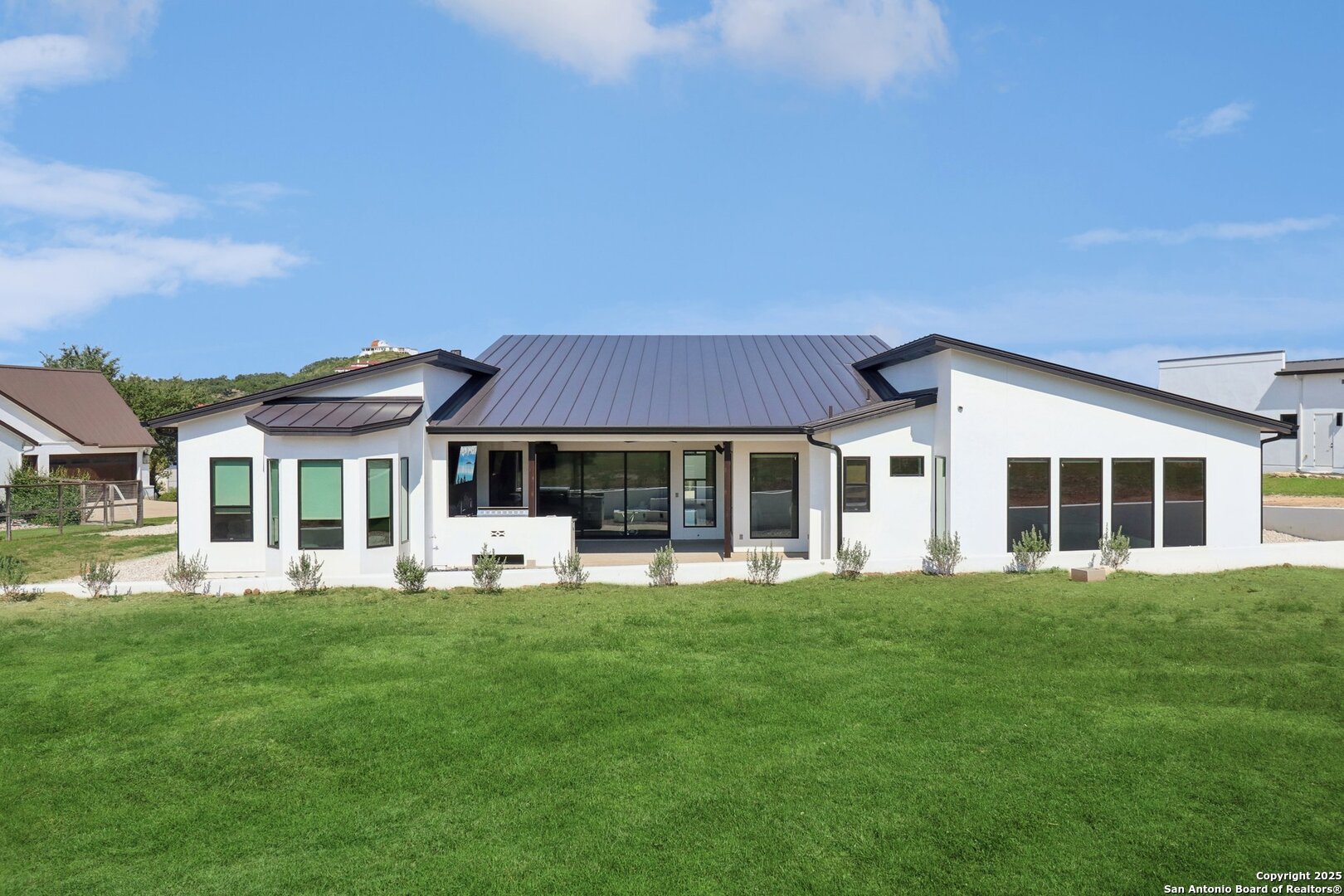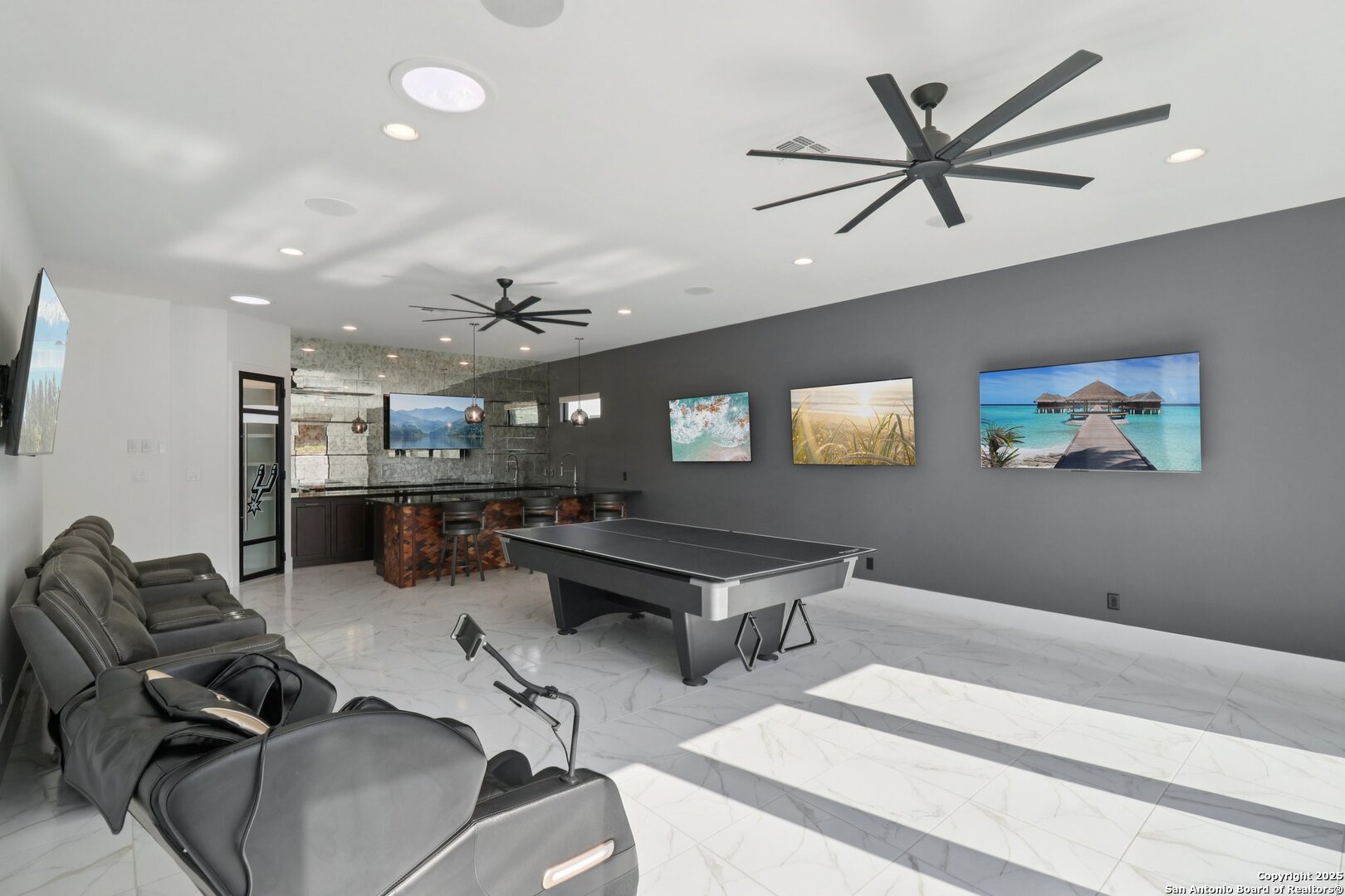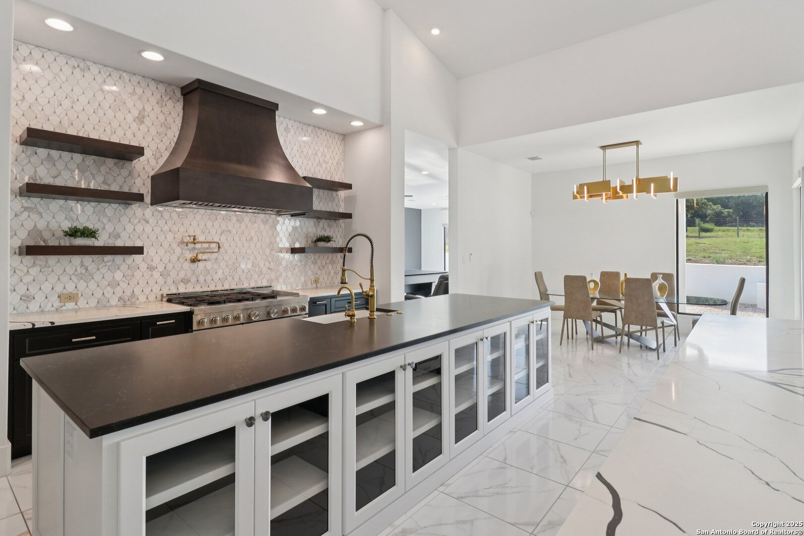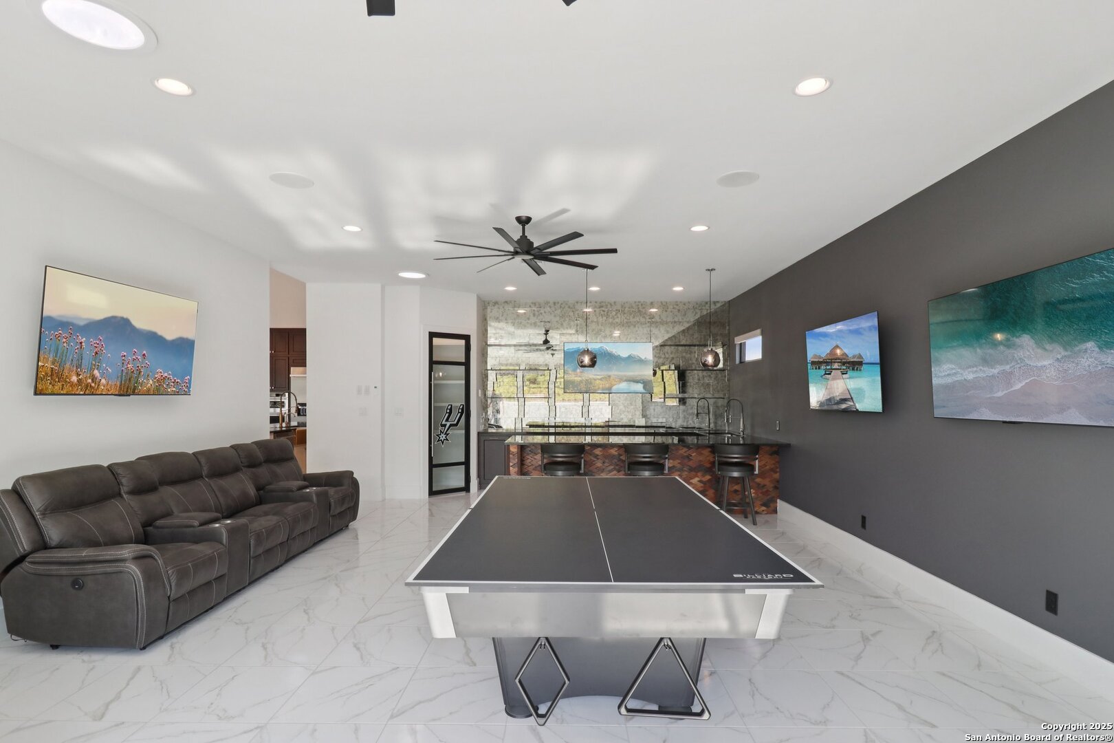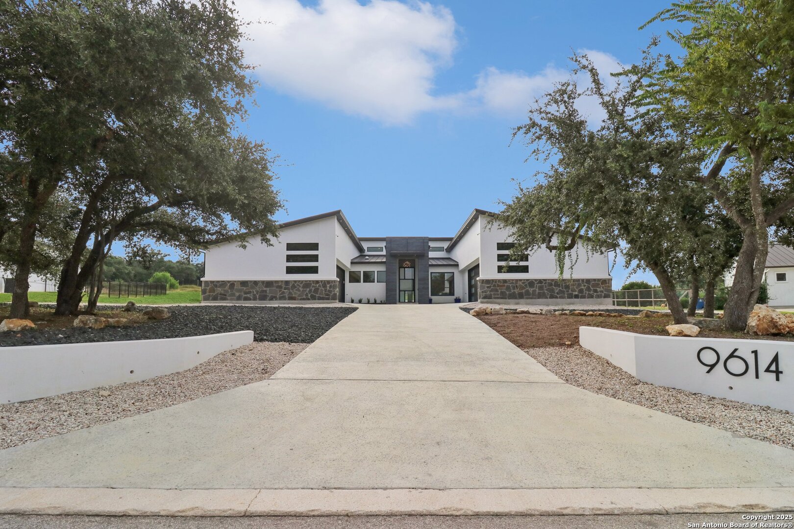 Elevated luxury meets refined sophistication in this meticulously crafted residence set on a 1.10-acre estate. Designed with both comfort and grand-scale entertaining in mind, this architecturally distinctive home seamlessly blends timeless elegance with contemporary functionality. A dramatic foyer opens into a breathtaking living room, where soaring ceilings and expansive windows fill the space with natural light. A sleek gas fireplace anchors the room, creating an atmosphere that is both striking and welcoming. Spanning 4,200 square feet, the home features four generously sized bedrooms, each with its own ensuite bath, along with a private study and an impressive game room. Thoughtfully designed for entertainment, the game room showcases a custom bar with wine cooler, beverage fridge, ice maker, and five mounted TVs-perfect for hosting unforgettable gatherings. At the heart of the home, the gourmet kitchen elevates culinary luxury with custom Michael Edwards cabinetry and premium KitchenAid appliances. A 6-burner gas range with pot filler, double-door refrigerator, and dual center islands create an exceptional workspace. A spacious prep pantry provides abundant storage, keeping essentials organized and accessible. The private primary suite is a true retreat, offering a tranquil sitting area and a two-sided fireplace shared with the spa-inspired bath. Enjoy a luxurious soaking tub, an oversized walk-in shower, and a boutique-style closet with a center island designed for the most discerning wardrobe. Seamless indoor-outdoor living comes to life through sliding glass doors that open to a generous patio and a fully equipped outdoor kitchen, perfect for year-round alfresco dining. For car enthusiasts, the property includes two separate 2-car garages, one thoughtfully equipped with an EV charger. Ideally located in the prestigious gated community of Cantera Hills, this exceptional residence offers refined Hill Country living just minutes from La Cantera, The Rim, and San Antonio's premier destinations.