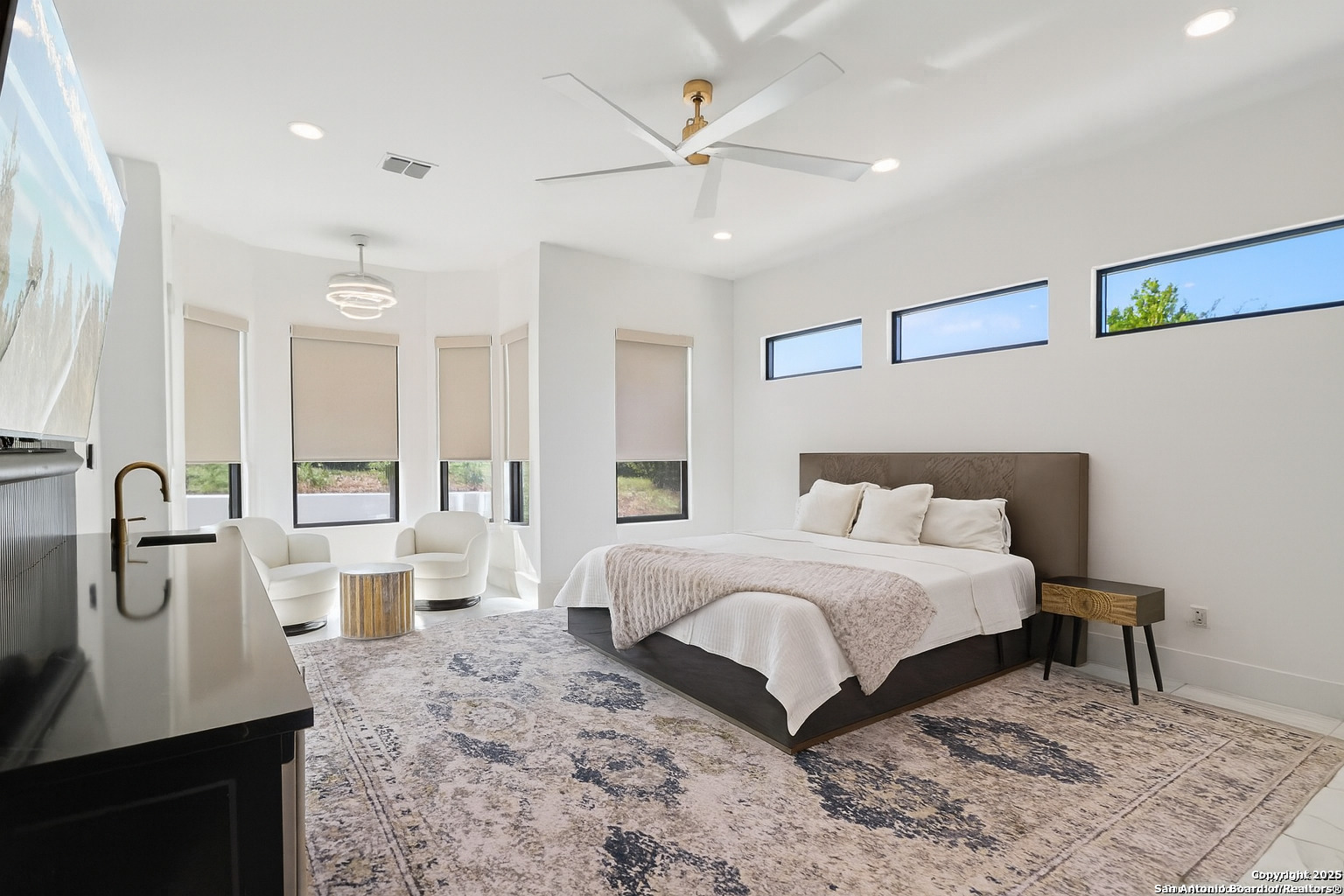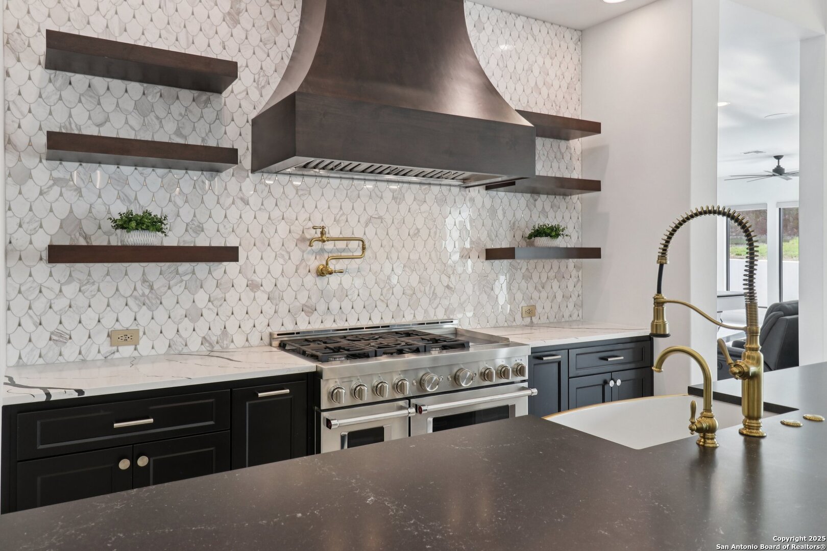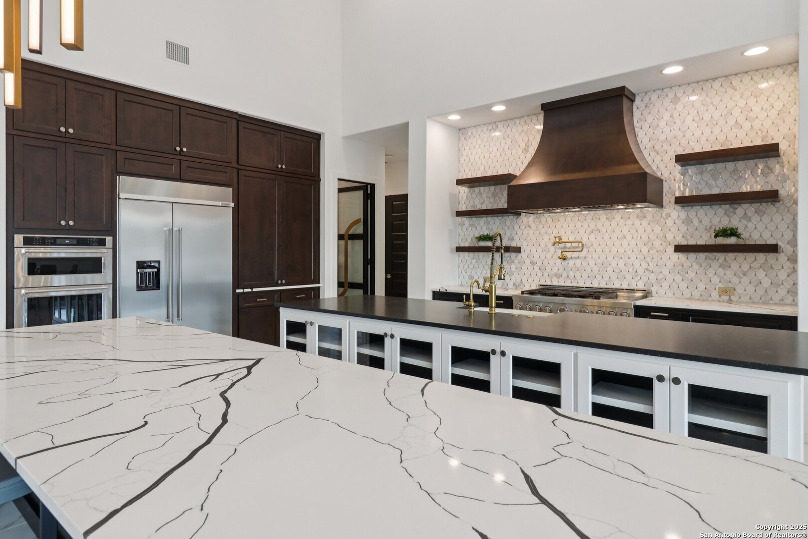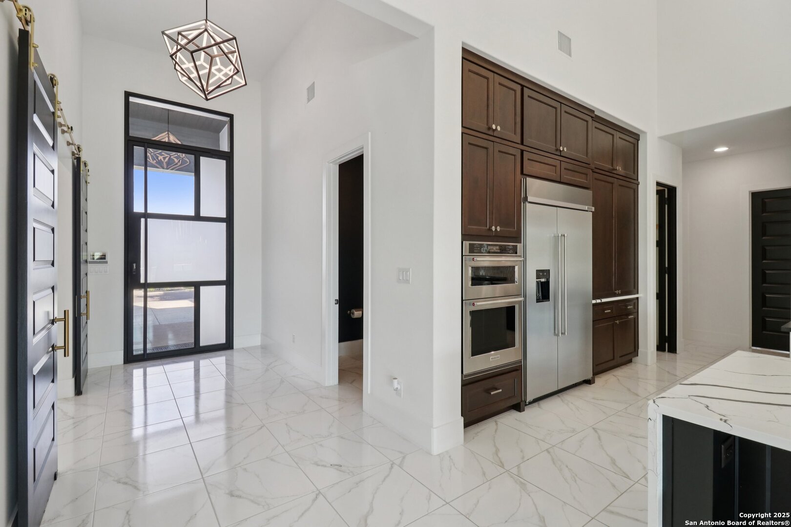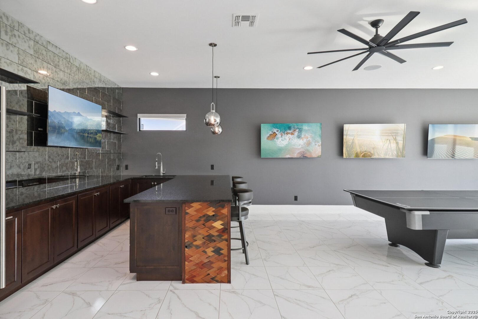 Elevated luxury meets refined sophistication in this meticulously crafted residence set on a 1.10-acre estate. Designed with both comfort and grand-scale entertaining in mind, this architecturally distinctive home seamlessly blends timeless elegance with contemporary functionality. A dramatic foyer opens into a breathtaking living room, where soaring ceilings and expansive windows fill the space with natural light. A sleek gas fireplace anchors the room, creating an atmosphere that is both striking and welcoming. Spanning 4,200 square feet, the home features four generously sized bedrooms, each with its own ensuite bath, along with a private study and an impressive game room. Thoughtfully designed for entertainment, the game room showcases a custom bar with wine cooler, beverage fridge, ice maker, and five mounted TVs-perfect for hosting unforgettable gatherings. At the heart of the home, the gourmet kitchen elevates culinary luxury with custom Michael Edwards cabinetry and premium KitchenAid appliances. A 6-burner gas range with pot filler, double-door refrigerator, and dual center islands create an exceptional workspace. A spacious prep pantry provides abundant storage, keeping essentials organized and accessible. The private primary suite is a true retreat, offering a tranquil sitting area and a two-sided fireplace shared with the spa-inspired bath. Enjoy a luxurious soaking tub, an oversized walk-in shower, and a boutique-style closet with a center island designed for the most discerning wardrobe. Seamless indoor-outdoor living comes to life through sliding glass doors that open to a generous patio and a fully equipped outdoor kitchen, perfect for year-round alfresco dining. For car enthusiasts, the property includes two separate 2-car garages, one thoughtfully equipped with an EV charger. Ideally located in the prestigious gated community of Cantera Hills, this exceptional residence offers refined Hill Country living just minutes from La Cantera, The Rim, and San Antonio's premier destinations.