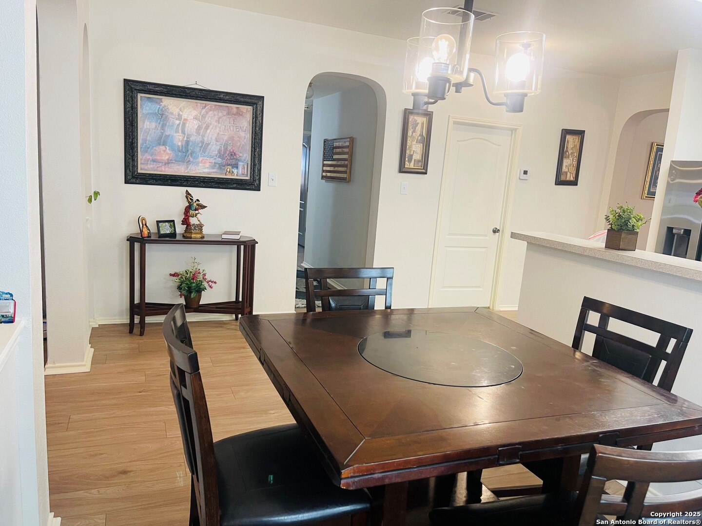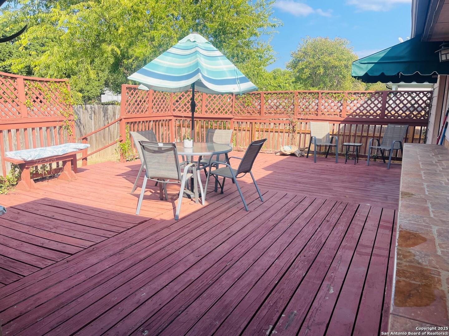 Charming Single-Story Home in Gated Sedona Community Welcome to this beautifully maintained 3-bedroom, 2-bath home in the heart of Helotes, tucked inside the desirable gated community of Sedona. From the moment you arrive, you'll fall in love with the inviting curb appeal, featuring a landscaped flower bed, accent shutters, elegant yard lighting, and a spacious columned front porch that sets the tone for what's inside. Step into a bright, open floor plan filled with natural light, high ceilings, arched doorways, and plantation shutters throughout. The spacious living and family rooms are perfect for gatherings, centered around a cozy wood-burning fireplace. With no stairs or carpet, this home is as practical as it is stylish - boasting luxury wide-plank flooring throughout. The well-appointed kitchen is designed for both everyday living and entertaining, featuring an abundance of cabinetry and counter space, a stainless steel sink, reverse osmosis system, breakfast bar, and a massive walk-in pantry and laundry room. Retreat to the grand primary suite, complete with a dual vanity, oversized walk-in shower, and generous walk-in closet. French doors lead directly to your private backyard oasis, where an expansive 36' x 27' deck and 21' x 18' covered patio create the ultimate space for outdoor entertaining, weekend BBQs, or relaxing evenings under the stars. Enjoy the benefits of a vibrant community with amenities including a park, playground, basketball court, and covered picnic pavilion. Conveniently located near shopping, dining, parks, and the highly sought-after O'Connor High School. This is more than just a house-it's the perfect place to make a home. Furniture is living room is negotiable. ITEMS CONVEYING: Garage Refrigerator, Main dining room table & Curio Cabinet. "Buyers are encouraged to verify all measurements and school information. Please refer to the additional documents for Offer Instructions and the Seller's Disclosure. We hope you enjoy your showing!"