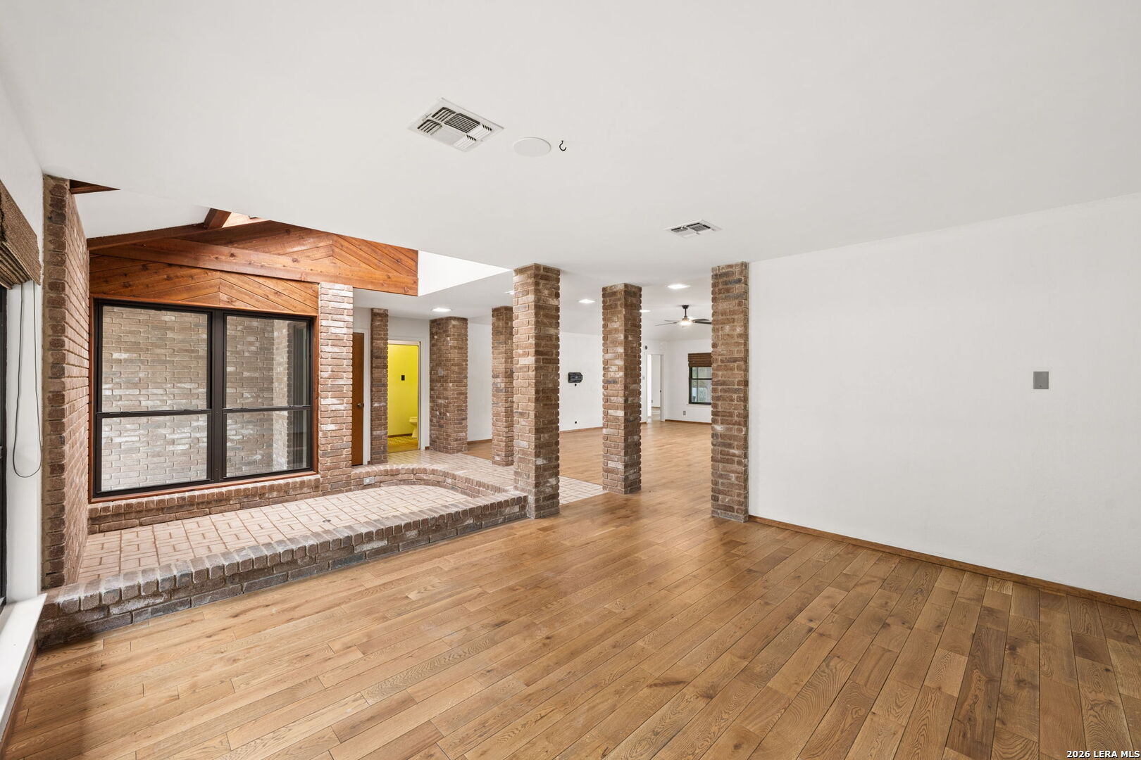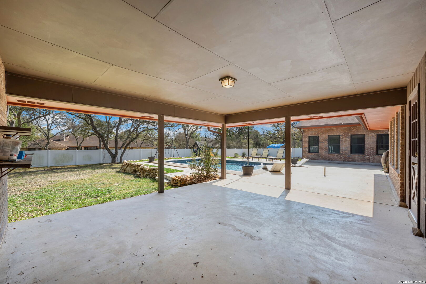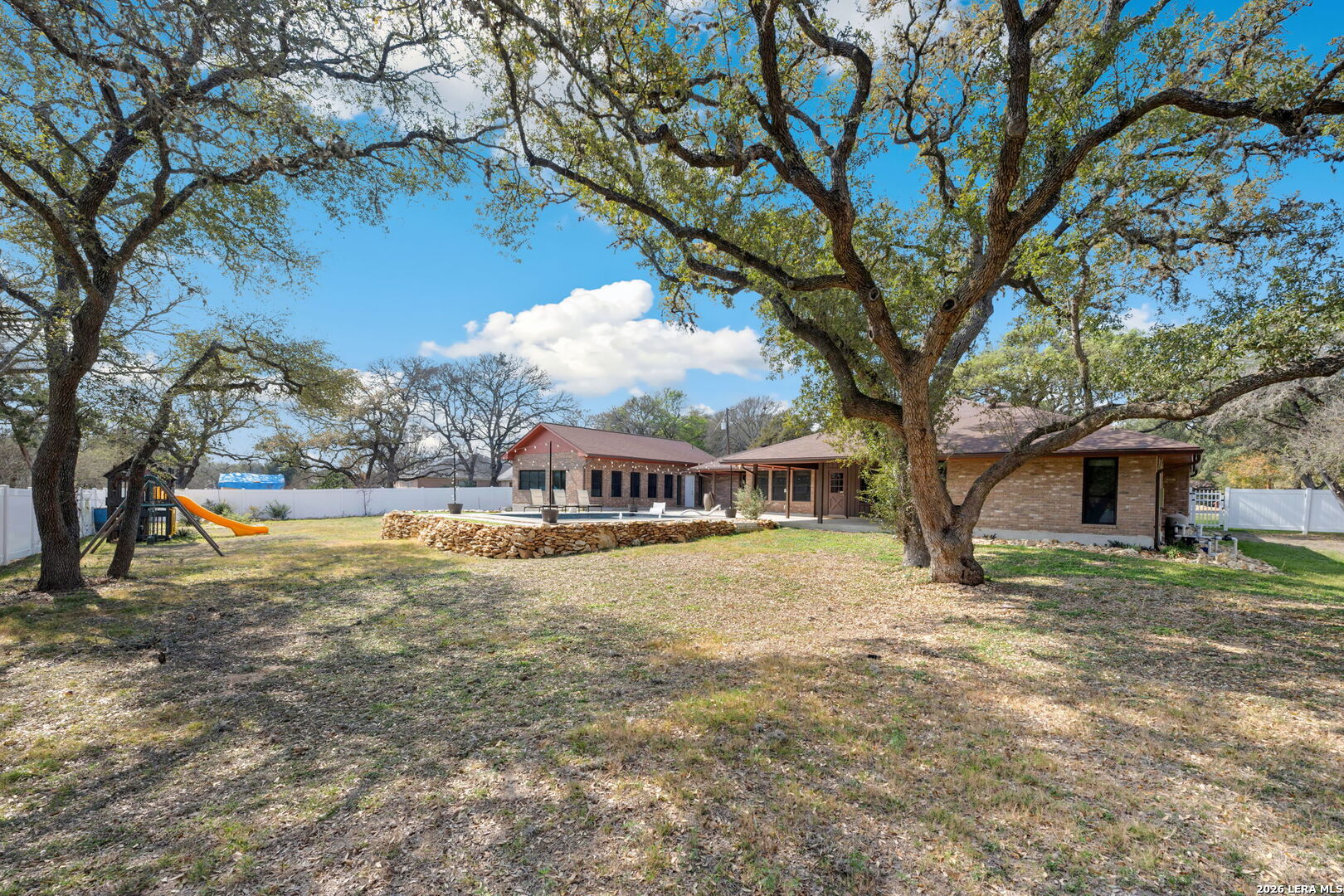Tucked at the end of a cul-de-sac on over three-quarters of an acre, surrounded by mature oaks and a backyard oasis with inground pool, this custom all-brick traditional home offers the kind of setting that feels both established and welcoming. A circular drive leads to a side-entry oversized garage, framing a property that has clearly been cared for with intention. A 2022-built attached casita adds a fully equipped guest house with kitchen, living area, bedroom, and backyard patio access-ideal for multigenerational living or long-term visitors. The thoughtfully designed layout balances privacy and connection. Inside the main home, rich real wood flooring flows throughout the main living spaces, complemented by Italian ceramic tile in the wet areas. Fresh interior paint, updated lighting, and a statement chandelier in the dining area create a polished yet comfortable atmosphere, while the oversized family room-with its brick accented fireplace-invites gatherings both large and small. Two front bedrooms share a Jack-and-Jill bath tucked discreetly behind a pocket door, while a separate bedroom with its own full bath near the kitchen and laundry area offers flexibility for guests or extended family. At the back of the home, the primary suite serves as a quiet retreat with patio access, dual vanities, a separate tub and shower, and two closets. The custom kitchen features a contemporary-style feel and overlooks a backyard designed for enjoyment, complete with a recently installed pool, outdoor lighting, and updated concrete and rock work. Practical upgrades include a tankless water heater, water softener, updated plumbing and electrical systems, double-pane windows, a recently installed aerobic system, exterior gutters, vinyl fencing, and so much more. With added conveniences like a riding mower, storage shed, playground equipment, pool furnishings, and a washer and dryer that are included, this home offers a complete and well-rounded lifestyle from day one. Please be aware that some photos have been virtually staged.