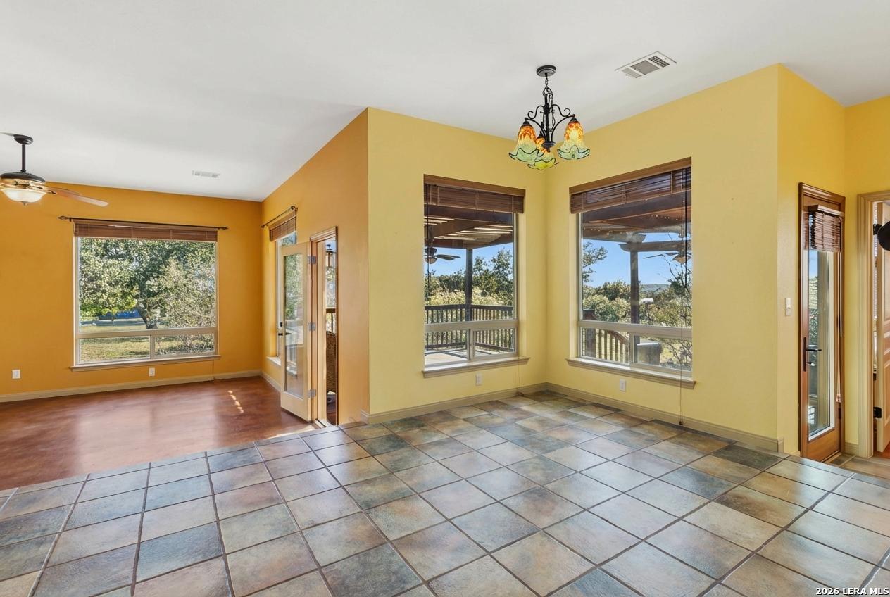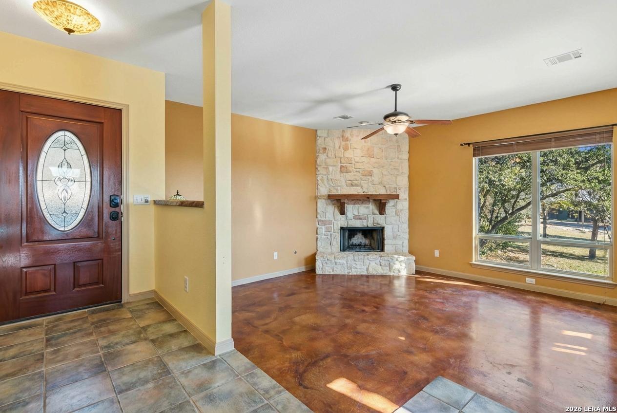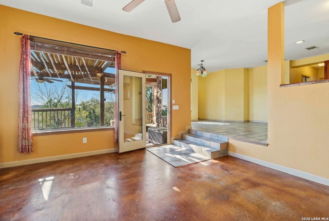 Discover this extraordinary Hill Country home set atop one of the highest hills in sought-after Grey Forest. Enjoy breathtaking panoramic views, rare privacy, and a peaceful retreat, all just minutes from city conveniences. Set on nearly two private acres surrounded by protected conservation land, this architecturally distinct custom home offers a truly special lifestyle. A circular drive, abundant parking, and over 100 mature live oak trees create a memorable first impression. Inside, light-filled spaces are designed for both everyday comfort and entertaining. The sunken living room features soaring ceilings, a striking stone gas fireplace, and oversized Pella windows framing unforgettable views. The flexible layout offers 4 bedrooms, three full baths, and multiple bonus spaces ideal for a home office, gym, rec room, or private guest suite with its own entrance, perfect for multigenerational living, long-term guests, or potential rental opportunities. A third-story moon loft, accessed by a spiral staircase, provides a unique escape with elevated views. The kitchen features cherry cabinetry, gas cooking, granite countertops, and generous storage. Outdoor living shines with nearly 1,200 sq ft of decks, patios, and porches, perfect for sunsets and stargazing. Premium upgrades include a standing-seam metal roof, recently refinished decks, tankless water heater, water softener, three serviced HVAC units, landscaping with new trees, front yard pond and walking trails. Ideally located near Old Town Helotes, La Cantera, The Rim, UTSA, major parks, and top-rated Northside ISD.