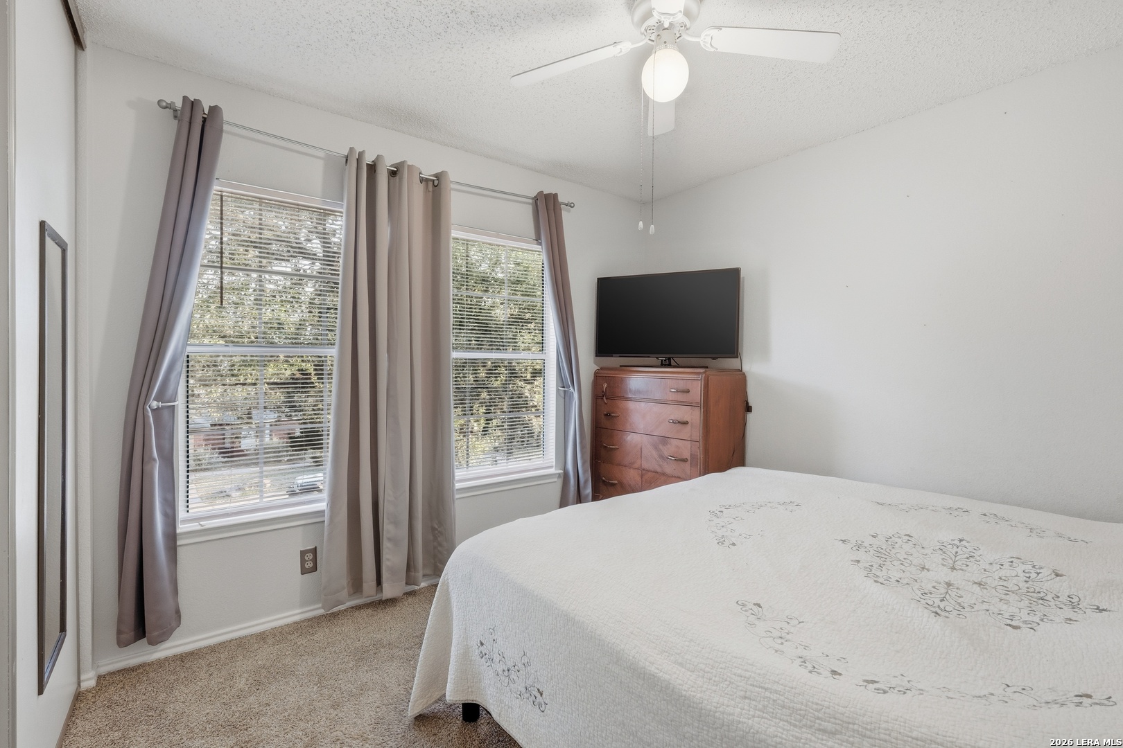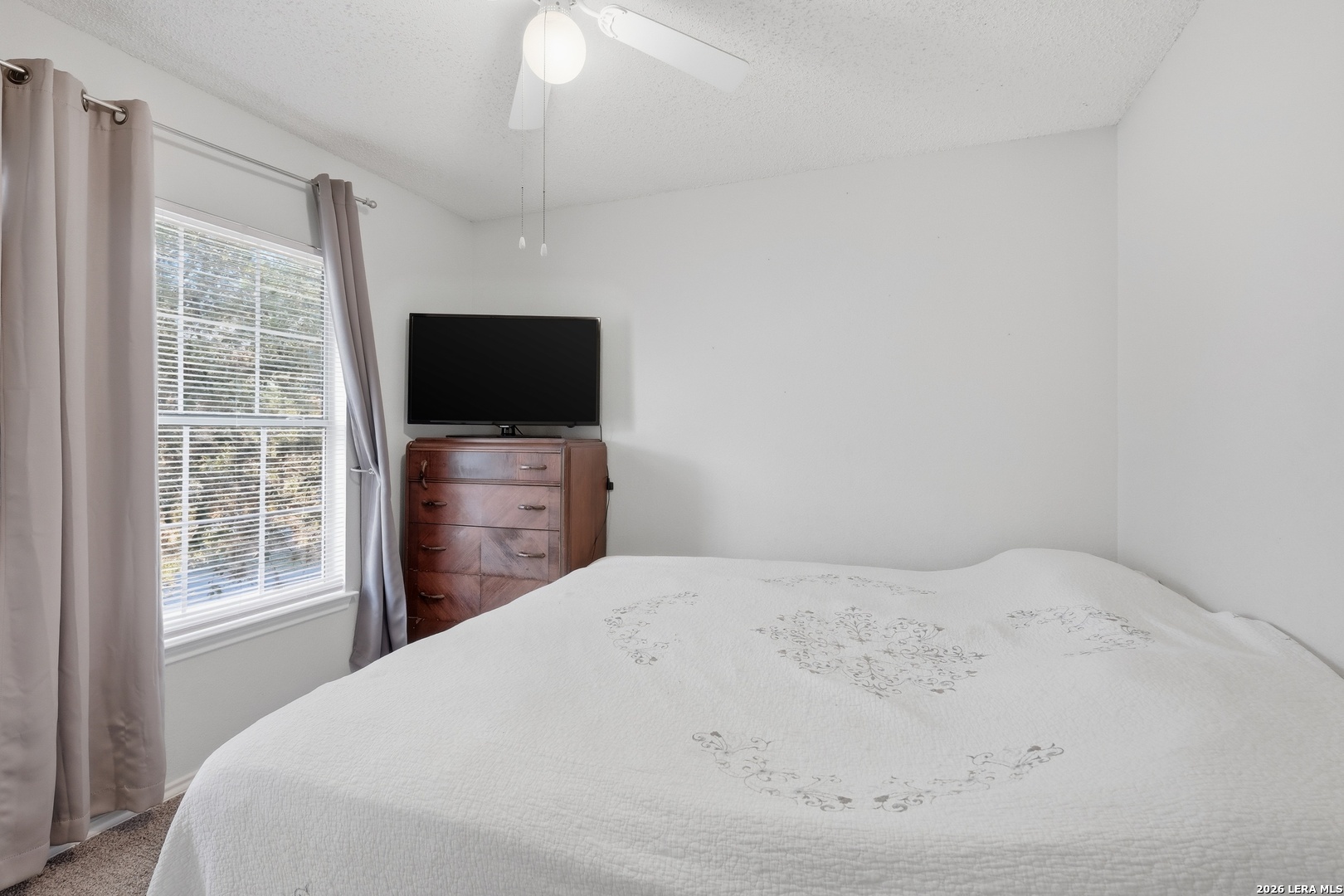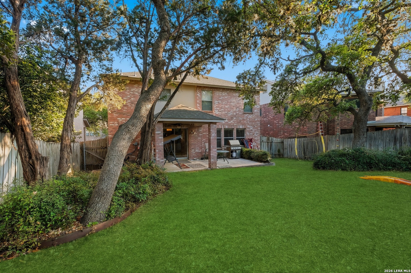 Tucked inside Loop 1604 in San Antonio, this move-in ready home offers a rare combination of location, updates, and privacy with no neighbors directly behind. Conveniently located near state parks, shopping, dining, and award winning Northside ISD schools, this property checks the boxes for both lifestyle and accessibility. The full masonry exterior and mature trees create strong curb appeal as you arrive. Inside, the open floor plan features wood laminate and ceramic tile flooring throughout the main living areas, ideal for durability in high traffic spaces. The kitchen is equipped with stainless steel appliances, a breakfast bar, and overlooks the main living area-perfect for entertaining and everyday living. Natural flow between the kitchen and living space makes this layout highly functional and desirable. Upstairs, a large game room provides flexible space for a second living area, home office, or media room. The primary suite is oversized, with room for a sitting area, and includes a full bathroom with separate vanities. Secondary bedrooms offer comfortable space for family or guests. The backyard is shaded by mature trees and features a covered patio, creating a private outdoor living space with no immediate rear neighbors. Major updates include a roof replaced in 2025, HVAC replaced in 2023, carpet replaced in 2022, and a water heater plus kitchen appliances updated in 2019. An additional highlight: a VA assumable loan may be available at a 5.25 interest rate-an exceptional opportunity for qualified buyers. Located in the Stonefield community, residents enjoy access to neighborhood amenities including a community pool, park, playground, and basketball court. The low annual HOA fee helps maintain the common areas and enhances the overall appeal of the neighborhood.