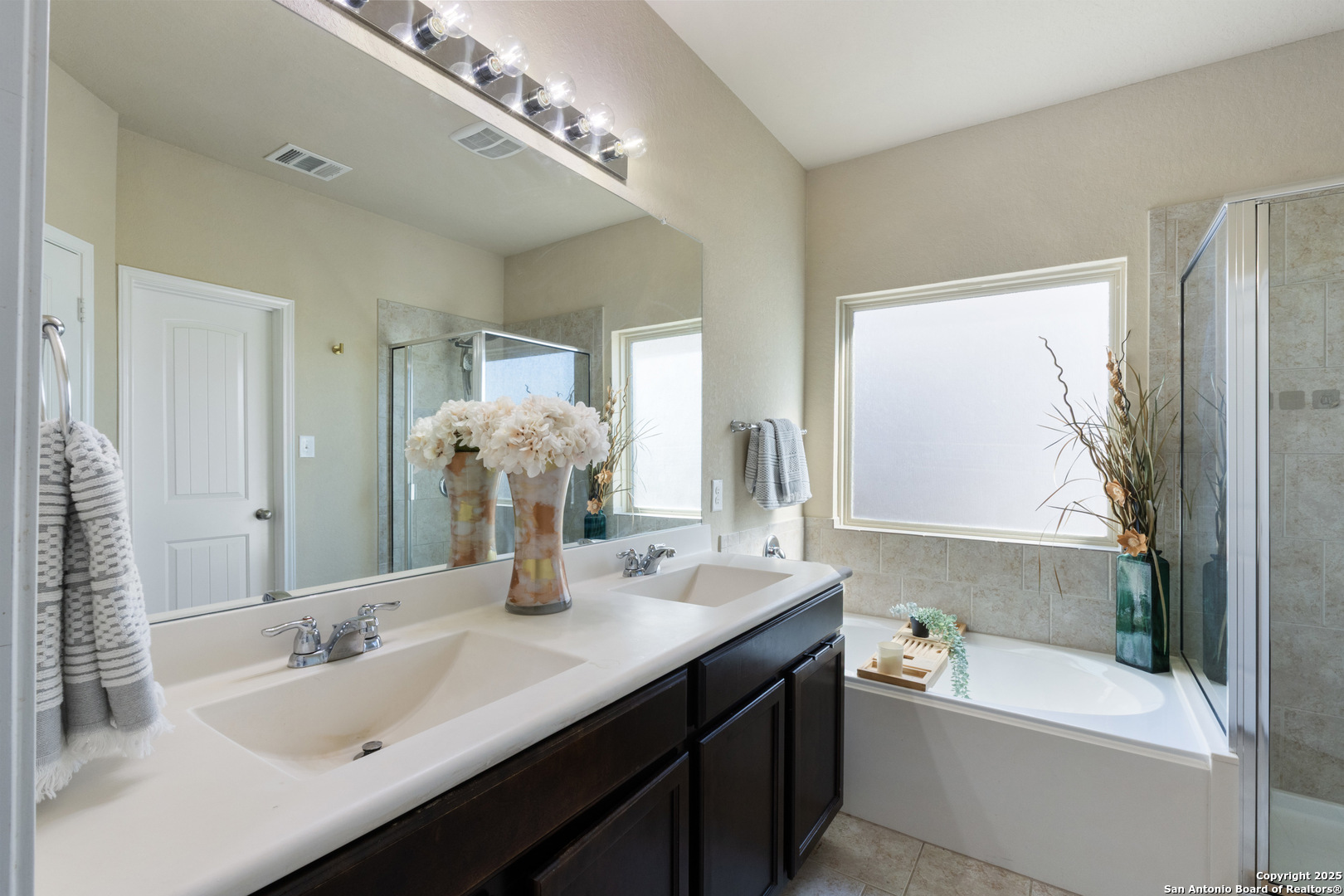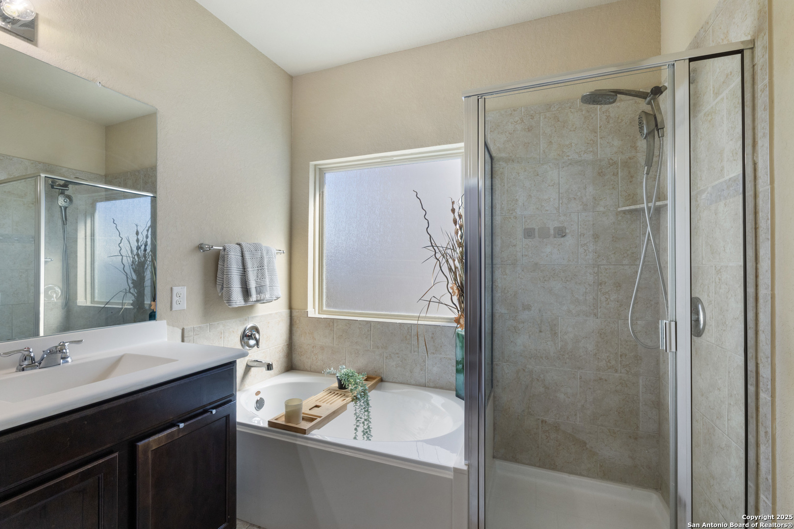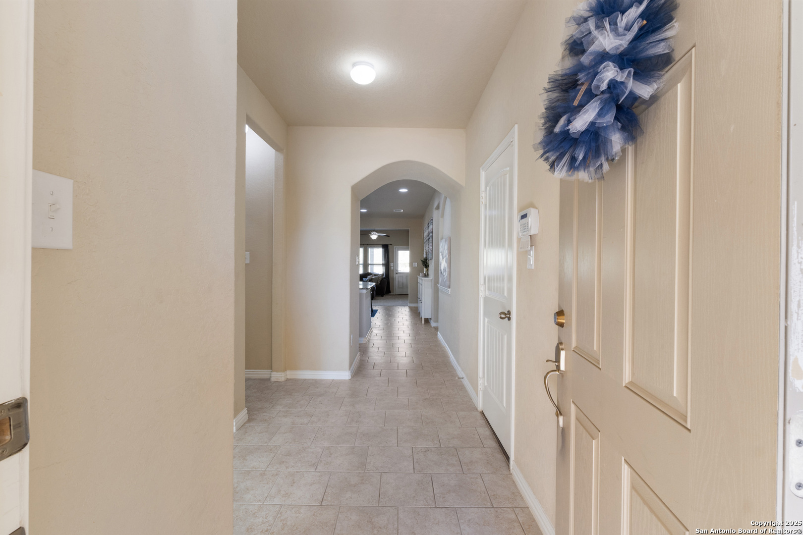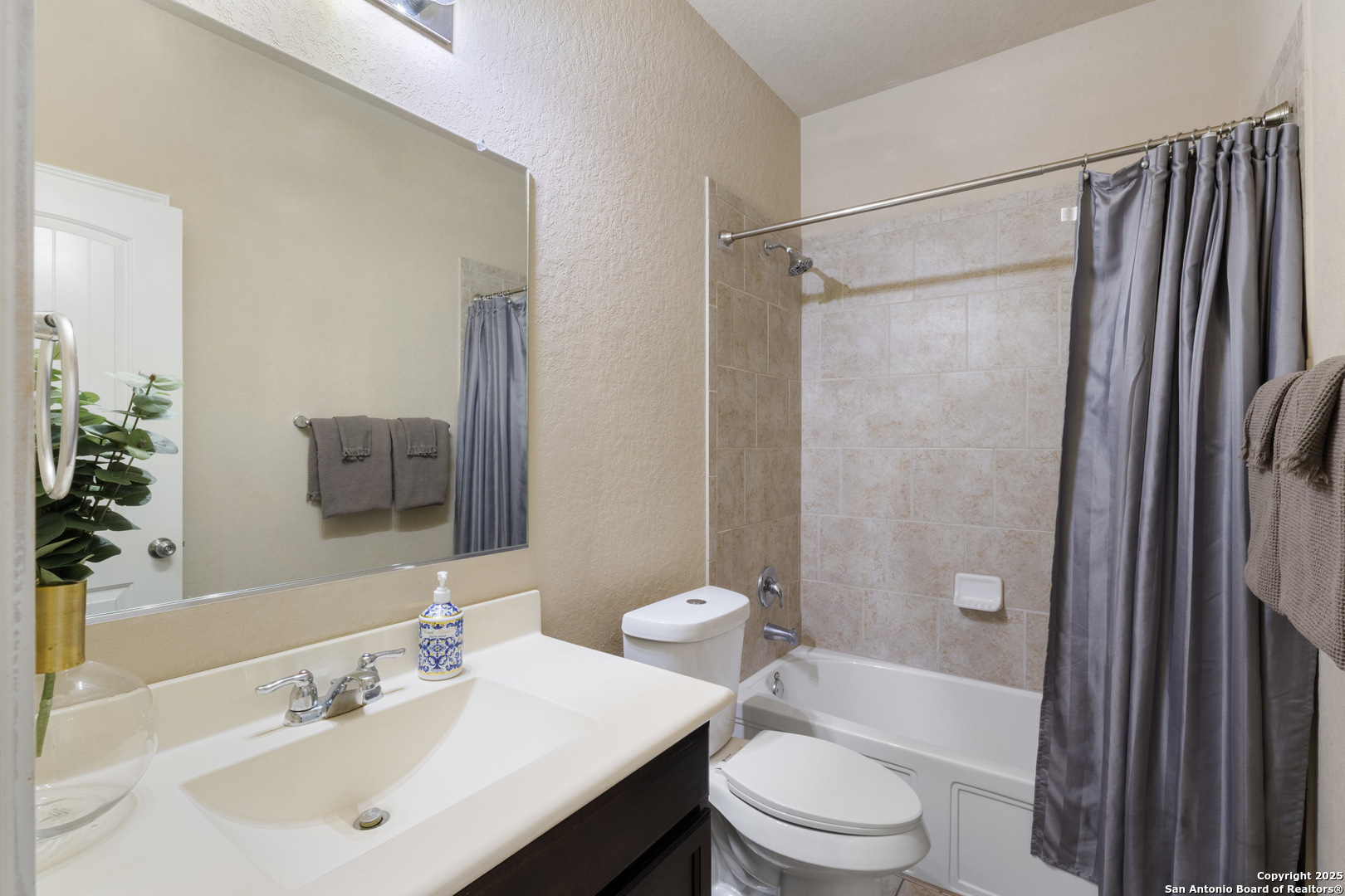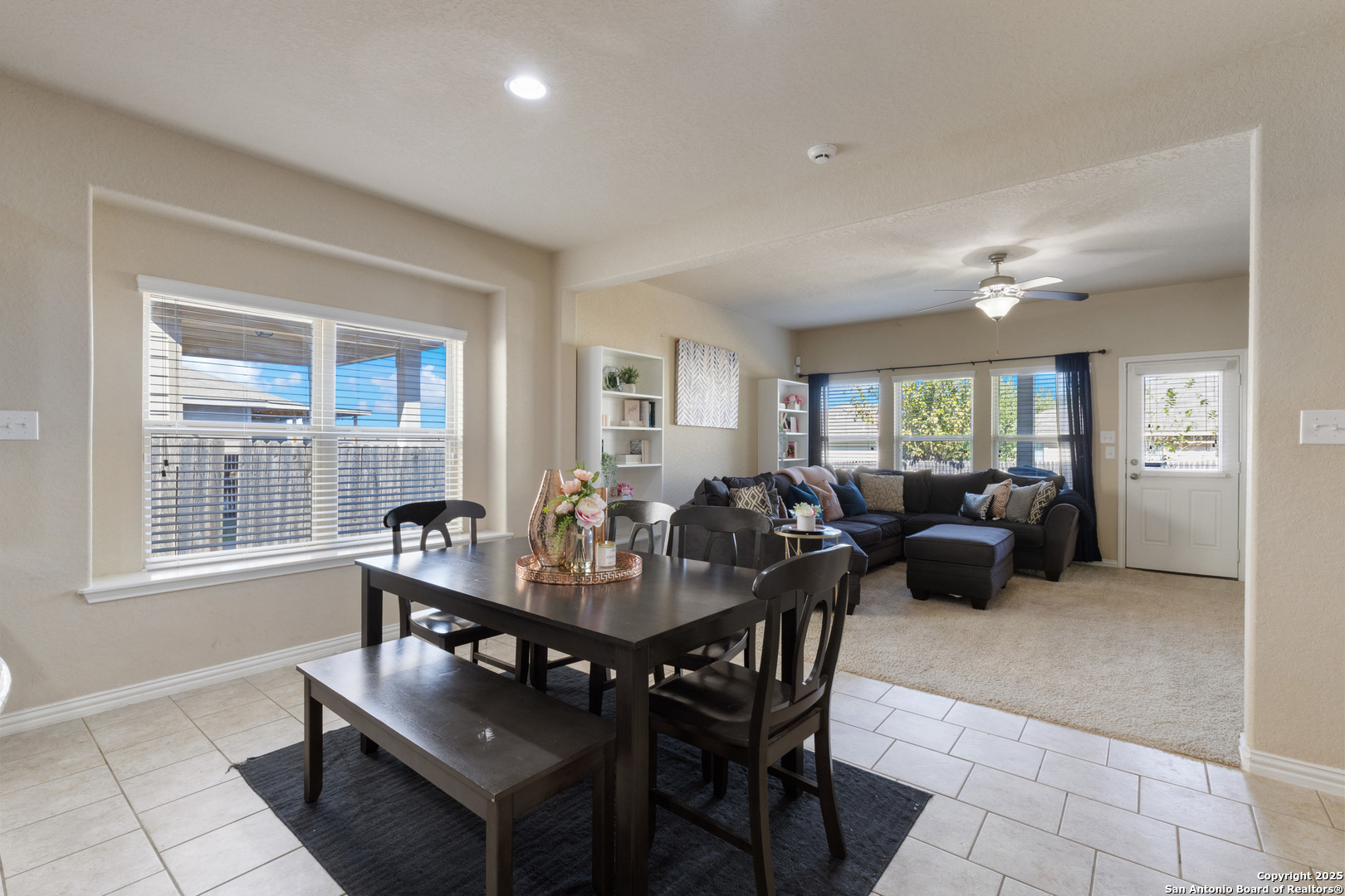 Welcome to this charming one-story San Antonio home and step inside to discover a warm, inviting layout featuring an open-concept kitchen with granite countertops, rich cabinetry, gas cooking, and a spacious island that flows seamlessly into the dining and living areas-perfect for entertaining. A front flex room with double doors offers the ideal space for a home office or sitting area. The primary suite provides a peaceful retreat with a private en-suite bath featuring a separate garden tub and walk-in shower. Two additional bedrooms and a second full bathroom round out the well-designed interior. Step outside to enjoy the covered back patio and a fully fenced yard ready for relaxation or gatherings. Added peace of mind comes with a roof that's just 2 years old and a brand new indoor A/C unit installed 1 year ago. Located near Loop 1604, Hwy 90, and Lackland AFB, this home combines comfort, efficiency, and location in one neat package.