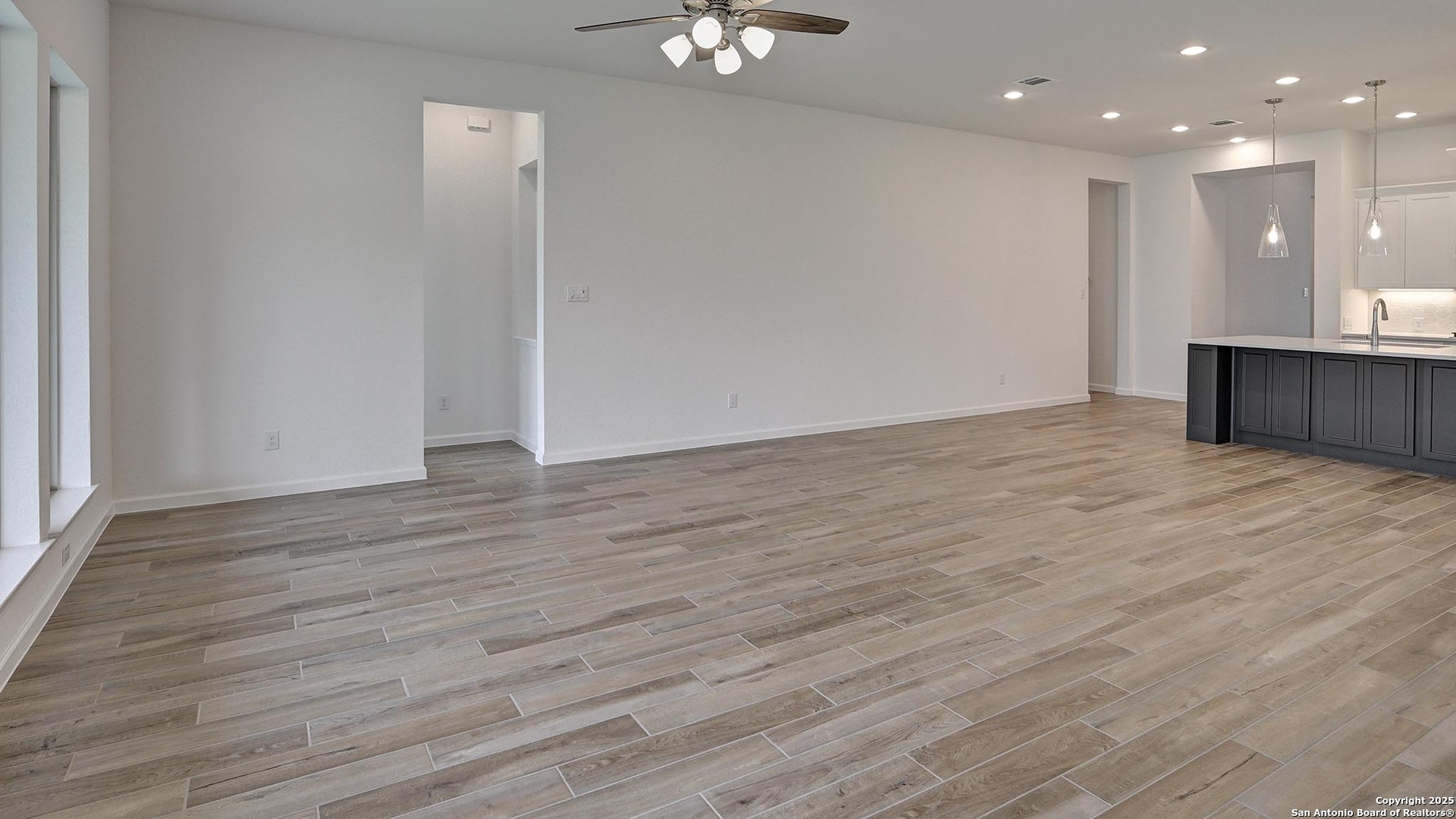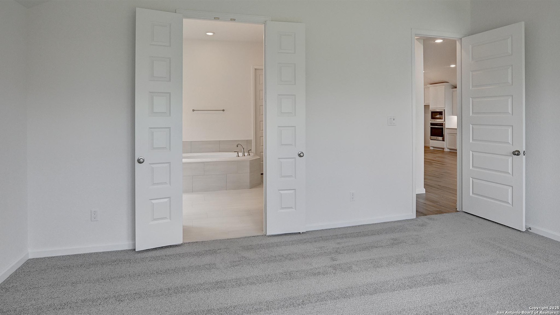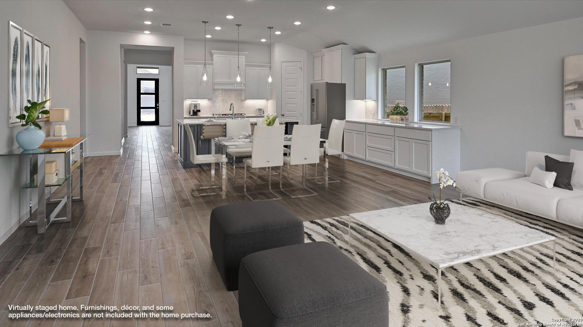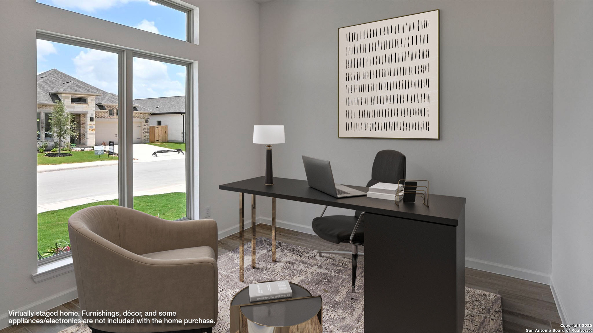 READY FOR MOVE-IN! Home office with French doors set at entry with 12-foot ceiling. Extended entry leads to open kitchen, dining area and family room. Kitchen features corner walk-in pantry, 5-burner gas cooktop, generous counter space and island with built-in seating space. Dining area flows into family room with wall of windows. Primary suite includes double-door entry to primary bath with dual vanities, garden tub, separate glass-enclosed shower and two large walk-in closets. A guest suite with private bath adds to this spacious one-story home. Extended covered backyard patio and 5-zone sprinkler system. Mud room off two-car garage.