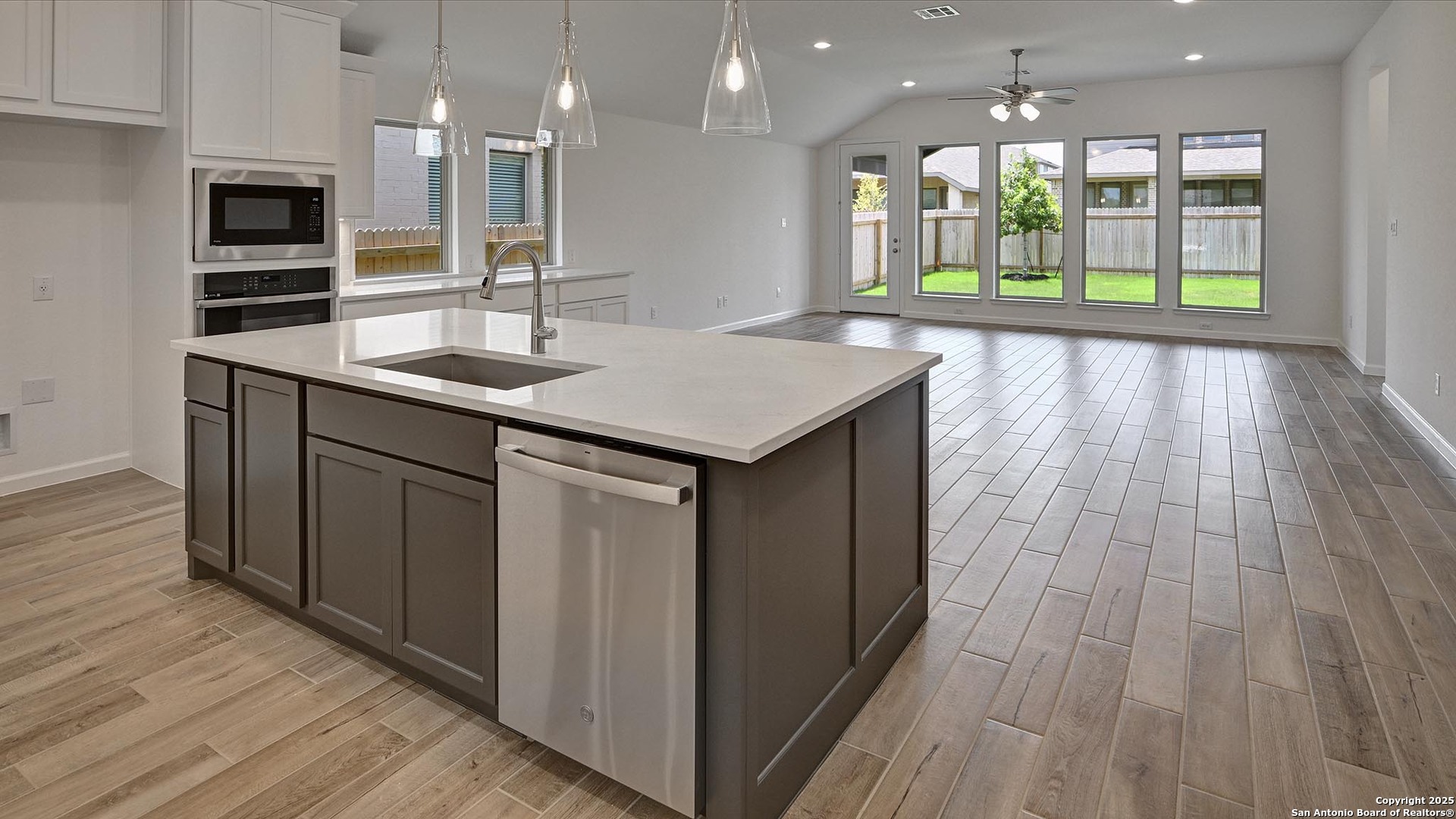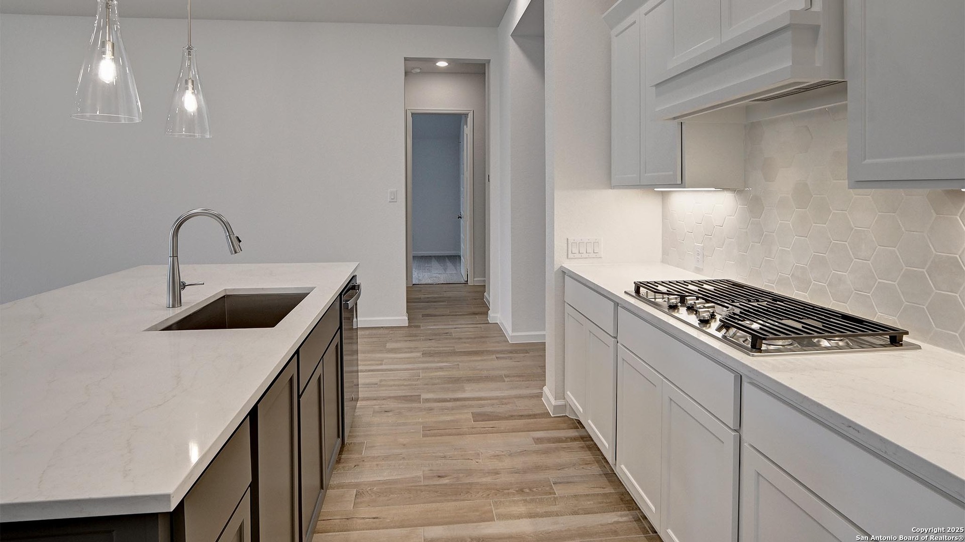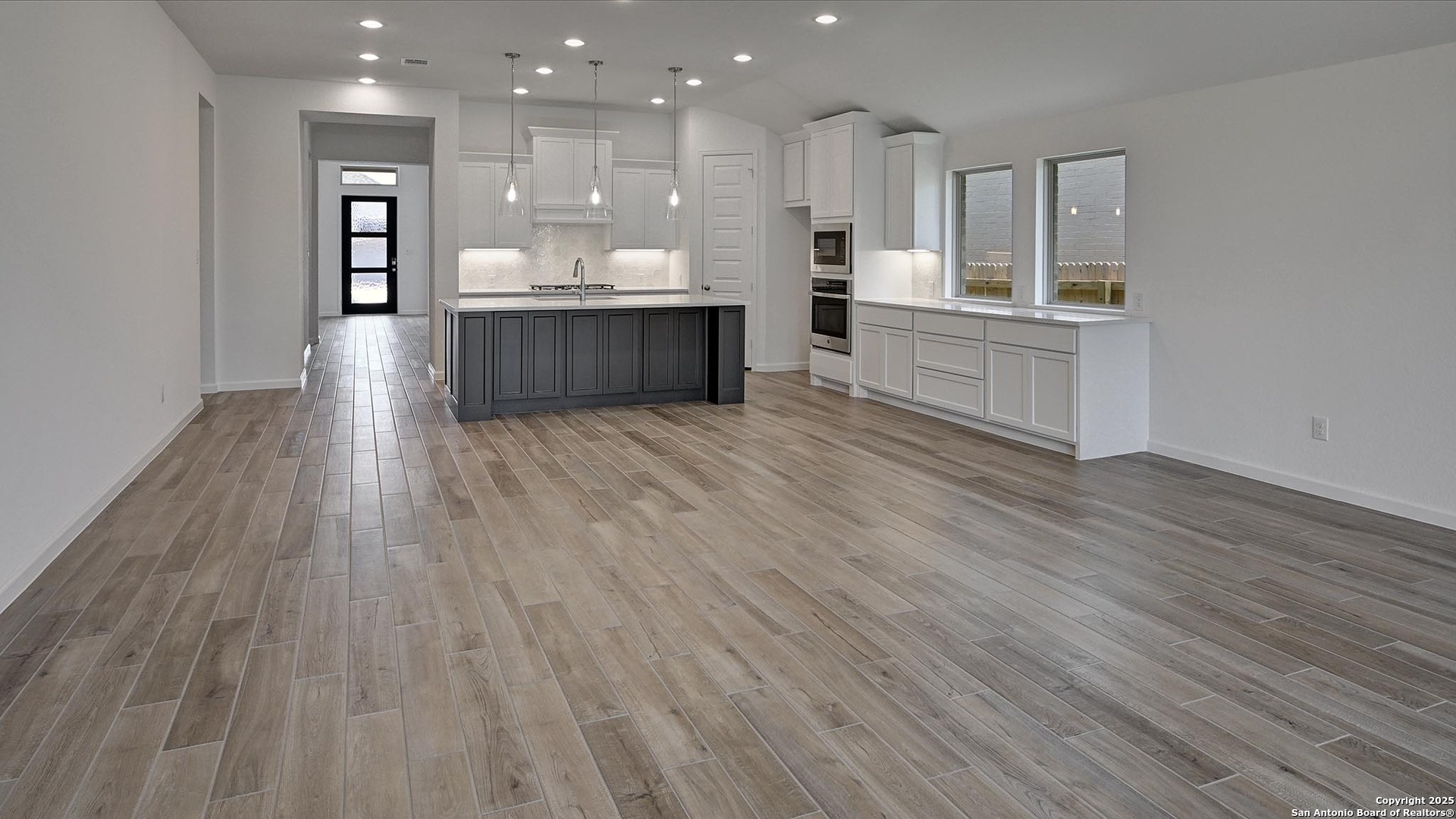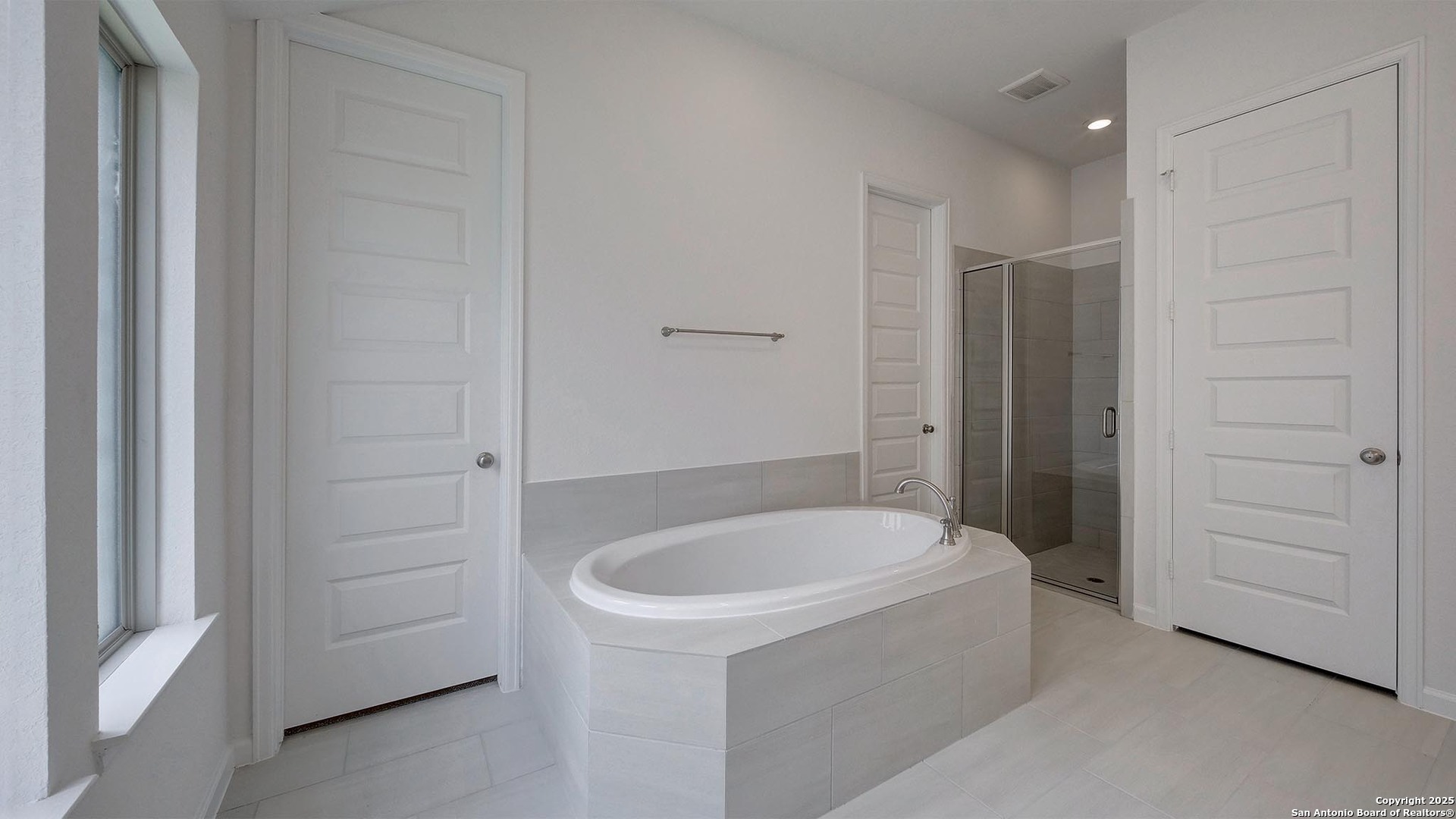 READY FOR MOVE-IN! Home office with French doors set at entry with 12-foot ceiling. Extended entry leads to open kitchen, dining area and family room. Kitchen features corner walk-in pantry, 5-burner gas cooktop, generous counter space and island with built-in seating space. Dining area flows into family room with wall of windows. Primary suite includes double-door entry to primary bath with dual vanities, garden tub, separate glass-enclosed shower and two large walk-in closets. A guest suite with private bath adds to this spacious one-story home. Extended covered backyard patio and 5-zone sprinkler system. Mud room off two-car garage.