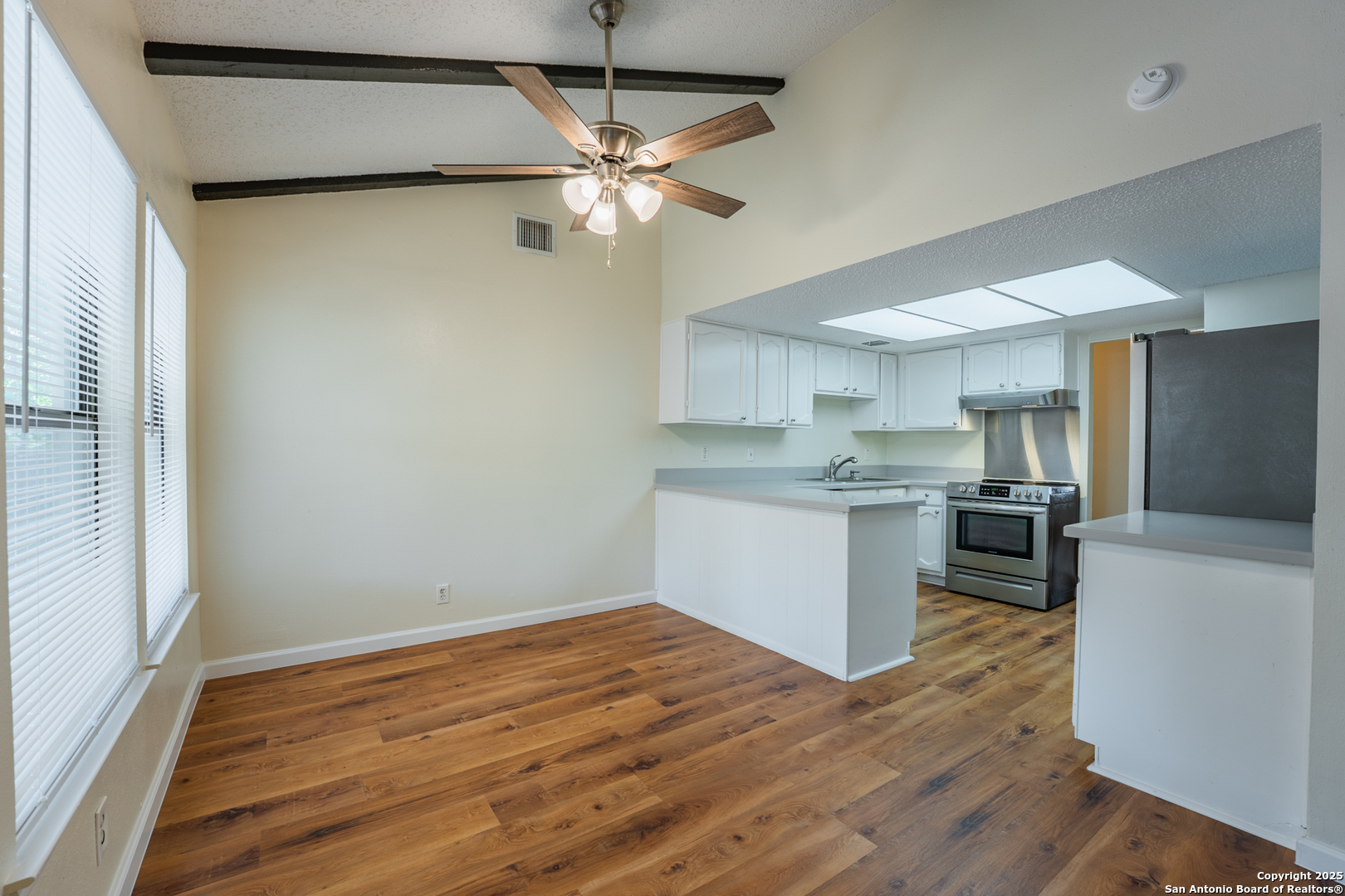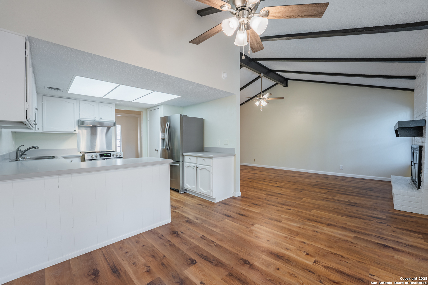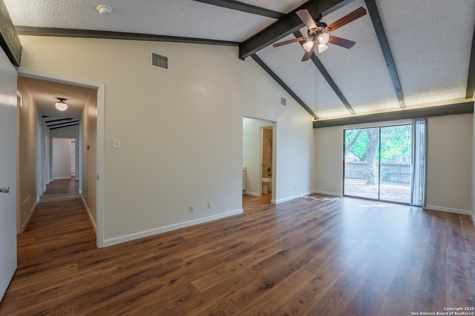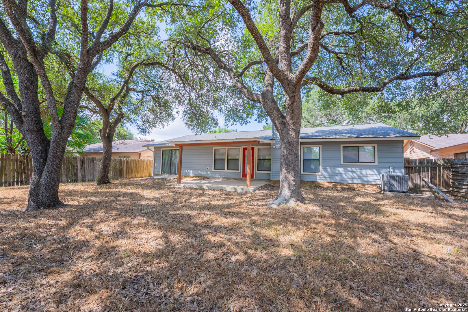 Tucked into a tree-lined neighborhood in Converse, this beautifully updated single-story home blends rustic charm with timeless Texas appeal. Step inside, and you're instantly welcomed by soaring vaulted ceilings and exposed wooden beams that bring warmth and character to both the living and dining areas. A classic gas brick fireplace anchors the living room with cozy charm. Brand new luxury vinyl plank flooring runs throughout the home, paired with fresh interior paint to create a clean, modern canvas that's ready for your personal touch. While the kitchen and living room are divided, the layout still maintains a comfortable sense of flow with the living room connecting to a casual dining area, and a second living or dining space just off the front entry, giving you the flexibility to make the home work for your lifestyle. Privately positioned on one side of the home, the primary bedroom offers a peaceful retreat, complete with those same vaulted ceilings and rustic beam details. The en-suite bath includes a shower-tub combo and space to relax. On the opposite side, you'll find two additional bedrooms and a second full bathroom - ideal for guests, a home office, or flexible living. Step outside, and the charm continues. The large backyard is shaded by mature trees and features a covered patio - perfect for weekend lounging, evening dinners, or quiet morning coffee. A full two-car garage provides plenty of room for parking or storage. And with no HOA, you'll enjoy the freedom to truly make this space your own. With nearby parks, shopping, dining, and entertainment - plus quick access to the city's major highways - this location keeps daily life easy and well-connected. If you're looking for a move-in-ready home that offers character, space, and flexibility - 9726 Cylburn Park is ready to welcome you.