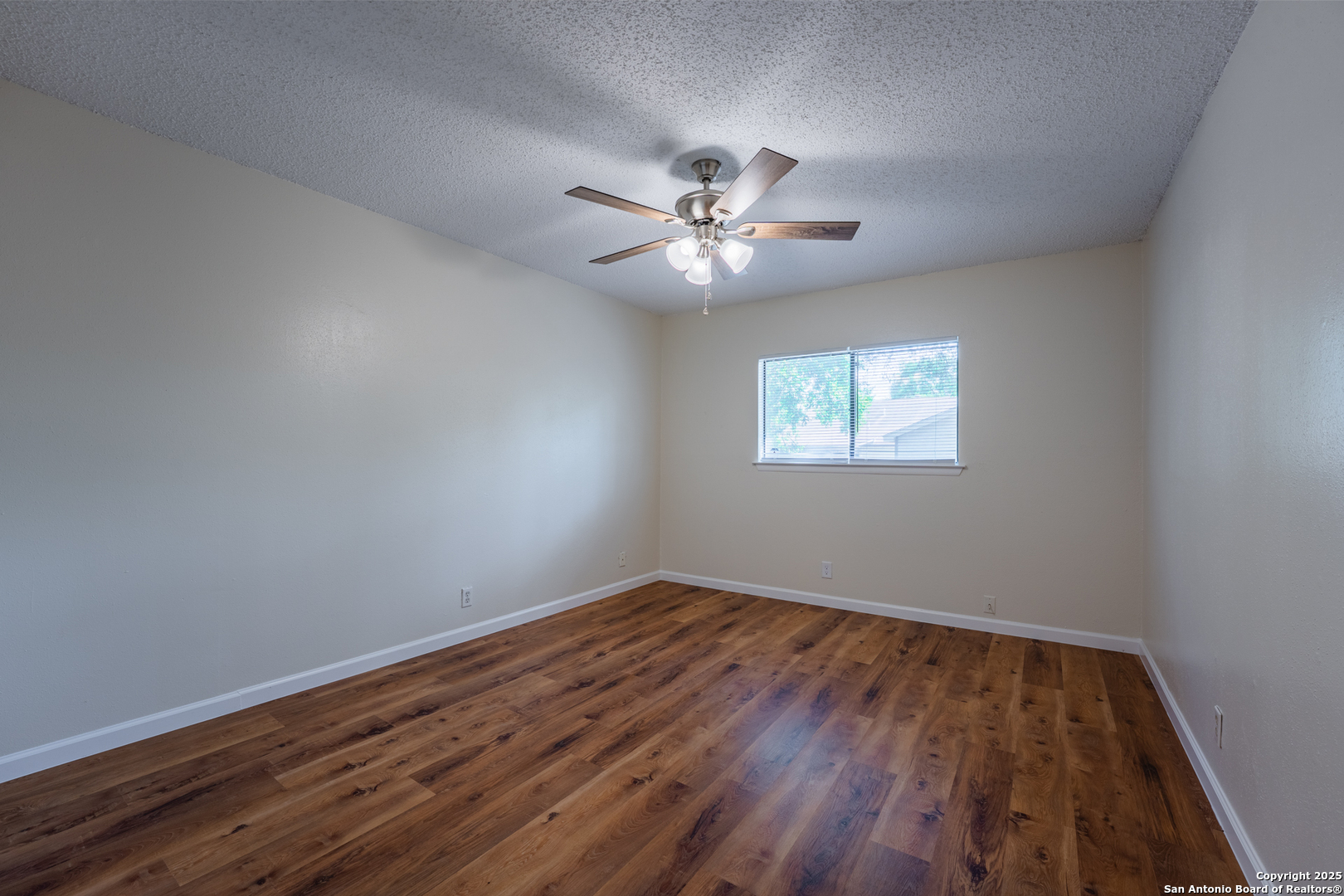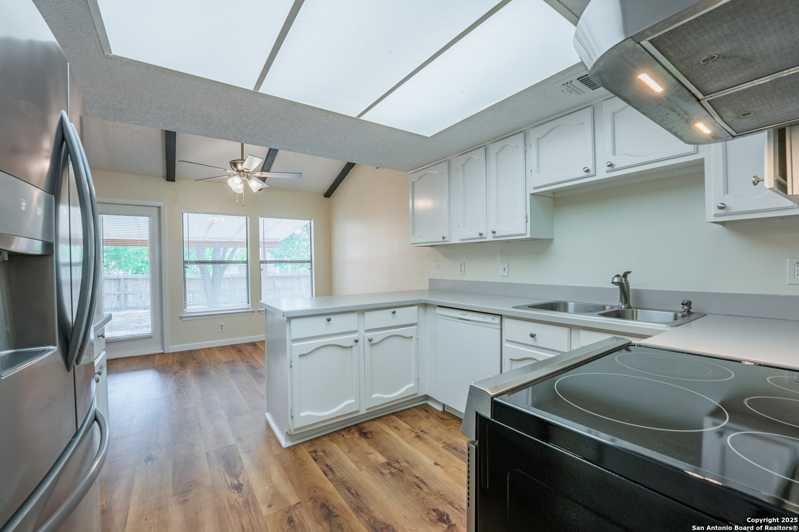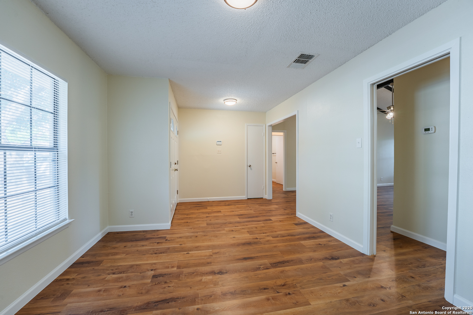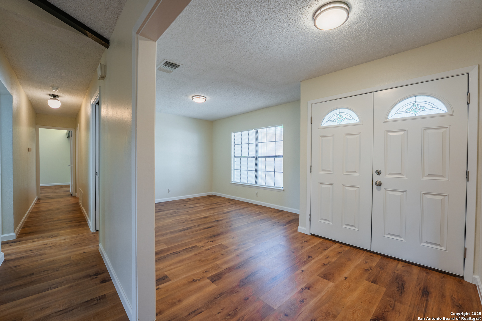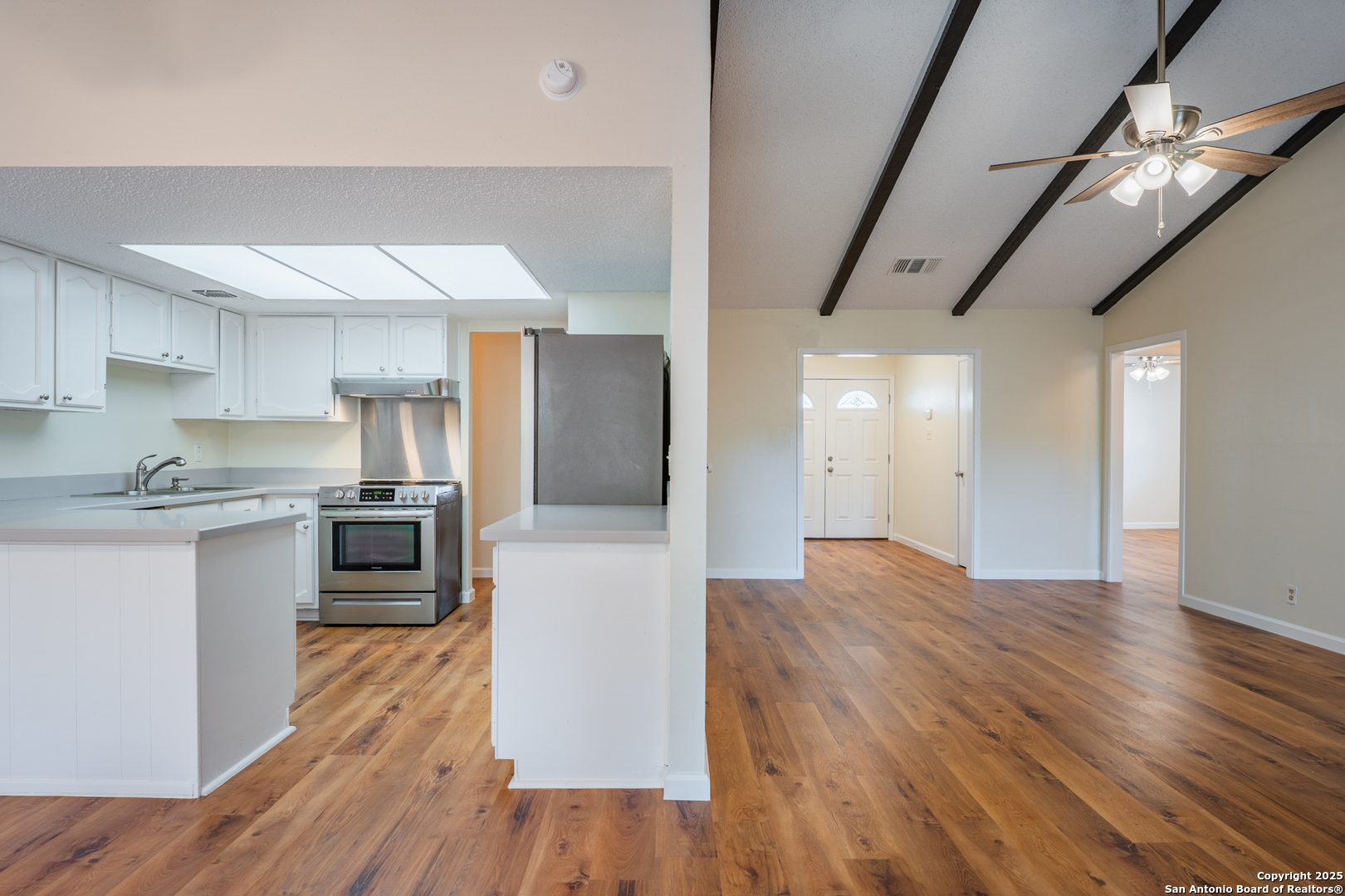 Tucked into a tree-lined neighborhood in Converse, this beautifully updated single-story home blends rustic charm with timeless Texas appeal. Step inside, and you're instantly welcomed by soaring vaulted ceilings and exposed wooden beams that bring warmth and character to both the living and dining areas. A classic gas brick fireplace anchors the living room with cozy charm. Brand new luxury vinyl plank flooring runs throughout the home, paired with fresh interior paint to create a clean, modern canvas that's ready for your personal touch. While the kitchen and living room are divided, the layout still maintains a comfortable sense of flow with the living room connecting to a casual dining area, and a second living or dining space just off the front entry, giving you the flexibility to make the home work for your lifestyle. Privately positioned on one side of the home, the primary bedroom offers a peaceful retreat, complete with those same vaulted ceilings and rustic beam details. The en-suite bath includes a shower-tub combo and space to relax. On the opposite side, you'll find two additional bedrooms and a second full bathroom - ideal for guests, a home office, or flexible living. Step outside, and the charm continues. The large backyard is shaded by mature trees and features a covered patio - perfect for weekend lounging, evening dinners, or quiet morning coffee. A full two-car garage provides plenty of room for parking or storage. And with no HOA, you'll enjoy the freedom to truly make this space your own. With nearby parks, shopping, dining, and entertainment - plus quick access to the city's major highways - this location keeps daily life easy and well-connected. If you're looking for a move-in-ready home that offers character, space, and flexibility - 9726 Cylburn Park is ready to welcome you.