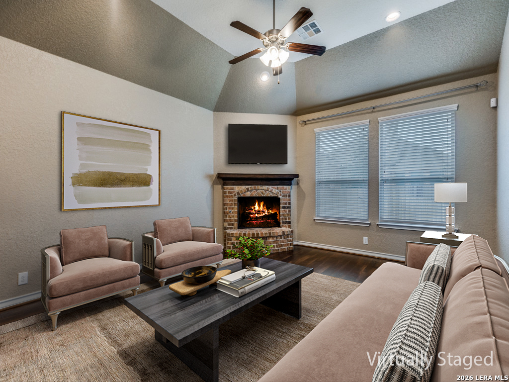 Fabulous all-brick 1-story home built by Highland Homes in the highly sought-after Balcones Creek neighborhood. Rich hardwood floors, soaring ceilings, and an open-concept layout create a bright and inviting atmosphere. The island kitchen features granite countertops, stainless steel appliances, gas cooking, and opens seamlessly to the dining area and spacious living room with a cozy fireplace. The private primary suite offers a spa-like bath with dual vanities, a soaking tub, and a separate oversized shower. Relax or entertain on the covered back patio. Enjoy exceptional neighborhood amenities in this wonderful community including gated access, pool, clubhouse, park/playground and walking trails.
