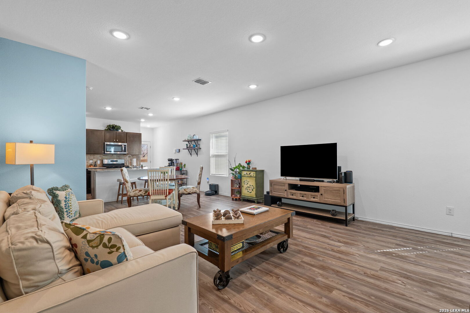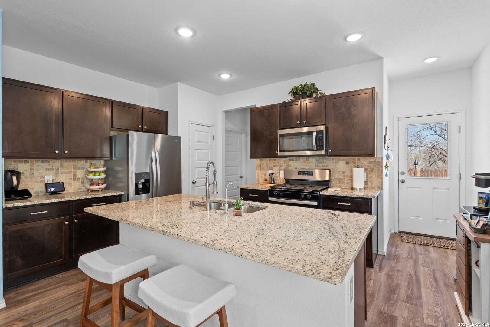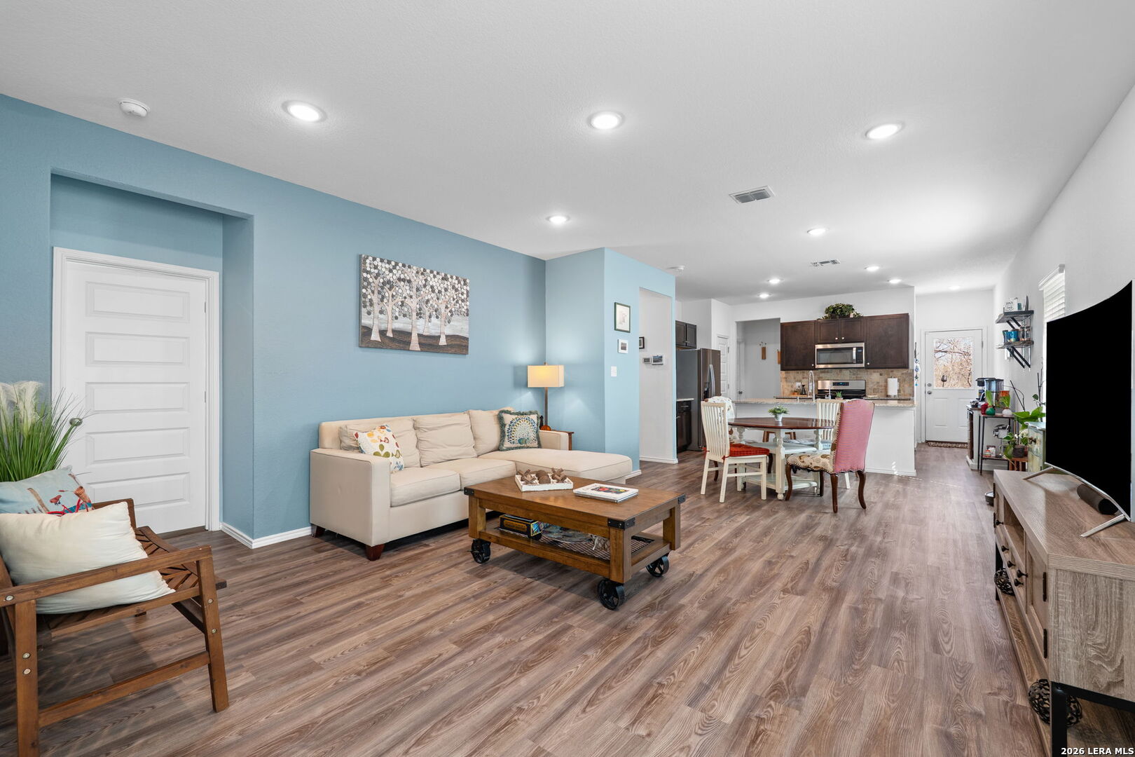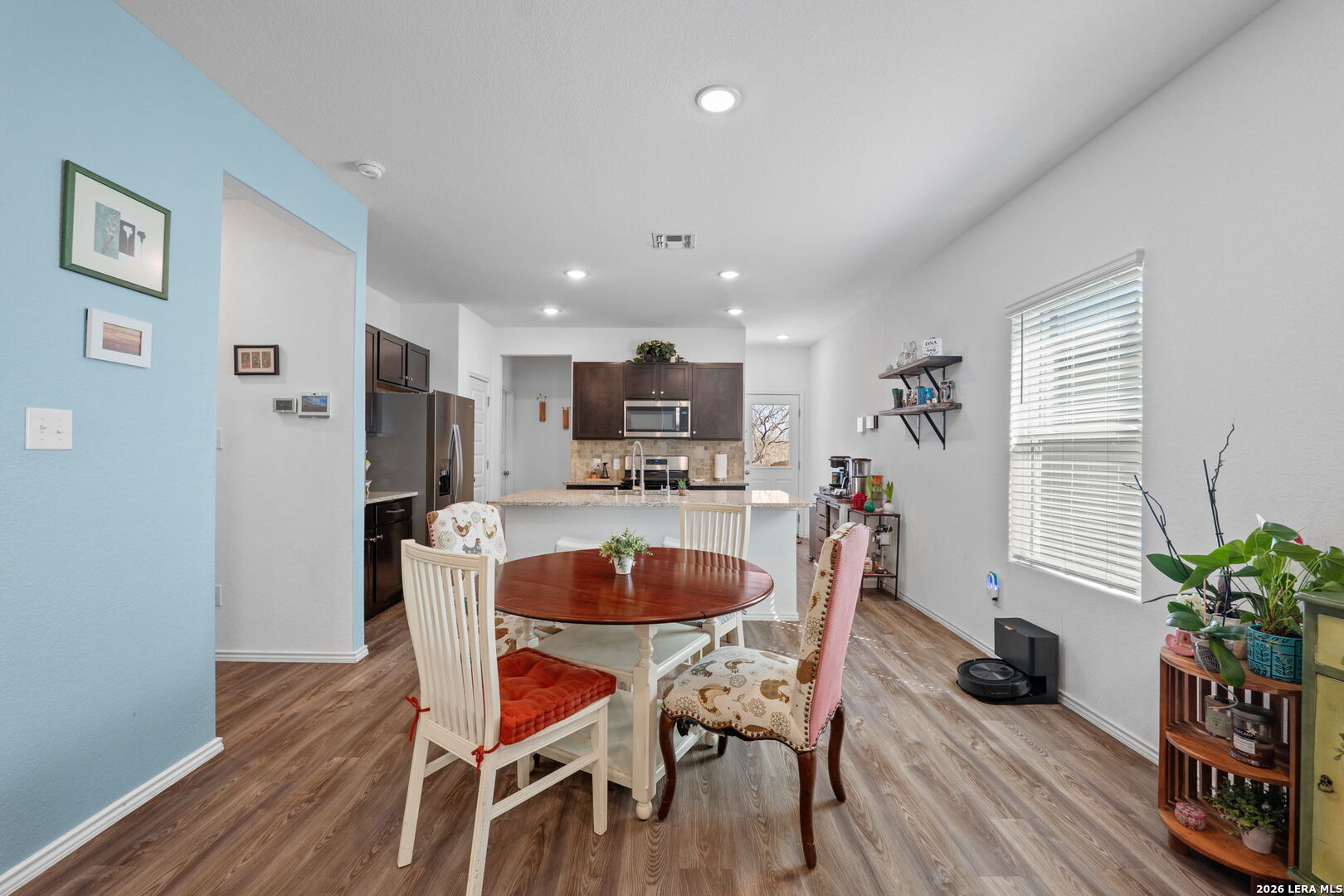 Welcome to this stylish and thoughtfully designed home that blends comfort with functionality. The heart of the home features an open-concept living space where the great room, dining area, and kitchen flow seamlessly together. The kitchen is beautifully appointed with 36" cabinetry, granite countertops with tumbled stone backsplash, a center island perfect for gathering, and a generous pantry. Luxury wood-look vinyl plank flooring enhances the entire home (no carpet), while additional recessed lighting brightens both the great room and primary bath. Privately situated at the back of the home, the primary suite offers a peaceful retreat complete with dual vanities, cultured marble countertops, modern rectangular sinks, a linen closet, walk-in shower, walk-in closet with custom decorative shelving, and a separate water closet for added privacy. A custom-designed and painted accent wall in the primary bedroom adds a distinctive touch, complemented by accent paint throughout the home. Additional upgraded touches include decorative shelving in the guest bath, laundry room, and garage, along with custom window blinds. Step outside to enjoy the 10x10 uncovered patio-perfect for relaxing or entertaining. Exceptional included features such as the Century Home Connect smart home package enhance everyday living. Refrigerator, washer, and dryer are also included with purchase, making this home truly move-in ready.