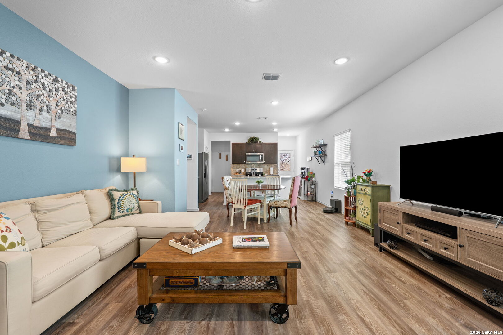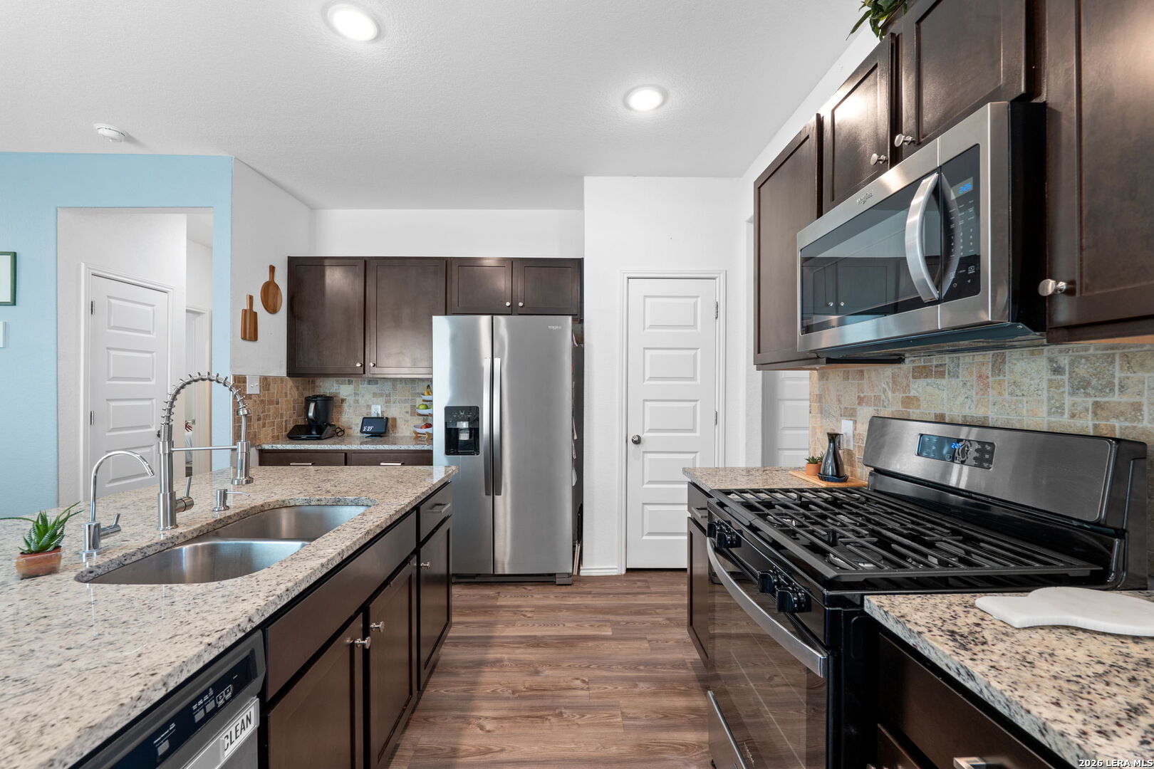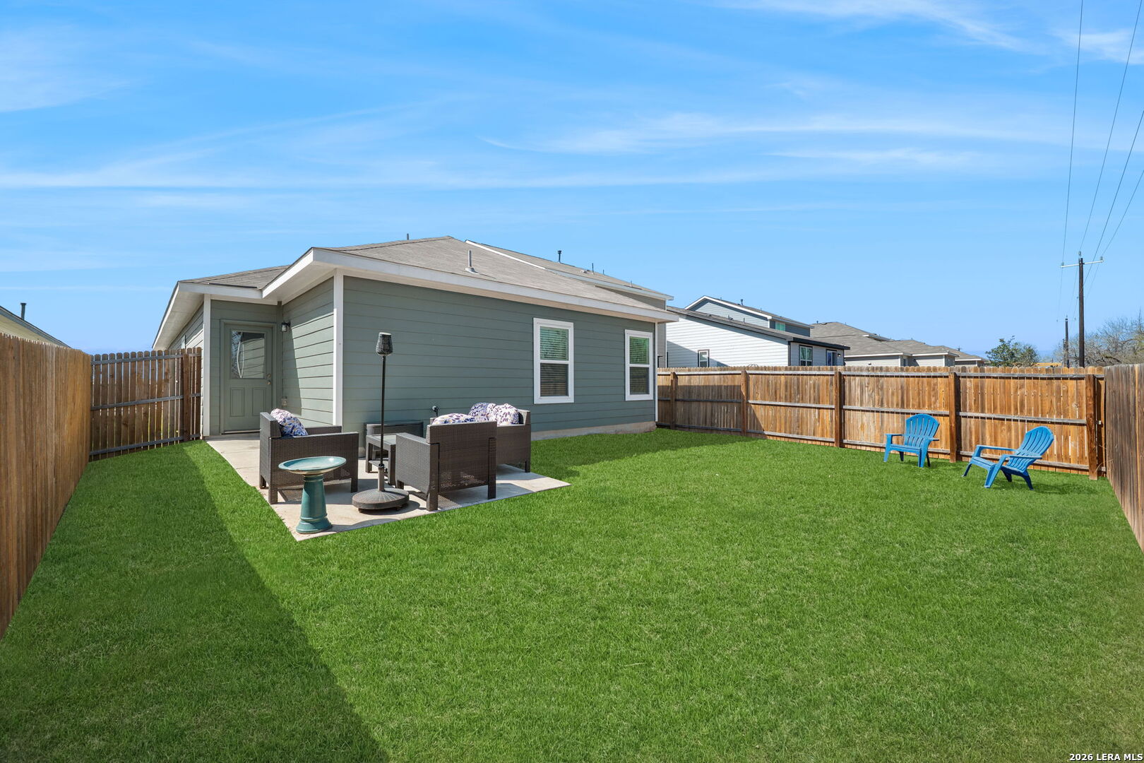 Welcome to this stylish and thoughtfully designed home that blends comfort with functionality. The heart of the home features an open-concept living space where the great room, dining area, and kitchen flow seamlessly together. The kitchen is beautifully appointed with 36" cabinetry, granite countertops with tumbled stone backsplash, a center island perfect for gathering, and a generous pantry. Luxury wood-look vinyl plank flooring enhances the entire home (no carpet), while additional recessed lighting brightens both the great room and primary bath. Privately situated at the back of the home, the primary suite offers a peaceful retreat complete with dual vanities, cultured marble countertops, modern rectangular sinks, a linen closet, walk-in shower, walk-in closet with custom decorative shelving, and a separate water closet for added privacy. A custom-designed and painted accent wall in the primary bedroom adds a distinctive touch, complemented by accent paint throughout the home. Additional upgraded touches include decorative shelving in the guest bath, laundry room, and garage, along with custom window blinds. Step outside to enjoy the 10x10 uncovered patio-perfect for relaxing or entertaining. Exceptional included features such as the Century Home Connect smart home package enhance everyday living. Refrigerator, washer, and dryer are also included with purchase, making this home truly move-in ready.