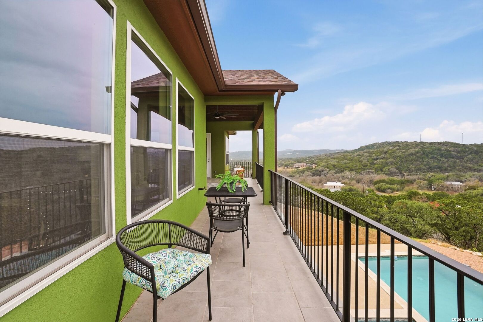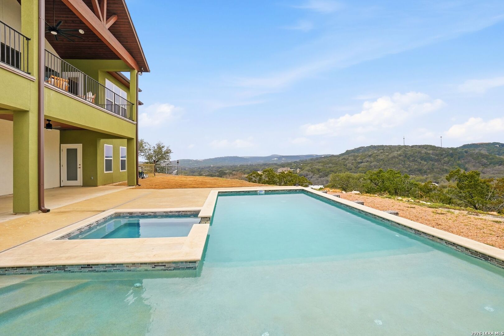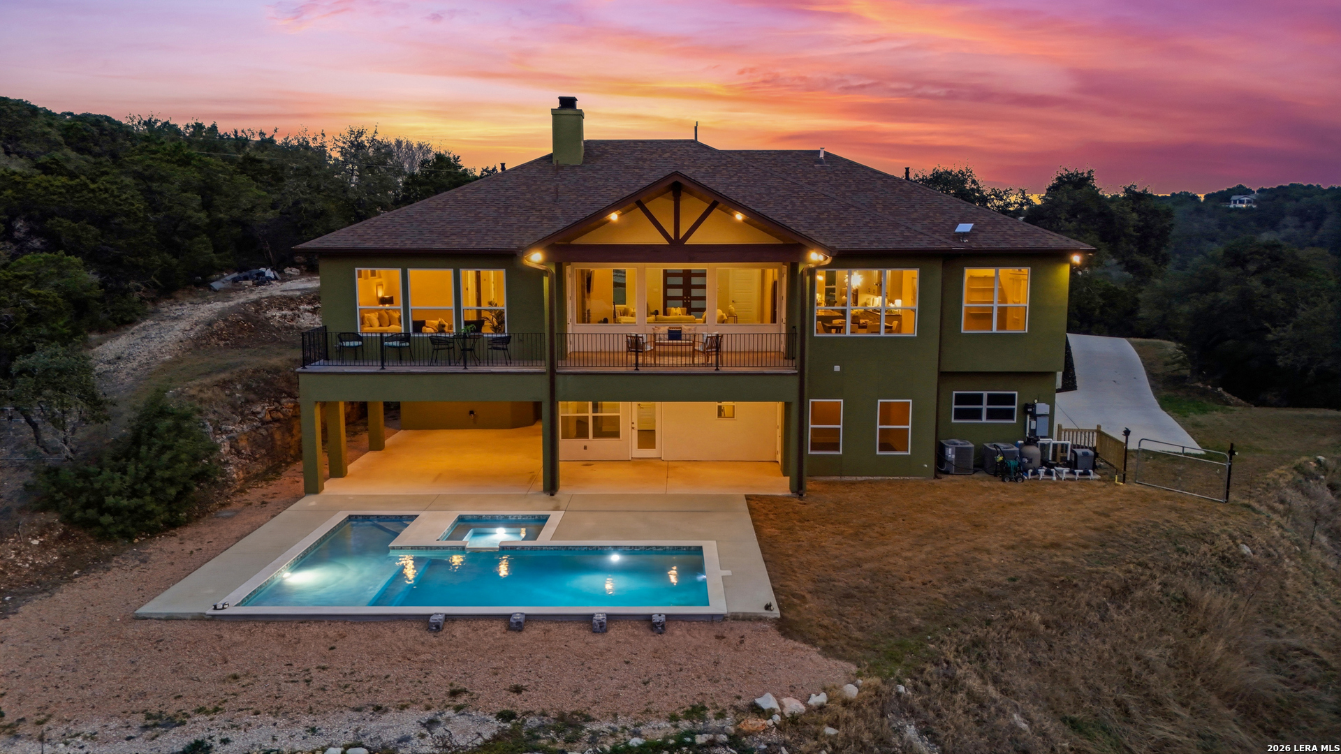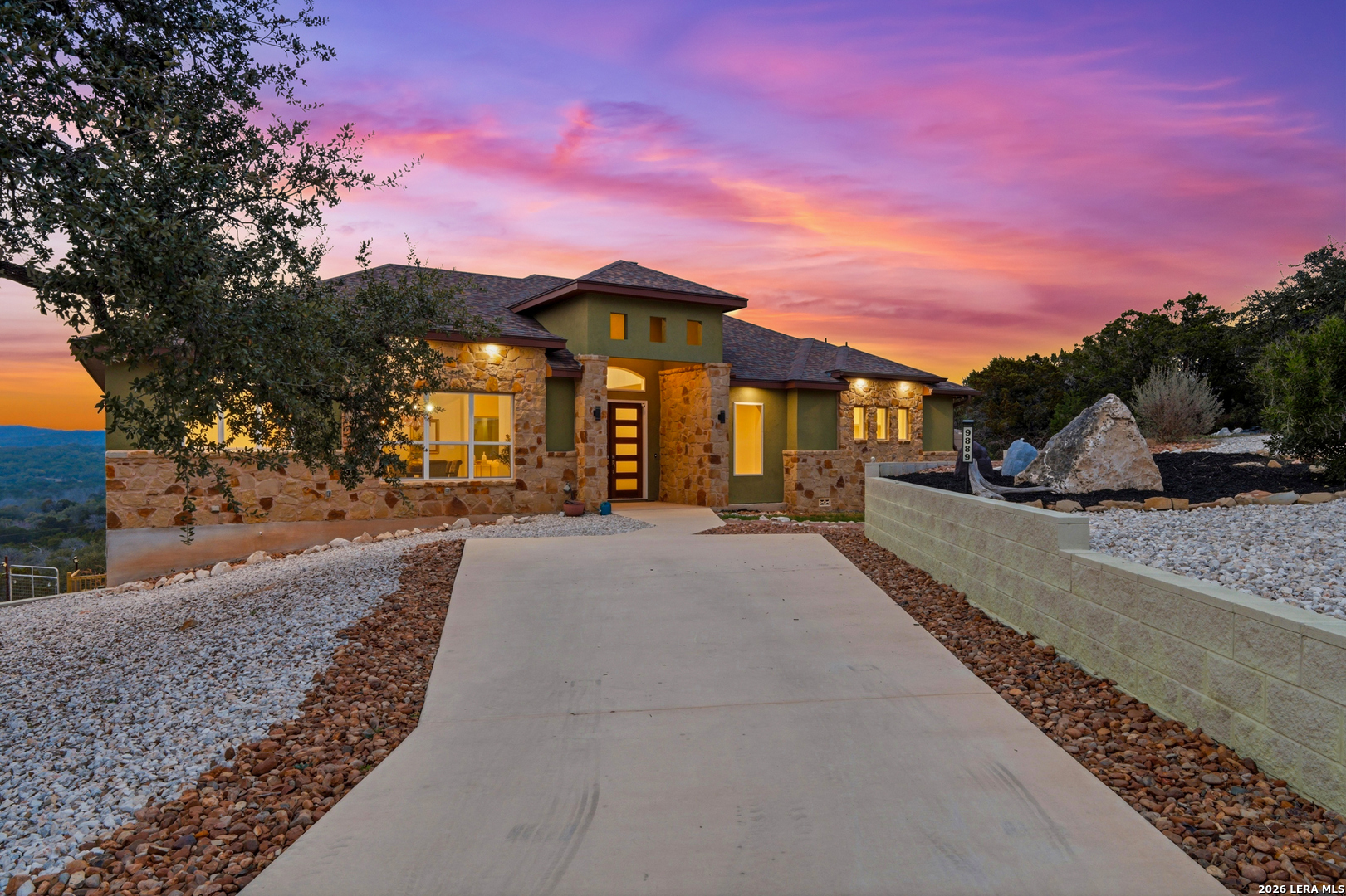 Perched high above the Texas Hill Country, this breathtaking custom estate delivers panoramic sunset views, refined finishes, and exceptional indoor-outdoor living. From the moment you arrive, the striking stone facade, modern double front doors, and expansive hilltop setting set the tone for what awaits inside. The main level showcases an open-concept design anchored by a dramatic floor-to-ceiling stone fireplace and soaring ceilings. Walls of windows frame sweeping views and fill the home with natural light. The chef's kitchen is a true showpiece featuring custom cabinetry, designer pendant lighting, a statement stone backsplash, gas cooktop, built-in appliances, and an oversized island with abundant seating. A spacious dining area and breakfast nook flow seamlessly for everyday living or hosting guests. The private primary suite is a luxurious retreat with serene views, spa-inspired bath, soaking tub, walk-in shower, dual vanities, and generous closet space. Secondary bedrooms are well-appointed and thoughtfully positioned for comfort and privacy. Downstairs offers additional living space ideal for a game room, guest quarters, or multi-generational living, with direct access to the expansive covered patio. Step outside to your resort-style backyard complete with a stunning pool and spa. Whether enjoying morning coffee or unforgettable Texas sunsets, this property offers the ultimate private escape. A rare opportunity to own a beautifully designed hilltop retreat with luxury finishes, flexible living space, and spectacular views-this is Texas living at its finest!