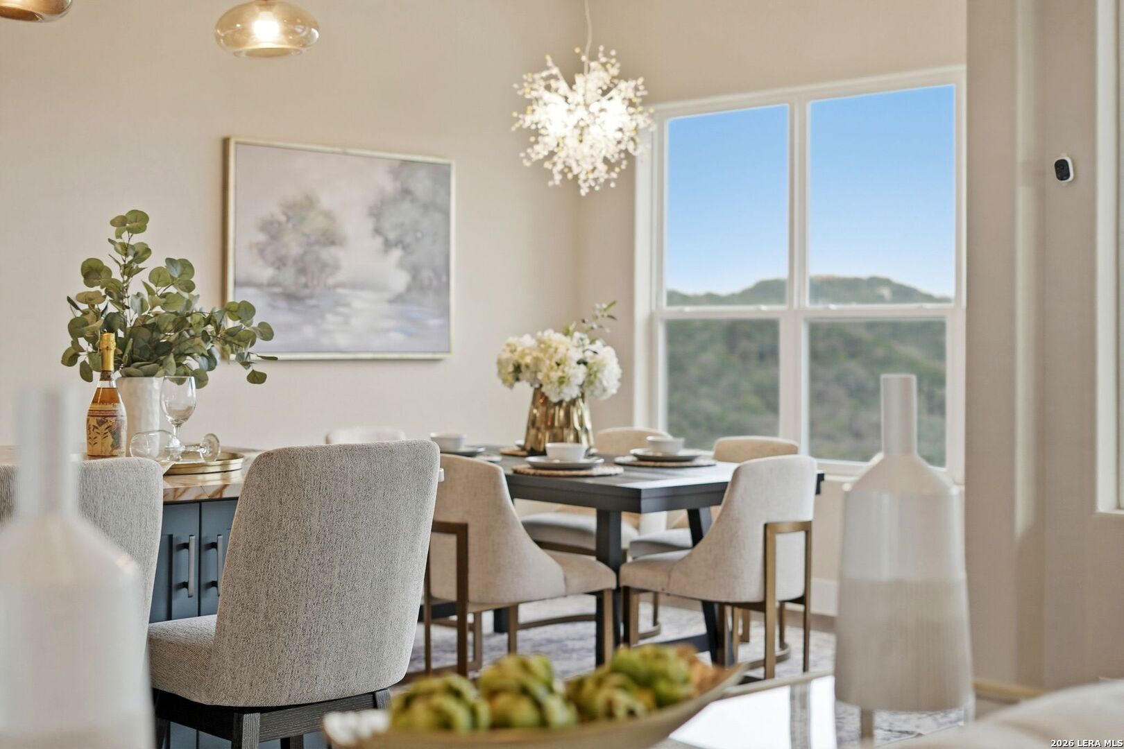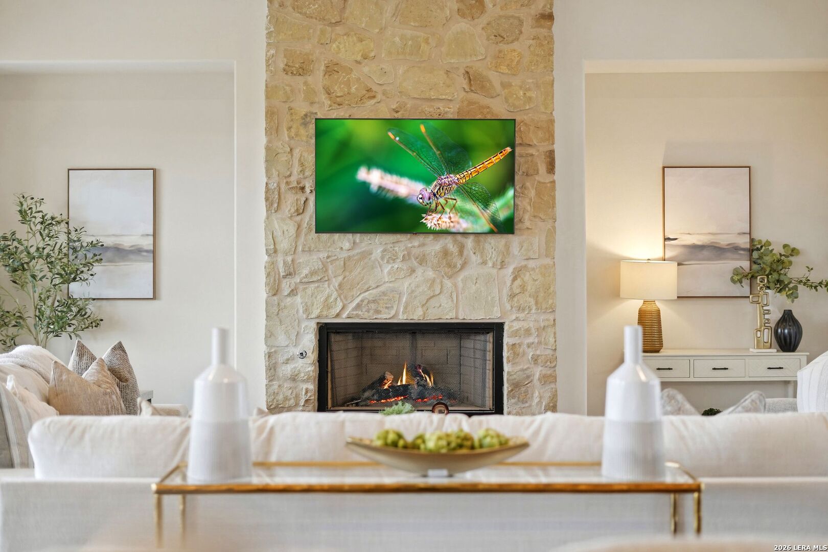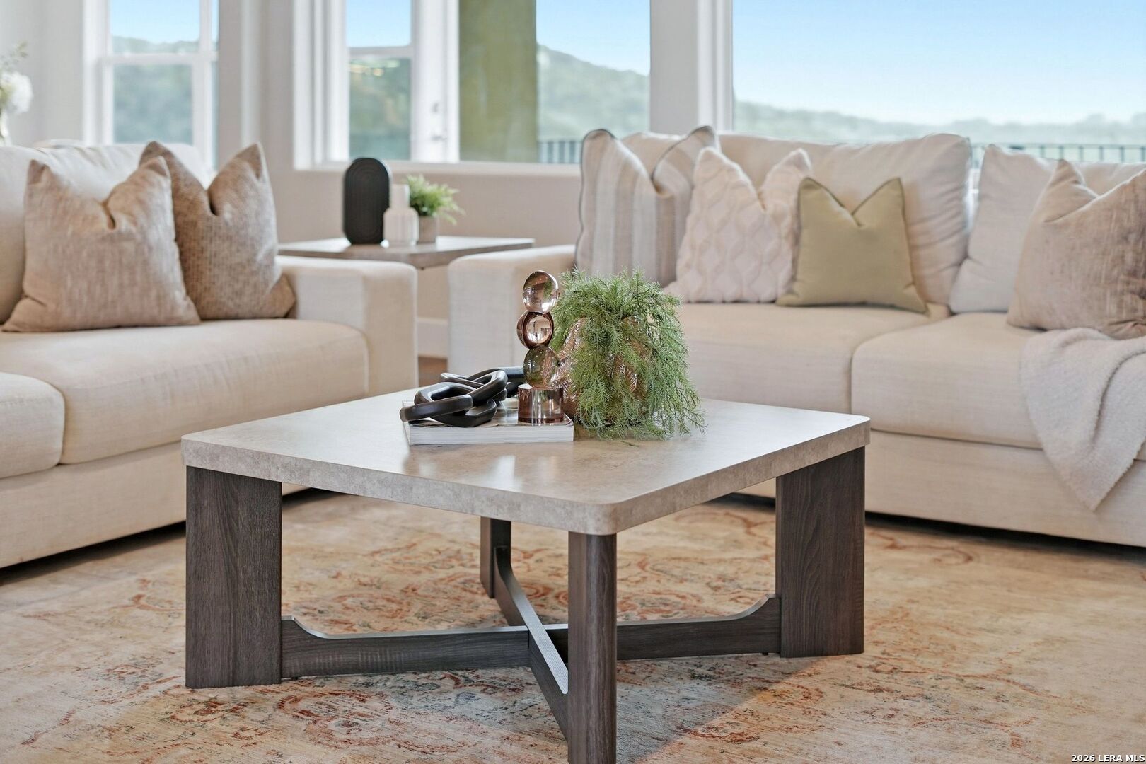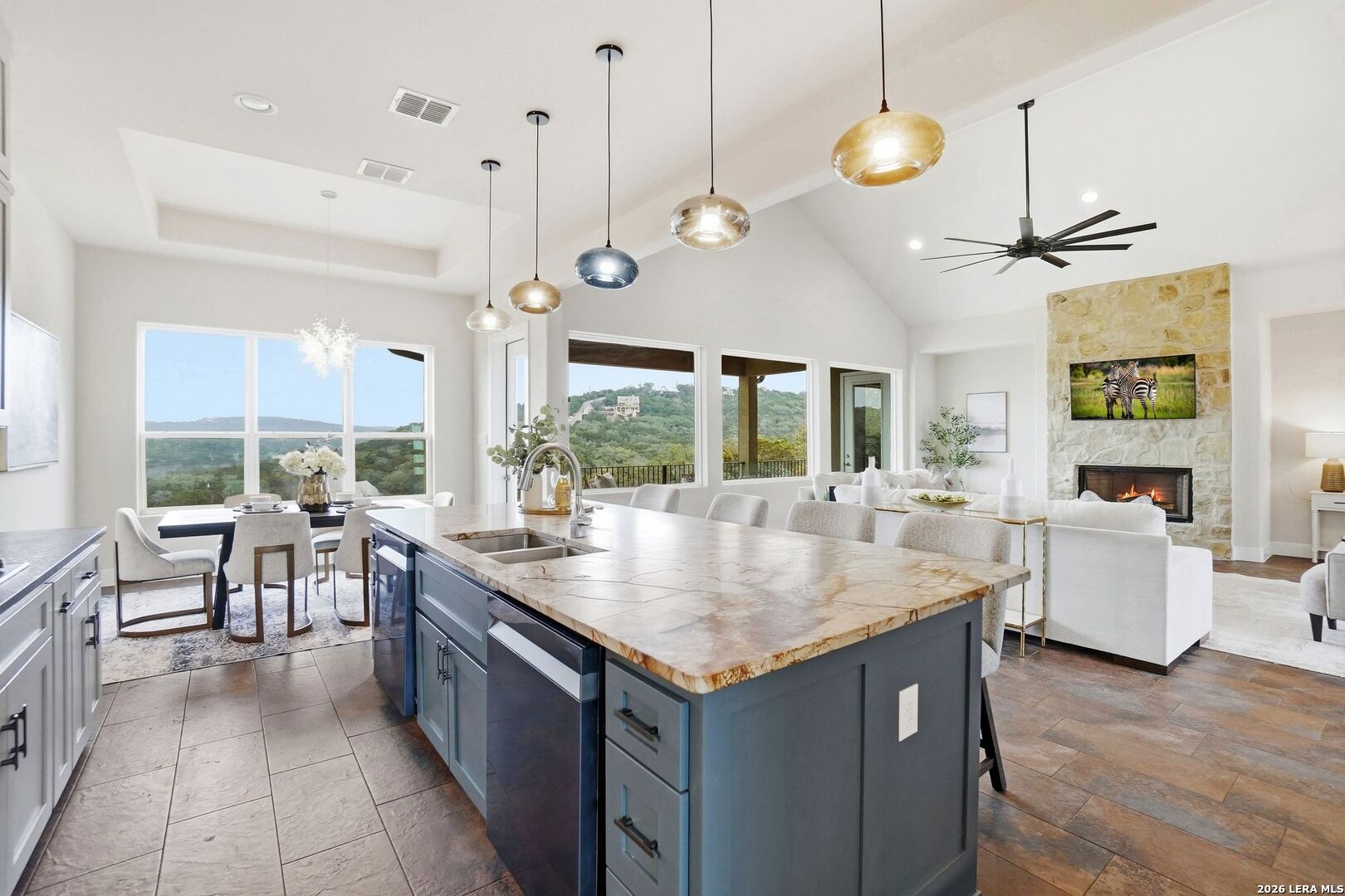 Perched high above the Texas Hill Country, this breathtaking custom estate delivers panoramic sunset views, refined finishes, and exceptional indoor-outdoor living. From the moment you arrive, the striking stone facade, modern double front doors, and expansive hilltop setting set the tone for what awaits inside. The main level showcases an open-concept design anchored by a dramatic floor-to-ceiling stone fireplace and soaring ceilings. Walls of windows frame sweeping views and fill the home with natural light. The chef's kitchen is a true showpiece featuring custom cabinetry, designer pendant lighting, a statement stone backsplash, gas cooktop, built-in appliances, and an oversized island with abundant seating. A spacious dining area and breakfast nook flow seamlessly for everyday living or hosting guests. The private primary suite is a luxurious retreat with serene views, spa-inspired bath, soaking tub, walk-in shower, dual vanities, and generous closet space. Secondary bedrooms are well-appointed and thoughtfully positioned for comfort and privacy. Downstairs offers additional living space ideal for a game room, guest quarters, or multi-generational living, with direct access to the expansive covered patio. Step outside to your resort-style backyard complete with a stunning pool and spa. Whether enjoying morning coffee or unforgettable Texas sunsets, this property offers the ultimate private escape. A rare opportunity to own a beautifully designed hilltop retreat with luxury finishes, flexible living space, and spectacular views-this is Texas living at its finest!