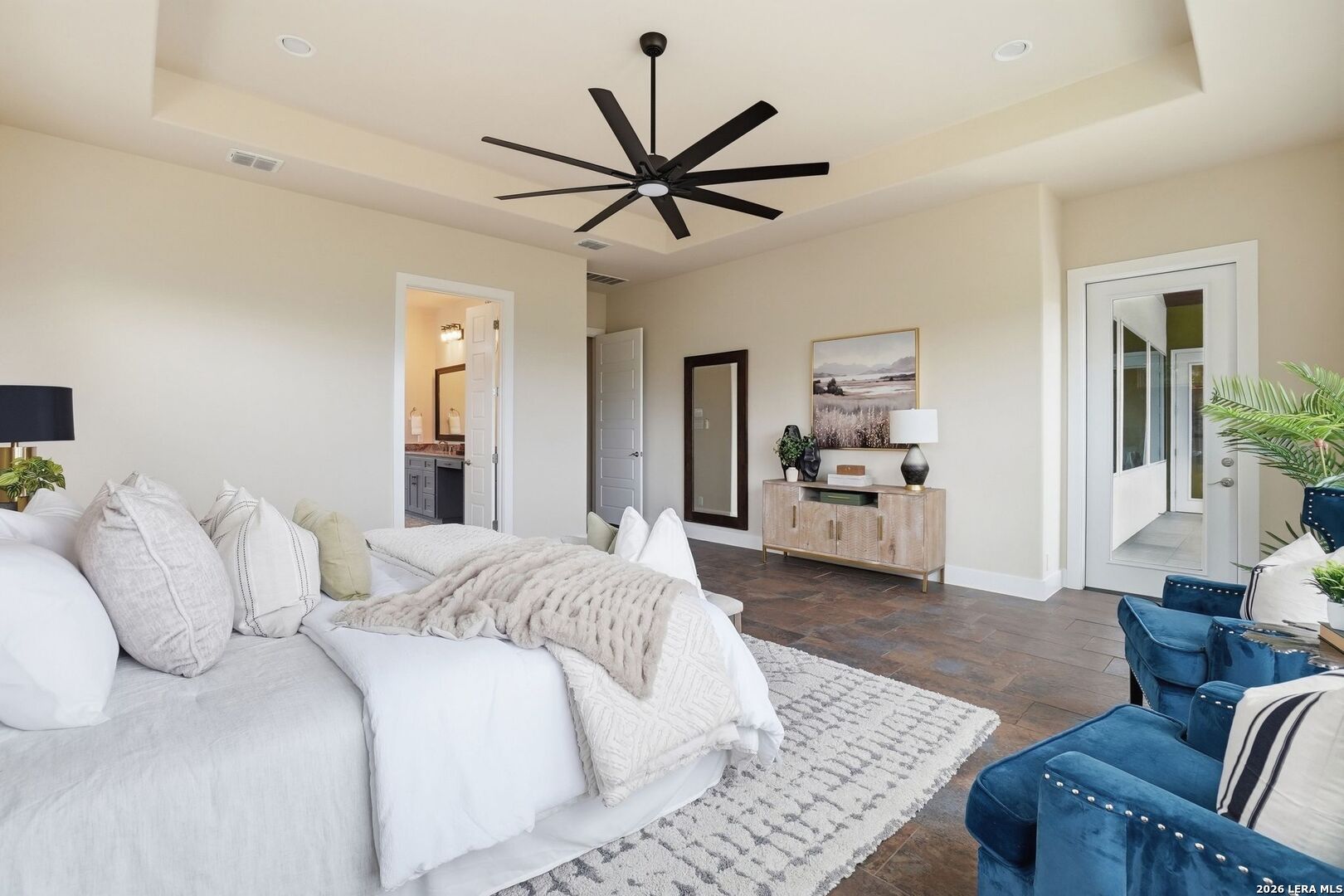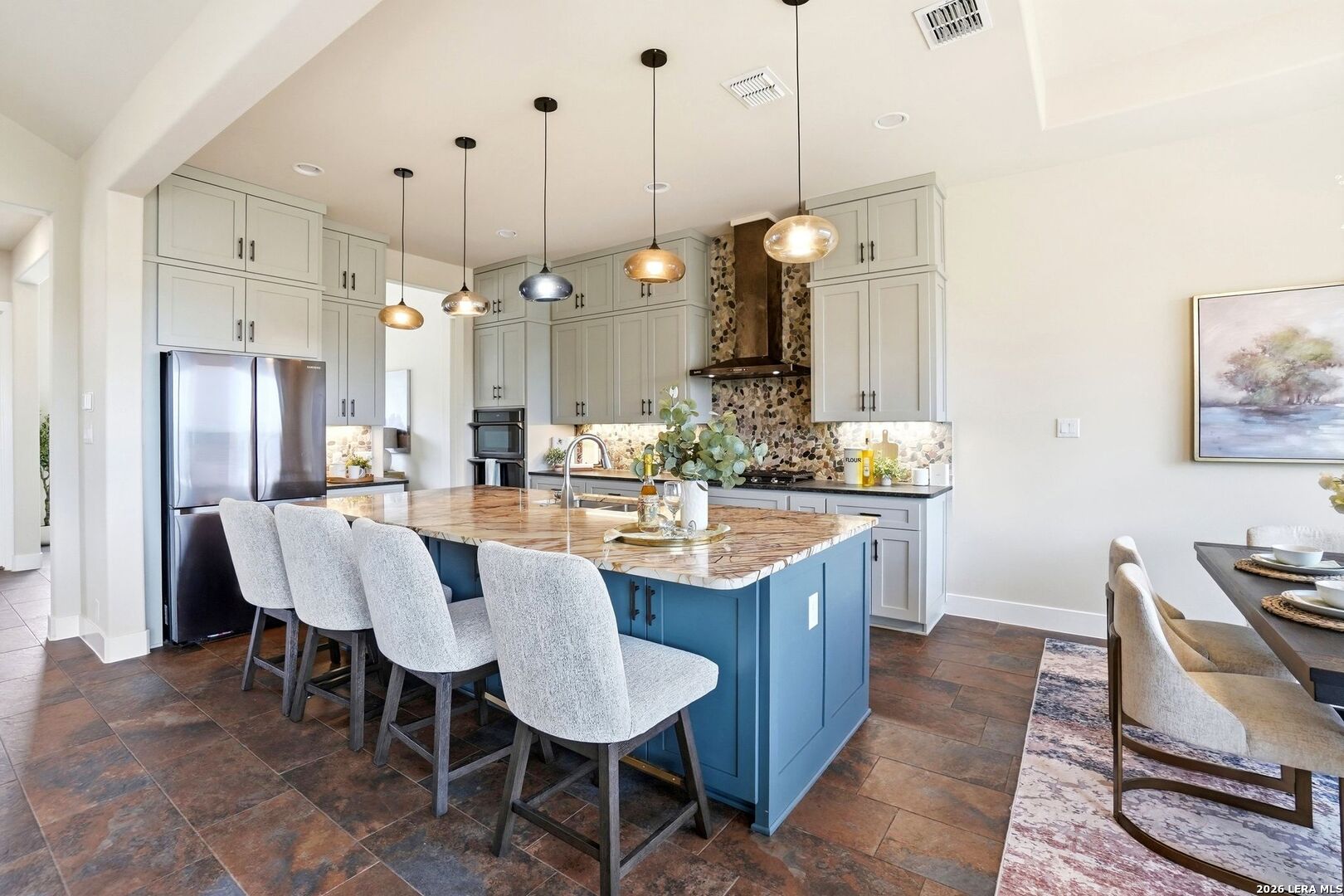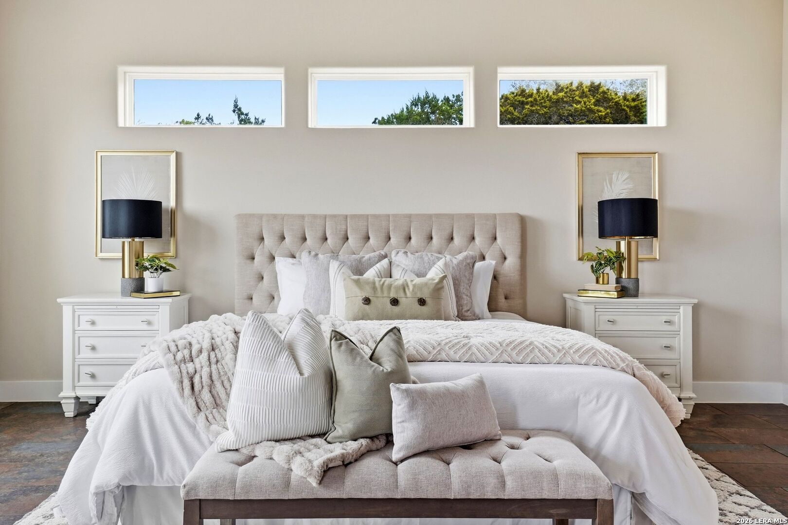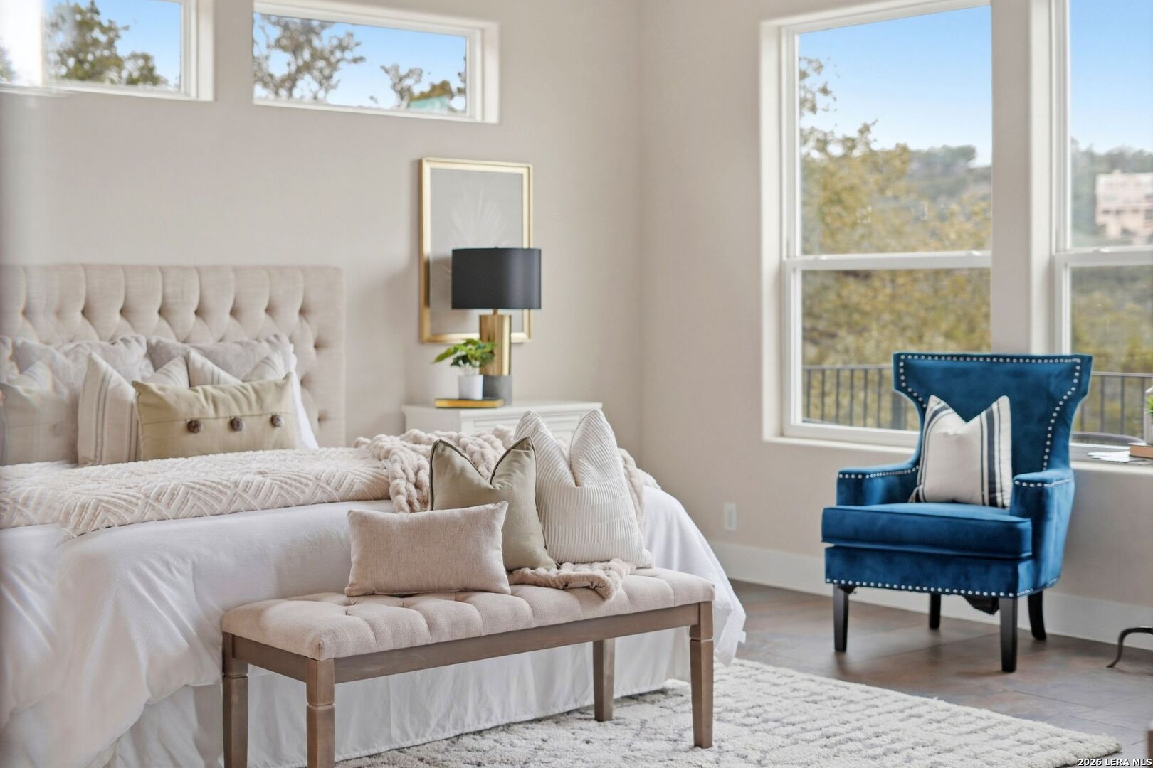 Perched high above the Texas Hill Country, this breathtaking custom estate delivers panoramic sunset views, refined finishes, and exceptional indoor-outdoor living. From the moment you arrive, the striking stone facade, modern double front doors, and expansive hilltop setting set the tone for what awaits inside. The main level showcases an open-concept design anchored by a dramatic floor-to-ceiling stone fireplace and soaring ceilings. Walls of windows frame sweeping views and fill the home with natural light. The chef's kitchen is a true showpiece featuring custom cabinetry, designer pendant lighting, a statement stone backsplash, gas cooktop, built-in appliances, and an oversized island with abundant seating. A spacious dining area and breakfast nook flow seamlessly for everyday living or hosting guests. The private primary suite is a luxurious retreat with serene views, spa-inspired bath, soaking tub, walk-in shower, dual vanities, and generous closet space. Secondary bedrooms are well-appointed and thoughtfully positioned for comfort and privacy. Downstairs offers additional living space ideal for a game room, guest quarters, or multi-generational living, with direct access to the expansive covered patio. Step outside to your resort-style backyard complete with a stunning pool and spa. Whether enjoying morning coffee or unforgettable Texas sunsets, this property offers the ultimate private escape. A rare opportunity to own a beautifully designed hilltop retreat with luxury finishes, flexible living space, and spectacular views-this is Texas living at its finest!