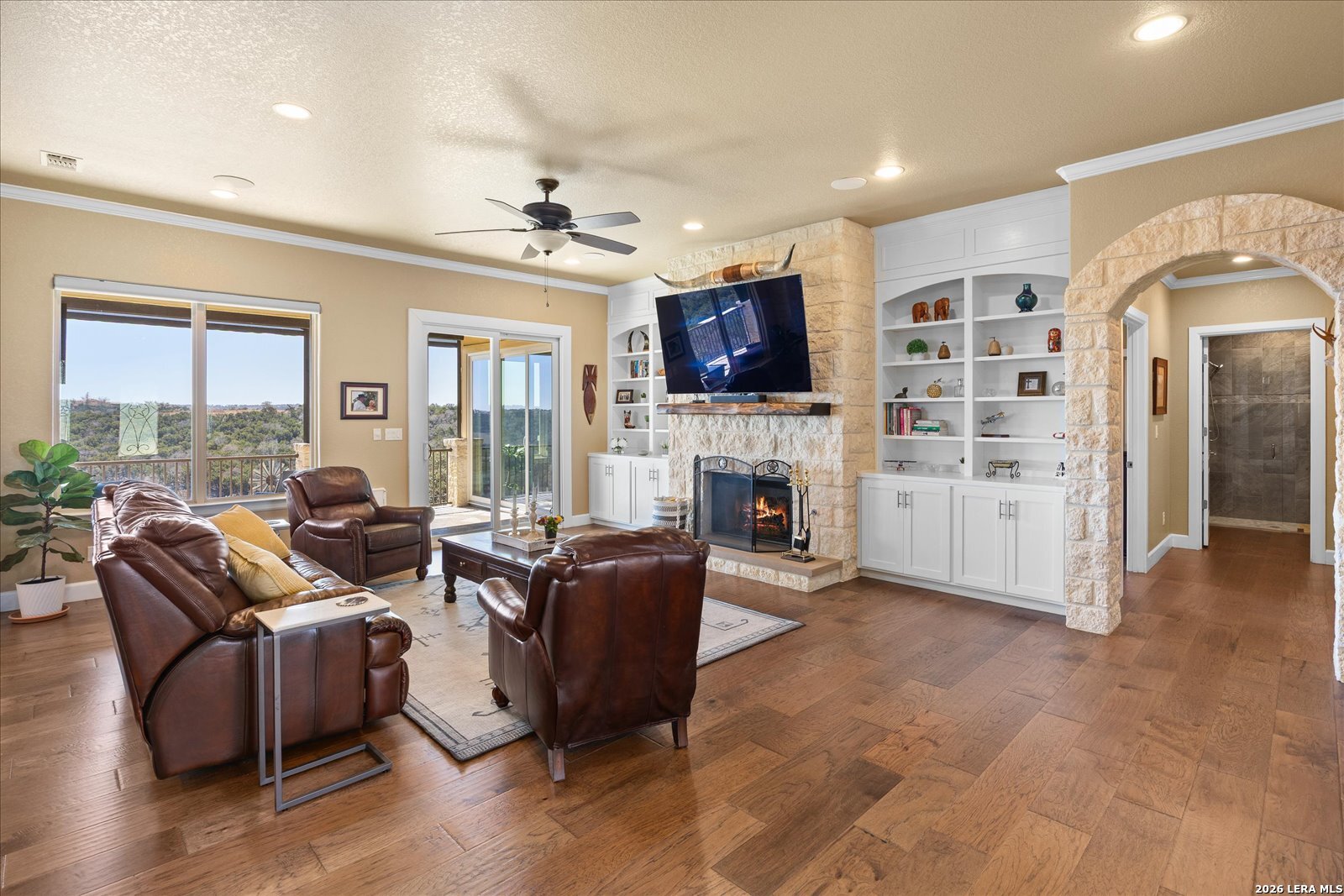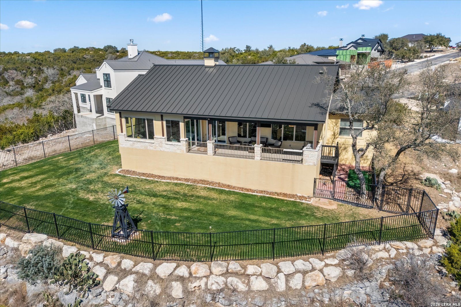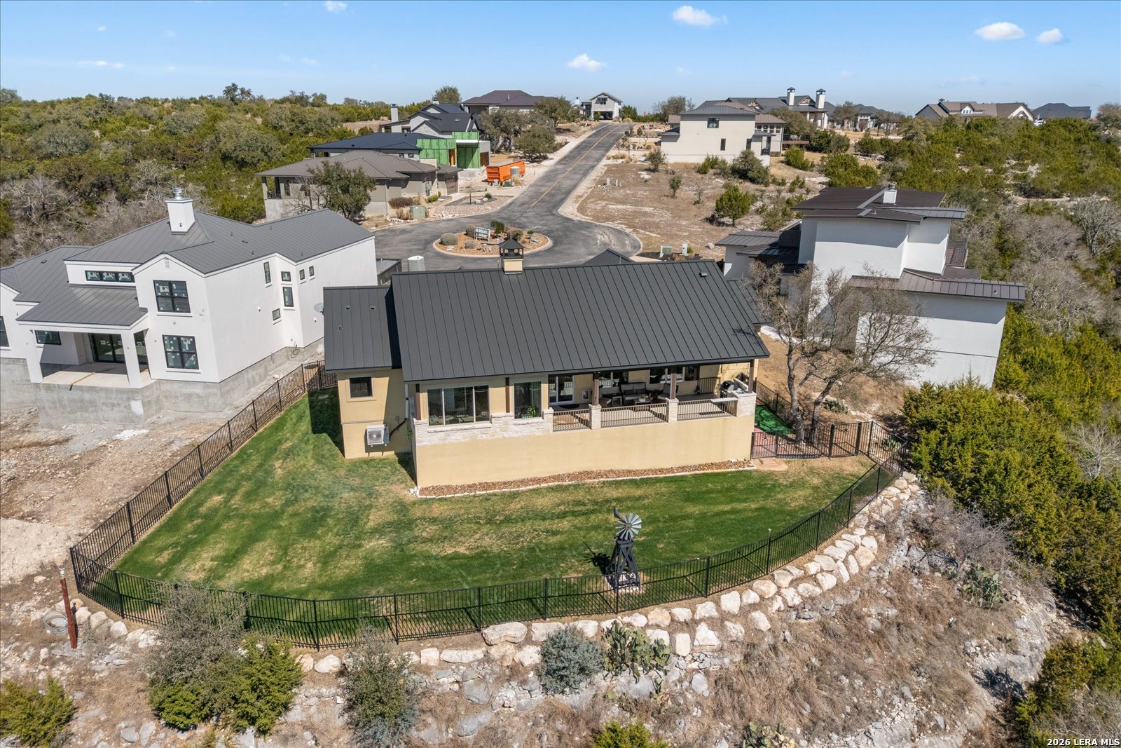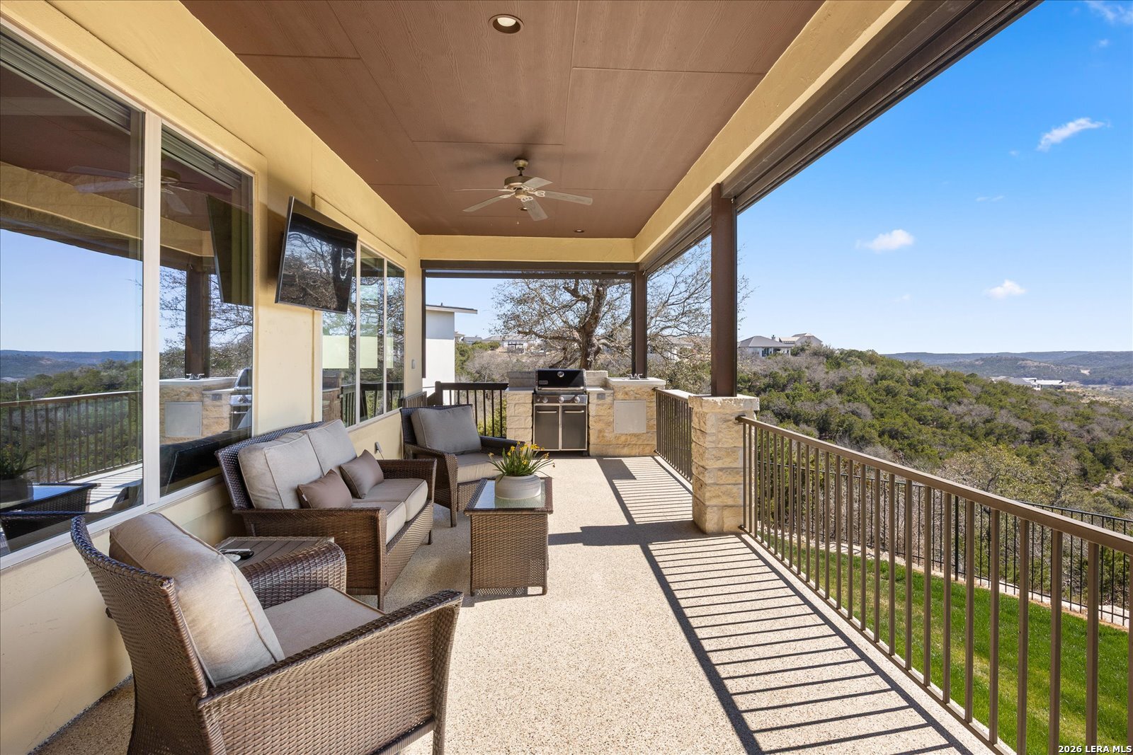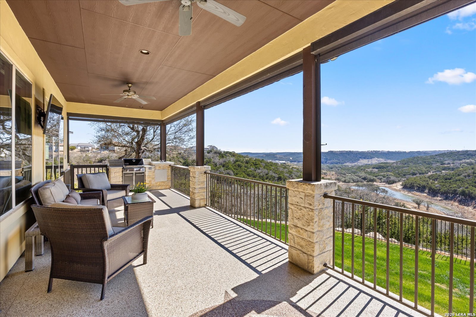 Beautiful one-story Hill Country classic in Highlands of Tapatio, perfectly positioned on a premier .327-acre cul-de-sac lot with a fenced, grassy yard and breathtaking views for miles. The bright and airy eat-in kitchen features a gas cooktop, abundant custom cabinetry, and gorgeous granite countertops-ideal for everyday living and entertaining. Engineered hardwood floors flow throughout, complemented by stunning rock-work and a striking stone fireplace framed by custom built-ins. The combined pantry/utility room is impeccably organized with built-ins and a sliding barn door. The expansive primary suite offers a private sunroom retreat, capturing sweeping unobstructed country views. Step outside to the covered patio complete with grill, sunshades and panoramic scenery-perfect for relaxing evenings or hosting gatherings. Located just four miles from downtown Boerne and one mile from Tapatio Springs Resort, you'll enjoy convenient access to golf, pools, dining, and resort amenities while savoring the privacy and tranquility of this property.