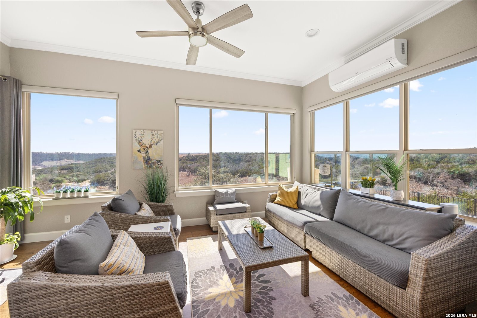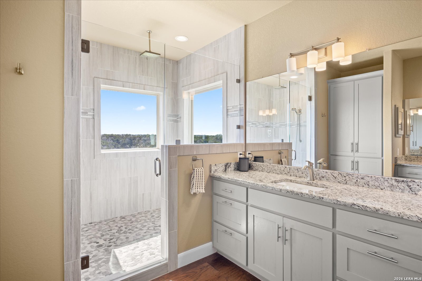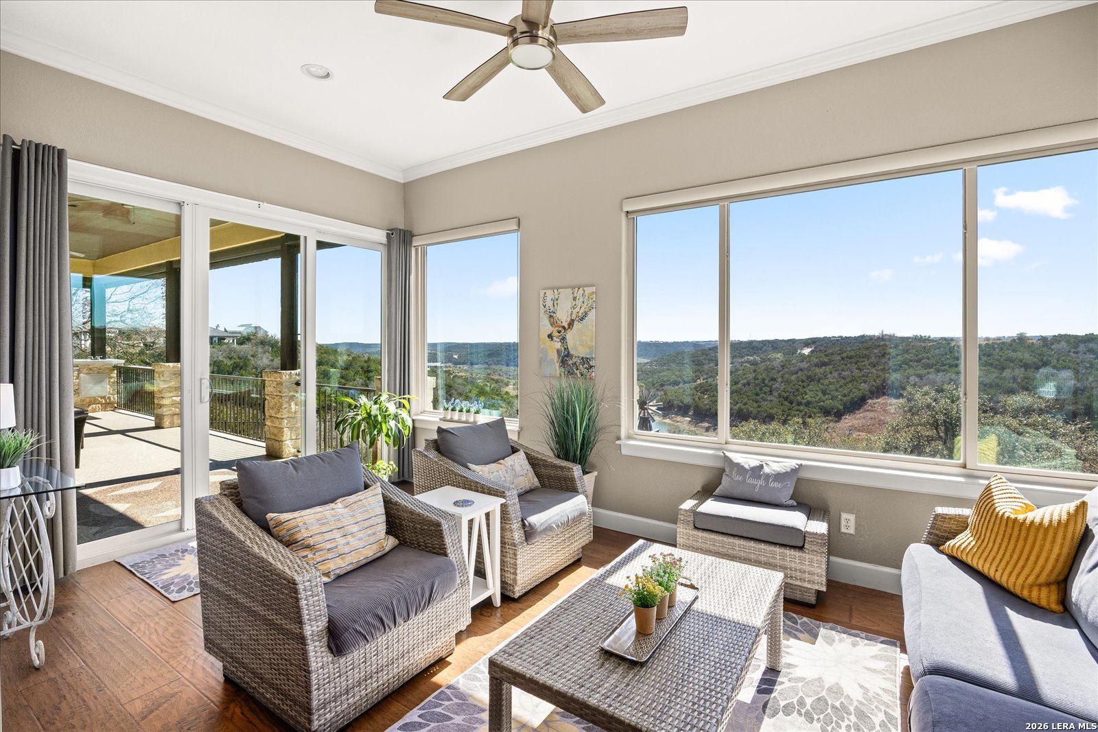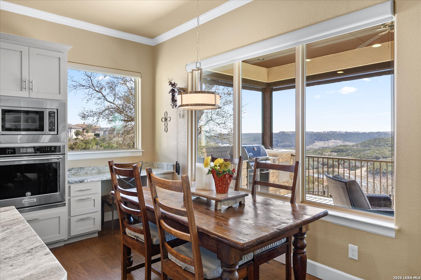 Beautiful one-story Hill Country classic in Highlands of Tapatio, perfectly positioned on a premier .327-acre cul-de-sac lot with a fenced, grassy yard and breathtaking views for miles. The bright and airy eat-in kitchen features a gas cooktop, abundant custom cabinetry, and gorgeous granite countertops-ideal for everyday living and entertaining. Engineered hardwood floors flow throughout, complemented by stunning rock-work and a striking stone fireplace framed by custom built-ins. The combined pantry/utility room is impeccably organized with built-ins and a sliding barn door. The expansive primary suite offers a private sunroom retreat, capturing sweeping unobstructed country views. Step outside to the covered patio complete with grill, sunshades and panoramic scenery-perfect for relaxing evenings or hosting gatherings. Located just four miles from downtown Boerne and one mile from Tapatio Springs Resort, you'll enjoy convenient access to golf, pools, dining, and resort amenities while savoring the privacy and tranquility of this property.