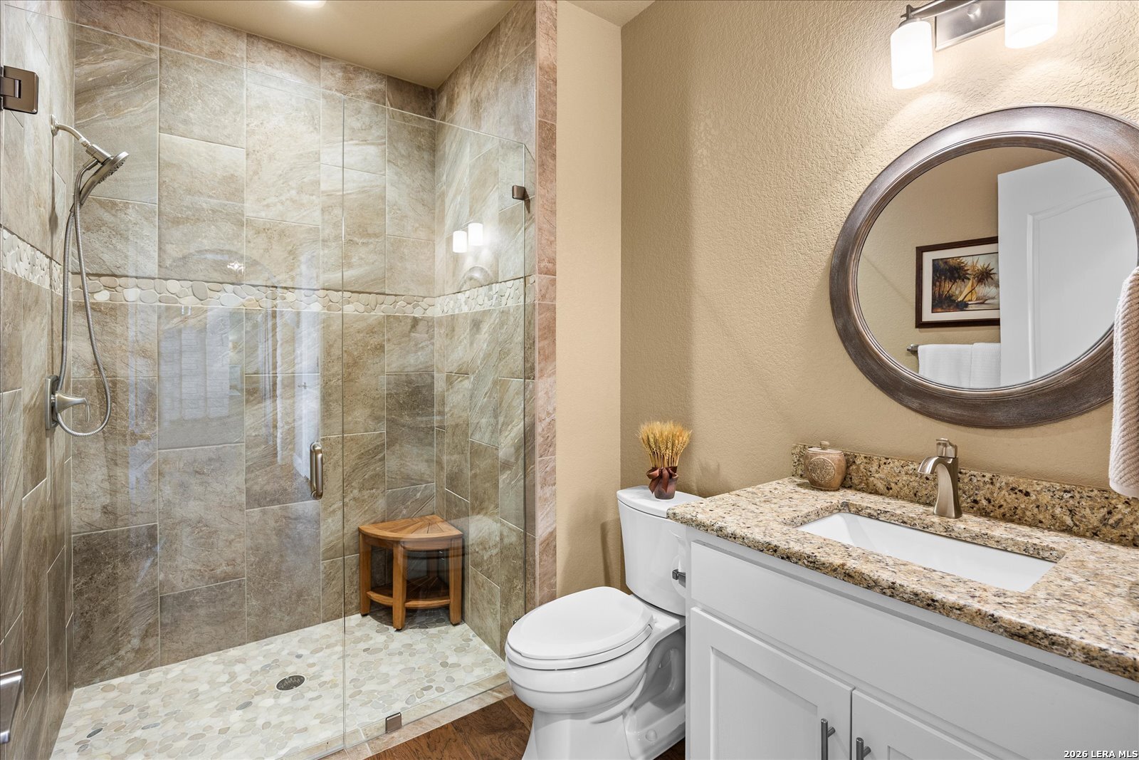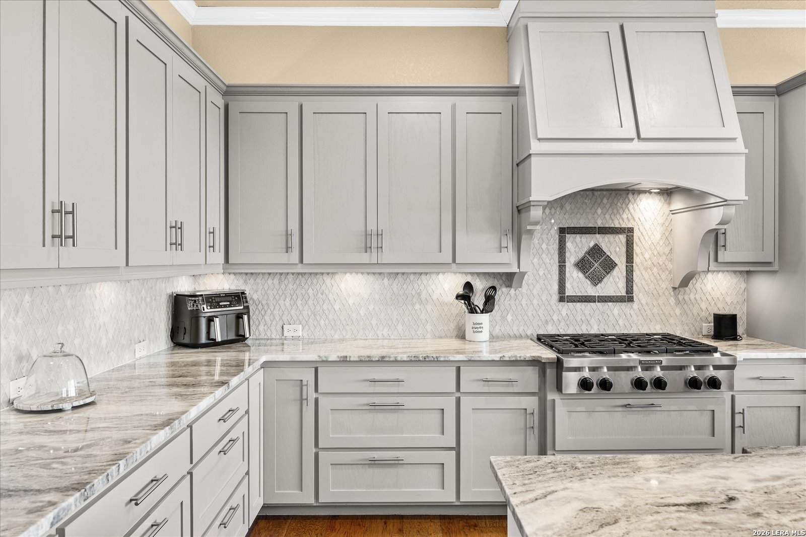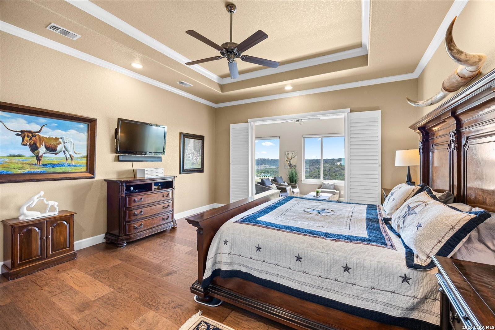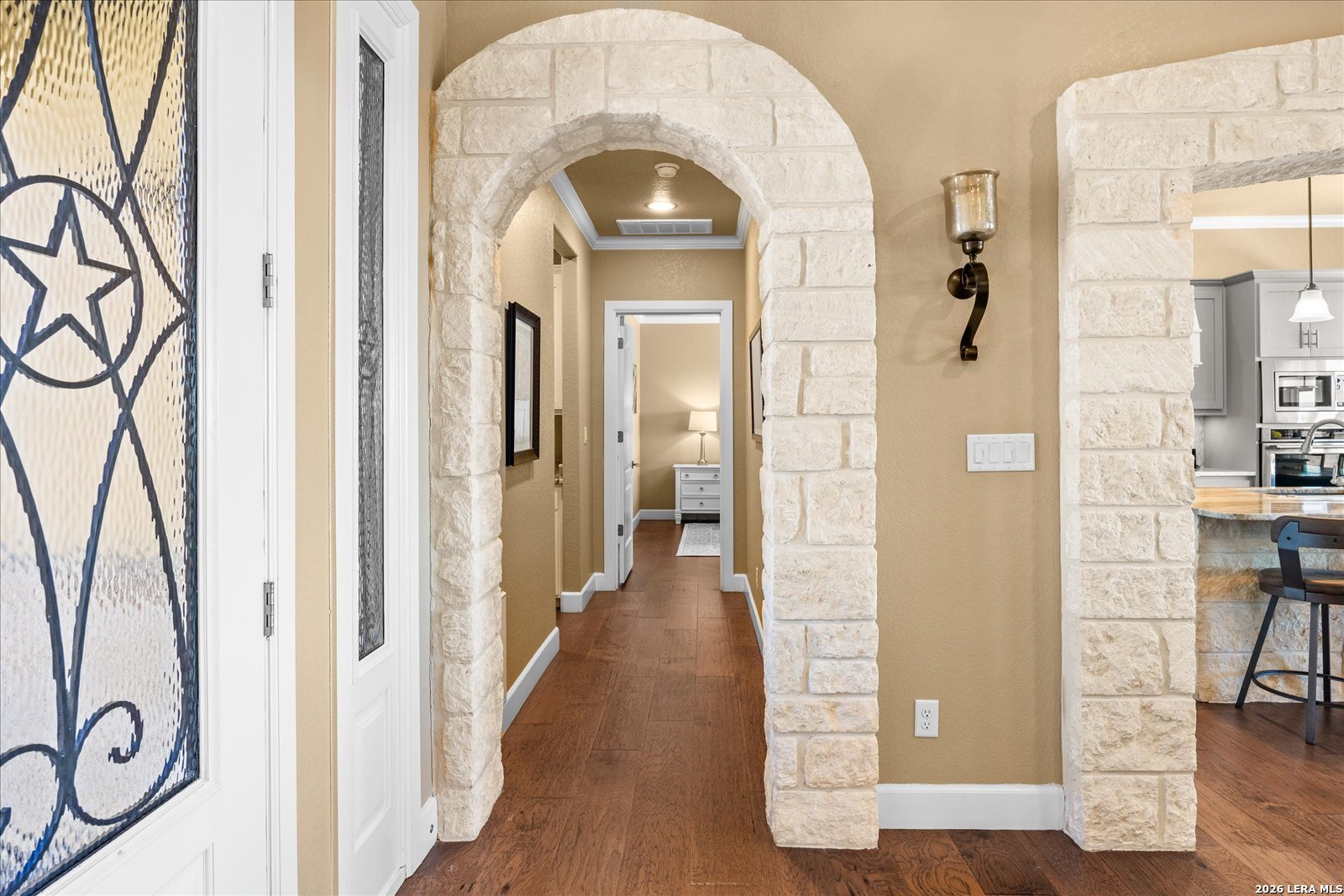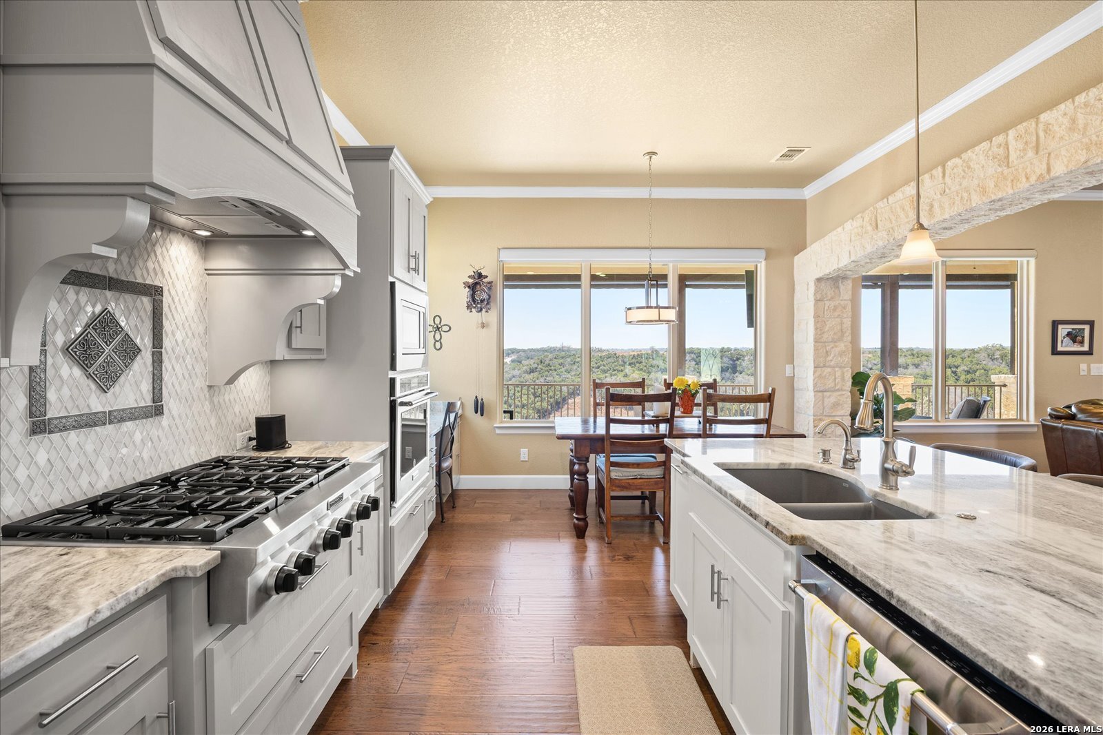 Beautiful one-story Hill Country classic in Highlands of Tapatio, perfectly positioned on a premier .327-acre cul-de-sac lot with a fenced, grassy yard and breathtaking views for miles. The bright and airy eat-in kitchen features a gas cooktop, abundant custom cabinetry, and gorgeous granite countertops-ideal for everyday living and entertaining. Engineered hardwood floors flow throughout, complemented by stunning rock-work and a striking stone fireplace framed by custom built-ins. The combined pantry/utility room is impeccably organized with built-ins and a sliding barn door. The expansive primary suite offers a private sunroom retreat, capturing sweeping unobstructed country views. Step outside to the covered patio complete with grill, sunshades and panoramic scenery-perfect for relaxing evenings or hosting gatherings. Located just four miles from downtown Boerne and one mile from Tapatio Springs Resort, you'll enjoy convenient access to golf, pools, dining, and resort amenities while savoring the privacy and tranquility of this property.