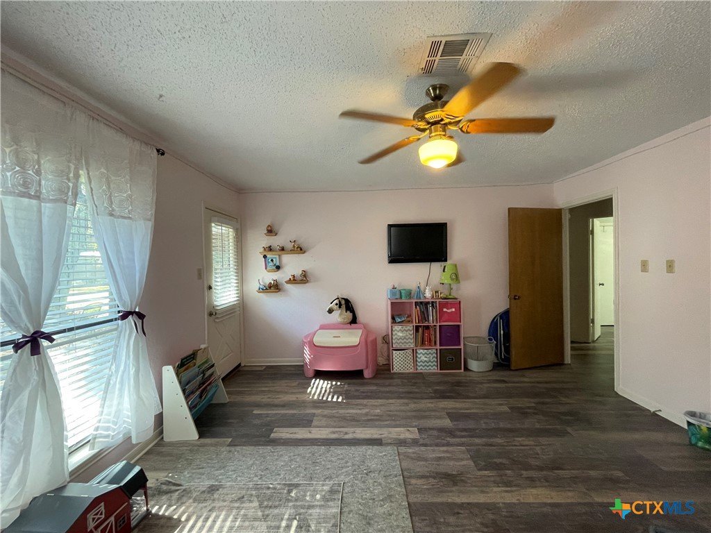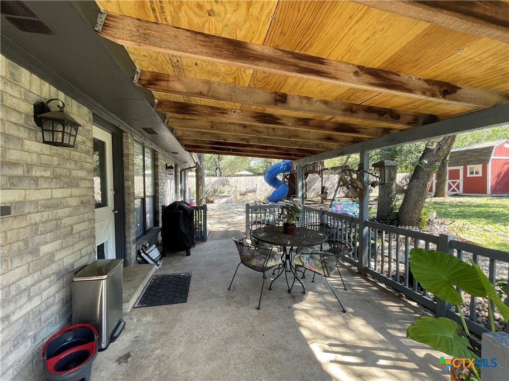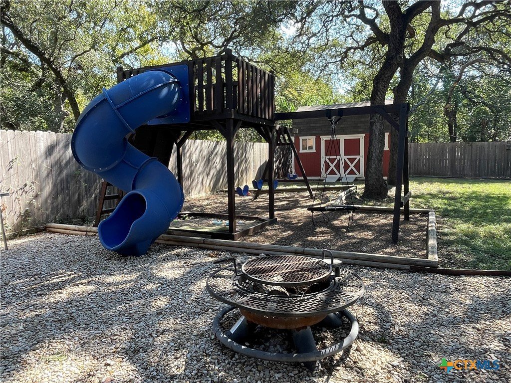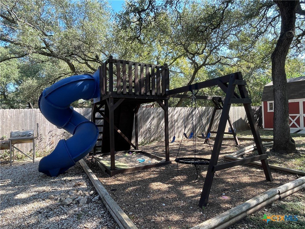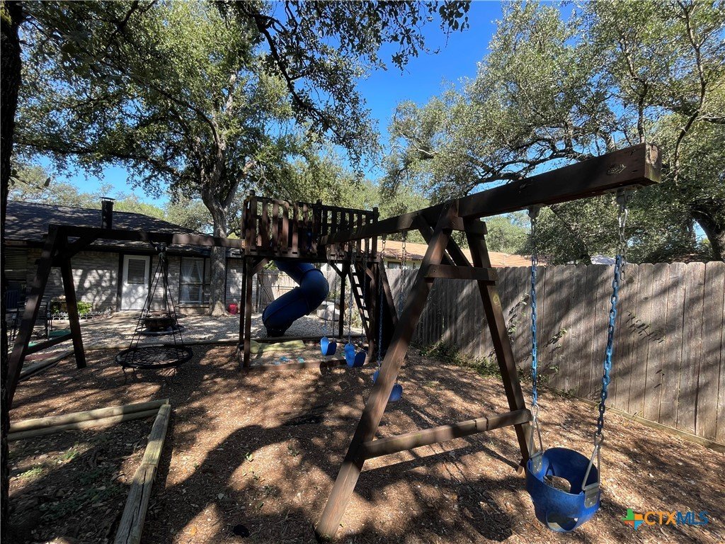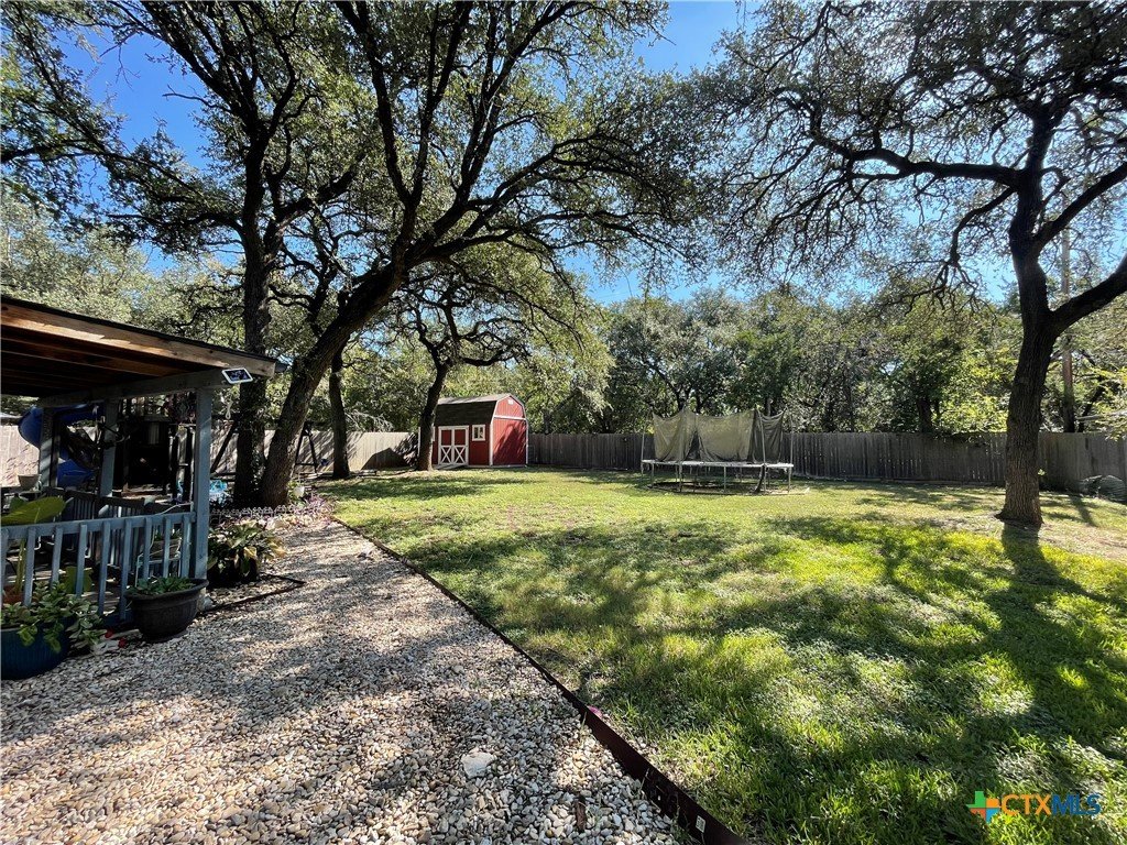 Beautiful well maintained, three bedroom with two bathrooms. Popular split floor plan. The bedroom are a nice size with good closets and ceiling fans. Luxury vinyl flooring except the kitchen and dining room which have ceramic tile. Ship lap walls in the dining room add country charm. The exterior has been painted. Roof, gutters and water heater were replaced about a year ago. The kitchen appliances are four years old. The Two story Tuff storage building is three years old and has a transferable warranty. Mature trees shade the large backyard with a playscape and covered patio for hours of outdoor fun. The playscape is a custom made, the garage is temporarily being used as a fourth bedroom with a mini split AC, still a fully functioning garage.