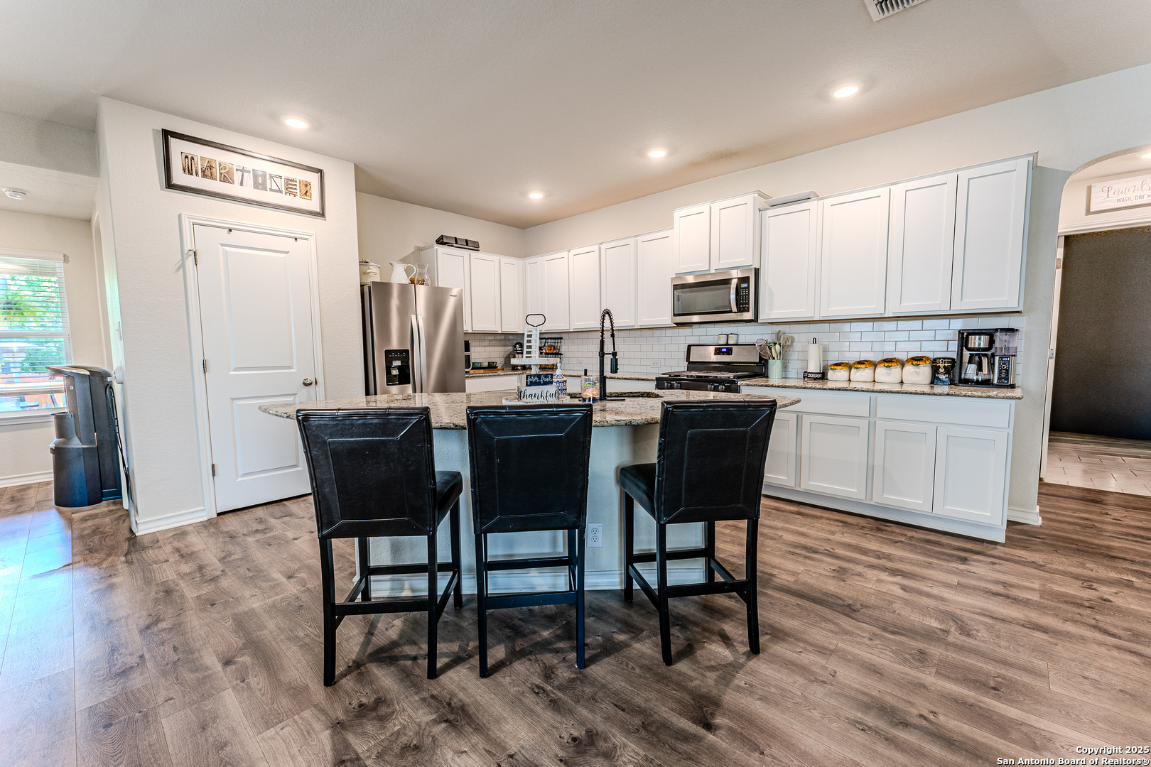 This charming 4-bedroom, 2-bath home was built in 2020 and sits on a peaceful greenbelt in the thriving Alamo Ranch area. Inside you'll find an open floor plan with bright white cabinetry, luxury vinyl plank flooring throughout (no carpet!), and plenty of natural light. Step out to the deck for quiet evenings or weekend entertaining. The neighborhood offers world-class resort-style amenities including a fishing pond, pool, tennis and pickleball courts, fitness center, and playgrounds. With brand-new schools nearby and all the shopping, dining, and services you need within five miles, this location is as convenient as it is comfortable. Pride of ownership shows in every detail! Pet-friendly- schedule your showing today!
